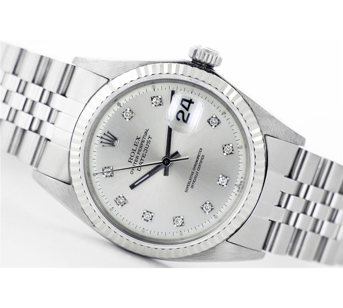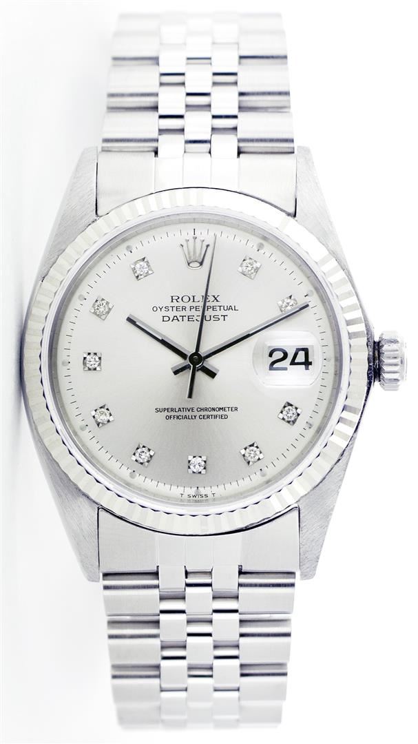 One Mens Rolex Datejust Polished Bright with Satin Finish, Serviced & Electronically Tested, Stainless Steel Case:36mm, Stainless Steel Crown, Original Bezel: 14K White Gold Fluted Bezel. Custom Crystal: Synthetic Sapphire Cyclops Lens. Movement: Automatic Winding Movement Caliber 3035. Custom Dial: Silver Dial With Diamond Hour Markers, 10 Diamond in Dial G To H In Color, Si-VS Clarity. Date Window: 3 O'Clock Position Date Display, Quickset, Model: 16014 Condition: G-6 Extra Fine. Bracelet: Stainless Steel Jubilee. Bright Polish & Satin Finish. 6.5 Inch Length, Adjustable. Standard Clasp, With Rolex Logo.