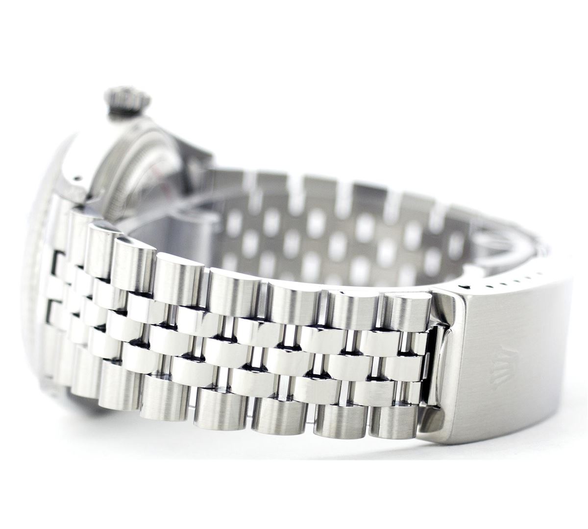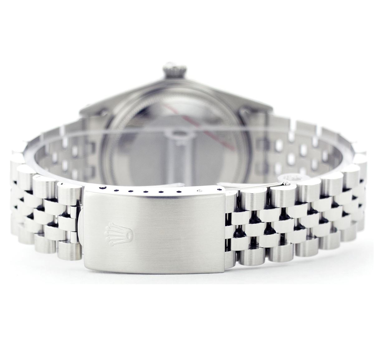 One Mens Rolex Datejust Polished Bright with Satin Finish, Serviced & Electronically Tested, Stainless Steel Case:36mm, Stainless Steel Crown, Original Bezel: 14K White Gold Fluted Bezel. Custom Crystal: Synthetic Sapphire Cyclops Lens. Movement: Automatic Winding Movement Caliber 3035. Custom Dial: Silver Dial With Diamond Hour Markers, 10 Diamond in Dial G To H In Color, Si-VS Clarity. Date Window: 3 O'Clock Position Date Display, Quickset, Model: 16014 Condition: G-6 Extra Fine. Bracelet: Stainless Steel Jubilee. Bright Polish & Satin Finish. 6.5 Inch Length, Adjustable. Standard Clasp, With Rolex Logo.