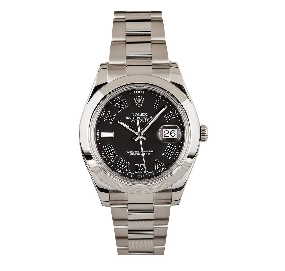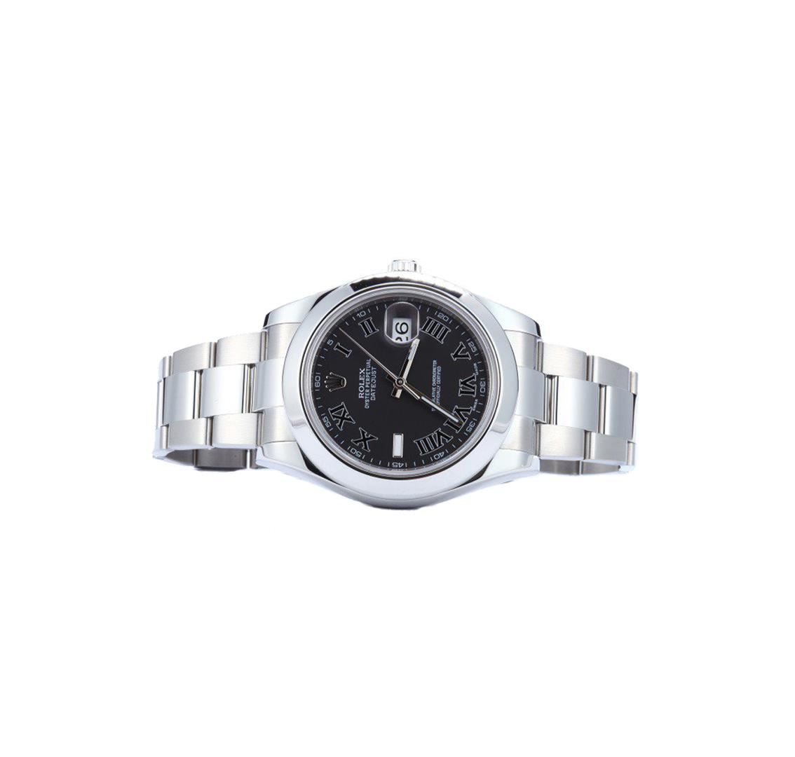 One gents stainless steel Rolex DateJust wristwatch. Model Name/Number: Datejust 116300. The watch features automatic movement with date, quickset, scratch-resistant sapphire crystal, waterproof screw-down crown. Case: Stainless steel with smooth bezel (41 mm), inner reflector ring engraved with serial number. Dial: Black with Roman numeral hour markers. Bracelet: Stainless Steel Oyster.