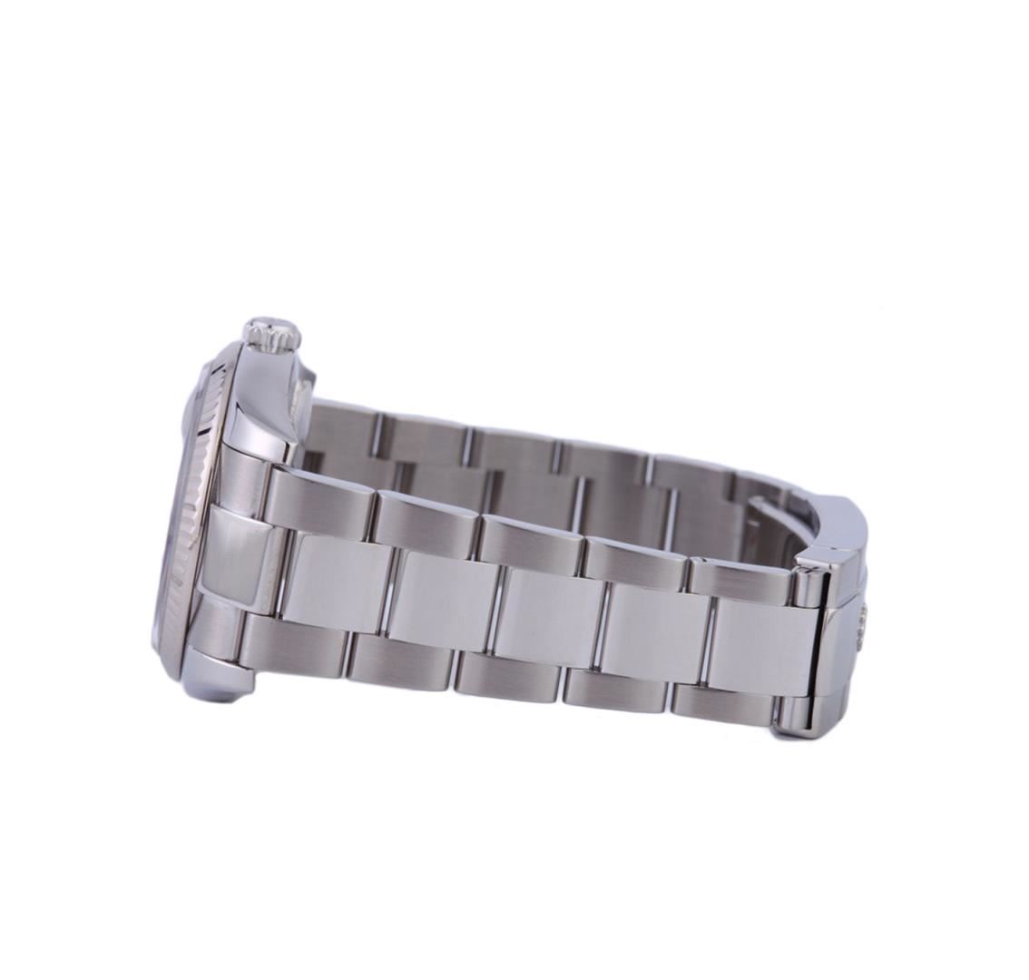 One gents stainless steel Rolex DateJust wristwatch. Model Name/Number: DateJust 116234. The watch features automatic movement with date, scratch-resistant sapphire crystal, waterproof screw-down crown. Case: Stainless steel with 18k white gold fluted bezel (36mm). Dial: Black Index with white chapter ring. Bracelet: Stainless steel Oyster.