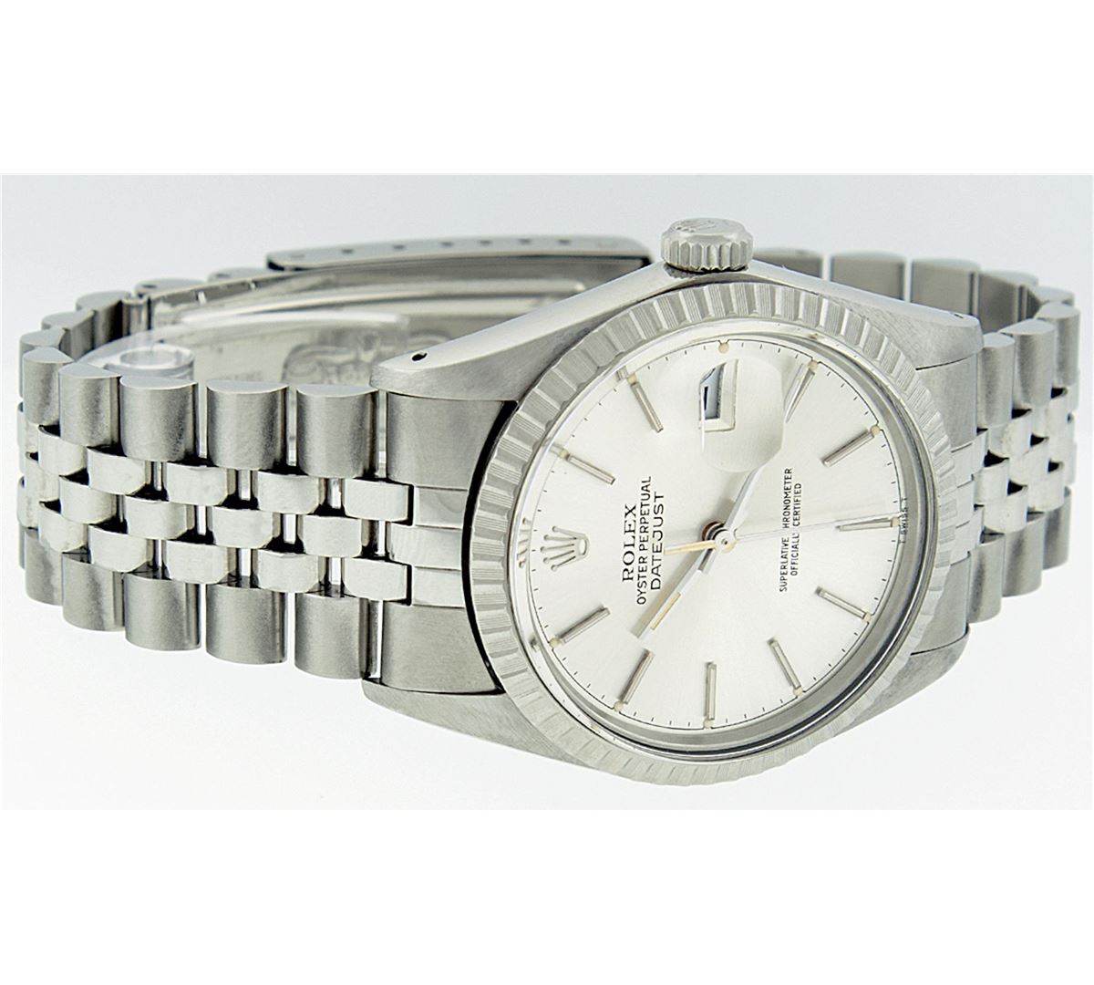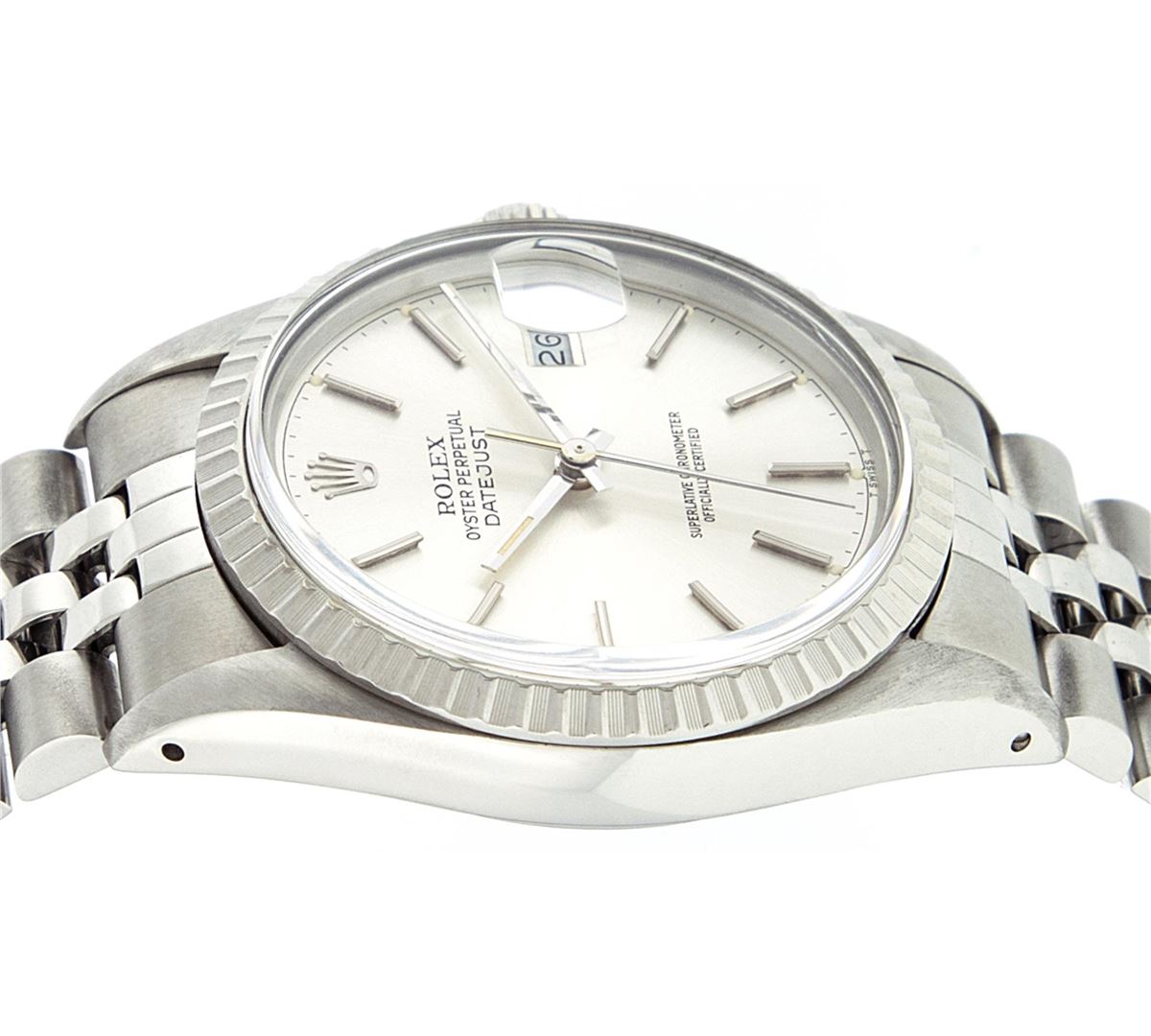 One Gents Rolex Datejust Polished, Serviced & Electronically Tested, Stainless Steel Case:36mm, Stainless Steel Crown, Bezel: 18K White Gold Fluted Bezel. Custom Crystal: Acrylic Cyclops Lens. Movement: Automatic Winding Movement Caliber 3035. Dial: Silver Index With Lumi Dots And Circle Line Track. Date Window: 3 O'Clock Position Date Display, Quickset, Model: Datejust Condition: G-6 Extra Fine. Bracelet: Stainless Steel Jubilee. Bright Polish & Satin Finish. 7 Inch Length, Adjustable. Standard Clasp, With Rolex Logo.