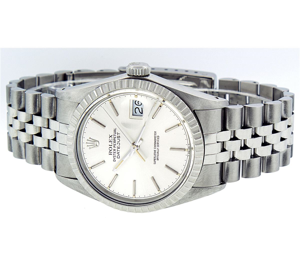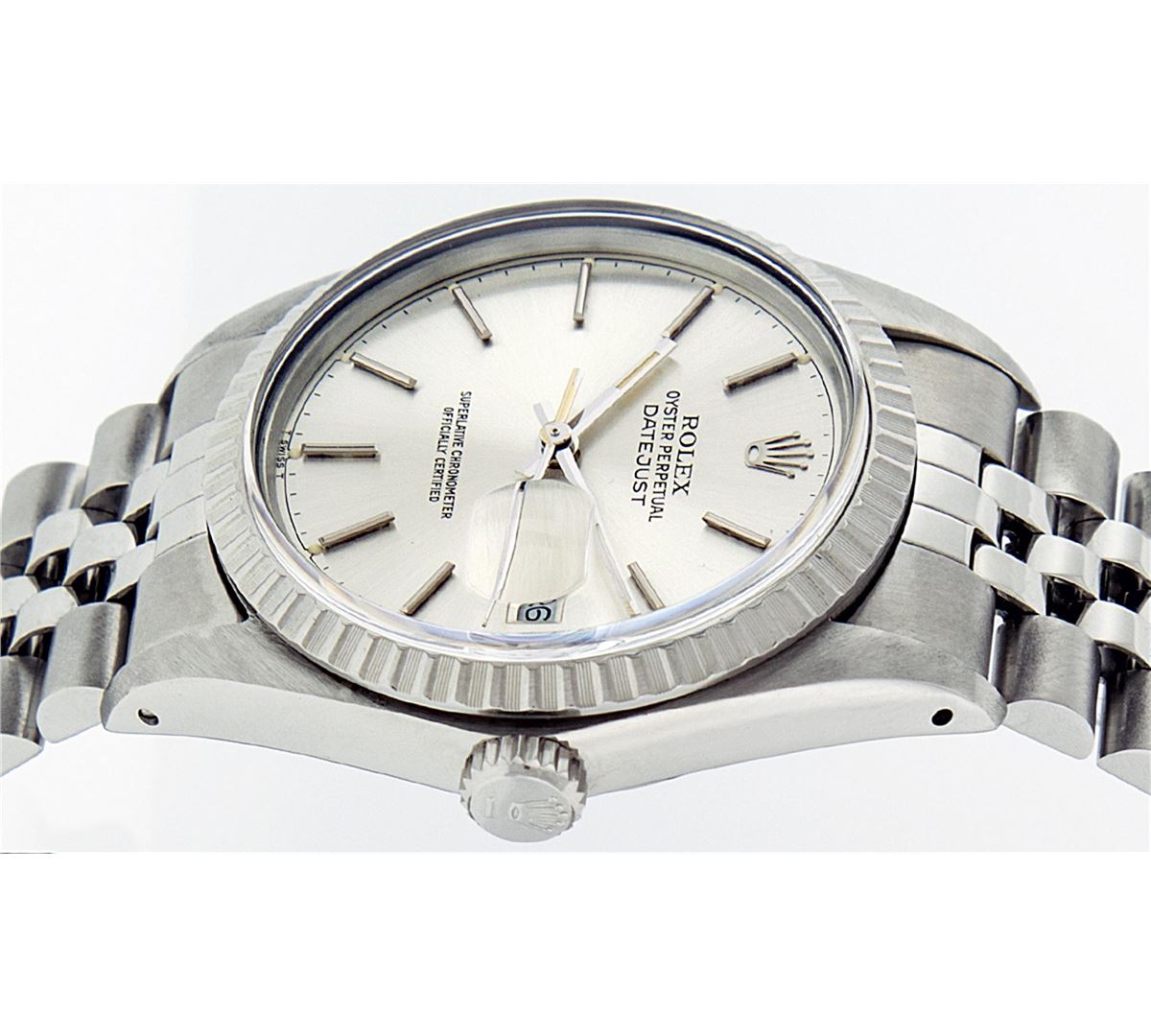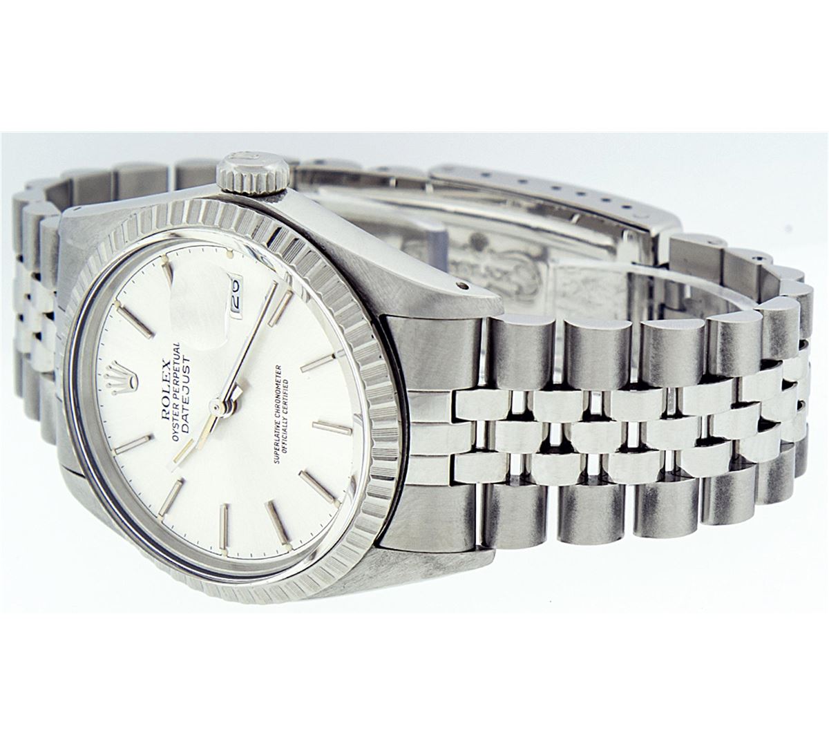 One Gents Rolex Datejust Polished, Serviced & Electronically Tested, Stainless Steel Case:36mm, Stainless Steel Crown, Bezel: 18K White Gold Fluted Bezel. Custom Crystal: Acrylic Cyclops Lens. Movement: Automatic Winding Movement Caliber 3035. Dial: Silver Index With Lumi Dots And Circle Line Track. Date Window: 3 O'Clock Position Date Display, Quickset, Model: Datejust Condition: G-6 Extra Fine. Bracelet: Stainless Steel Jubilee. Bright Polish & Satin Finish. 7 Inch Length, Adjustable. Standard Clasp, With Rolex Logo.