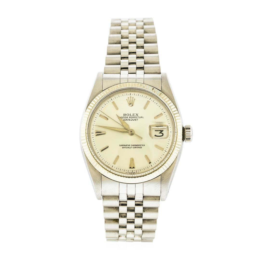 One gents, hand crafted & machine milled Stainless Steel Vintage Rolex DateJust wristwatch electronically tested, Case: 36mm oyster, Crown: twinlock with logo, 14KT White Gold Bezel: engine turned, Custom Crystal: acrylic cyclops lens, Circa: 1946.Movement: Rolex superlative chronometer, Rolex signed Dial: Silver, color, hands and raised indices, Calendar: 3 o'clock position non-quick set, Bracelet: stainless steel jubilee link, Condition: G-4 Average. Bright polish finish and brushed finish. Eight and one quarter inch length adjustable. Standard Rolex clasp, with logo. Total Weight of Watch 88.78gm. AIG Appraised at $4,880.00.