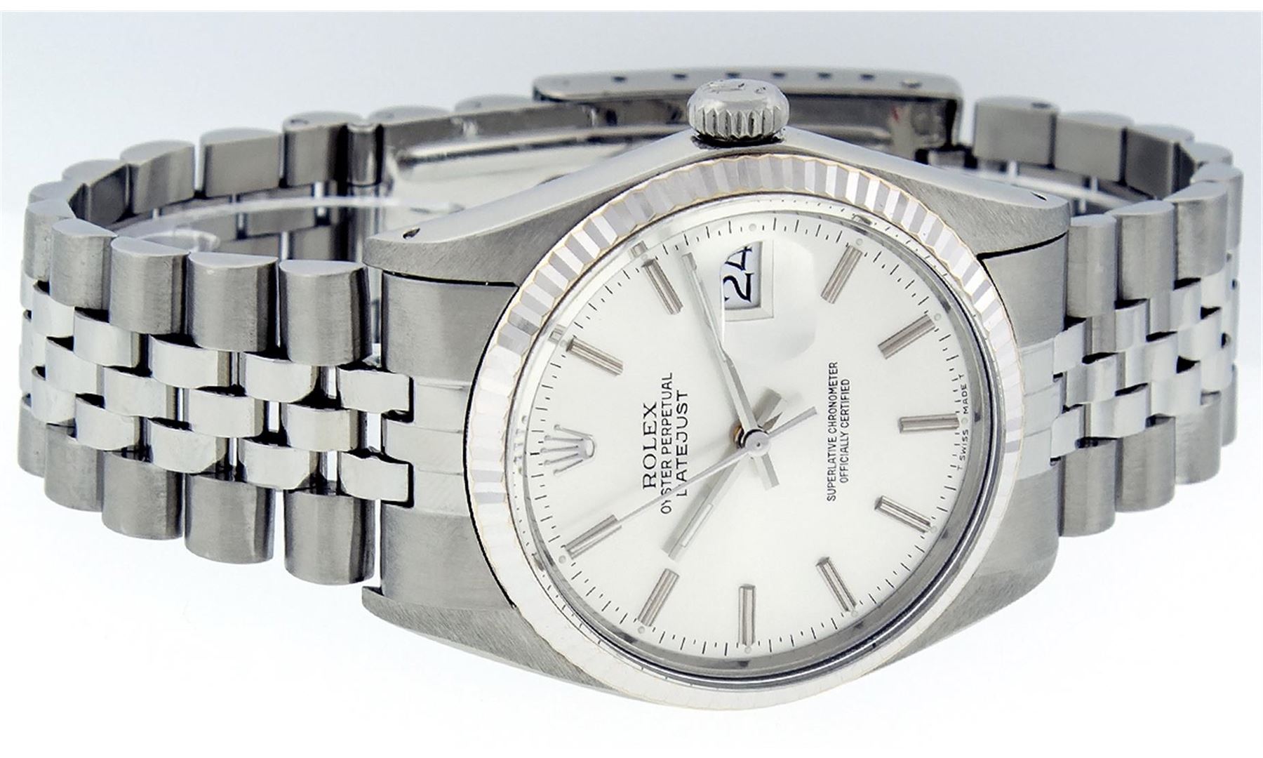 One Gents Rolex Datejust Polished, Serviced & Electronically Tested, Stainless Steel Case:36mm, Stainless Steel Crown, Bezel: 14K White Gold Fluted Bezel. Custom Crystal: Acrylic Cyclops Lens. Movement: Automatic Winding Movement Caliber 3035. Dial: Silver Index With Lumi Dots and Line Track. Date Window: 3 O'Clock Position Date Display, Quickset, Model: Datejust Condition: G-6 Extra Fine The Watch Is In Very Good Condition Free Of All Scratches And Dents. Bracelet: Stainless Steel Jubilee. Bright Polish & Satin Finish. 7 Inch Length, Adjustable. Standard Clasp, With Rolex Logo. Comes with 6 month warranty.