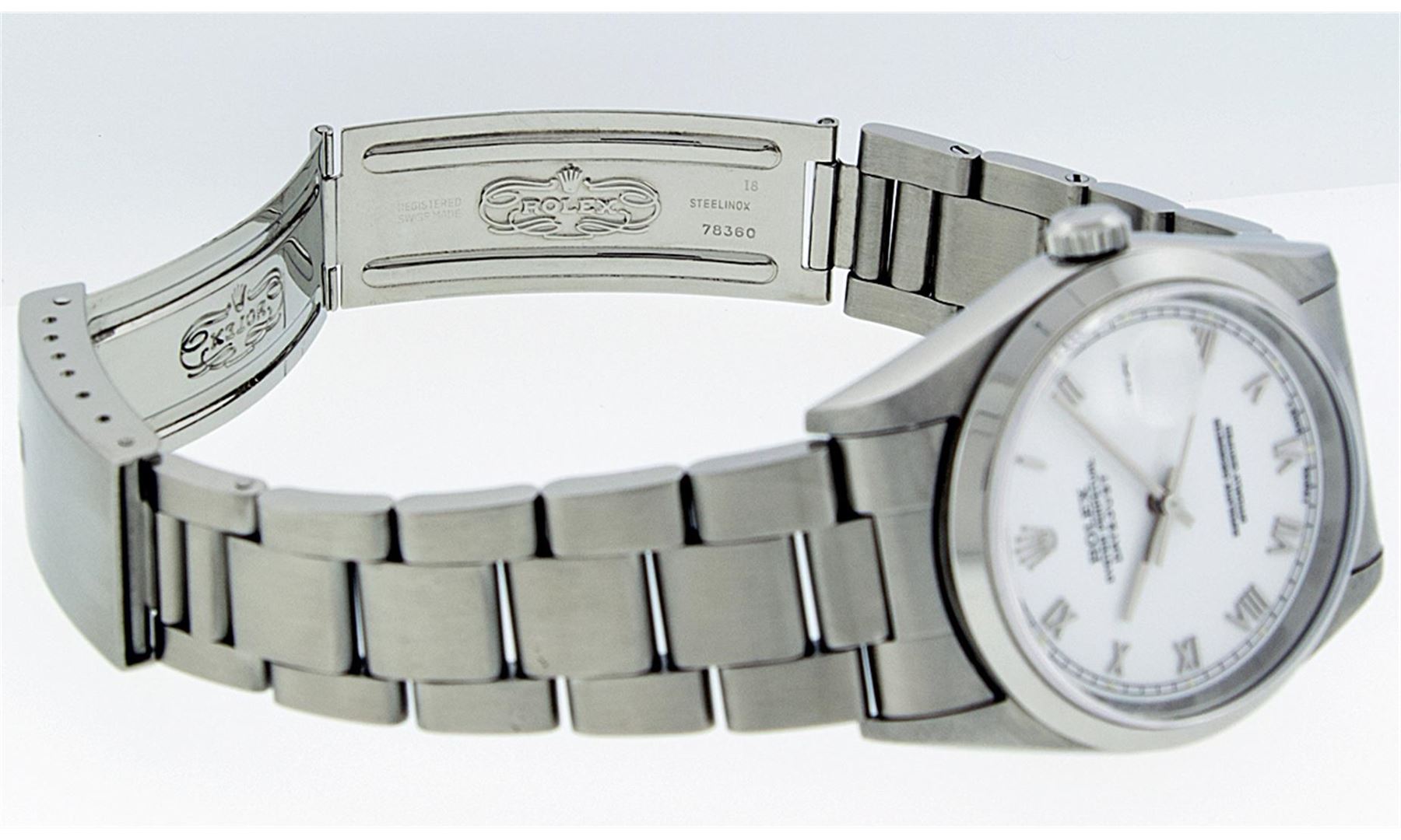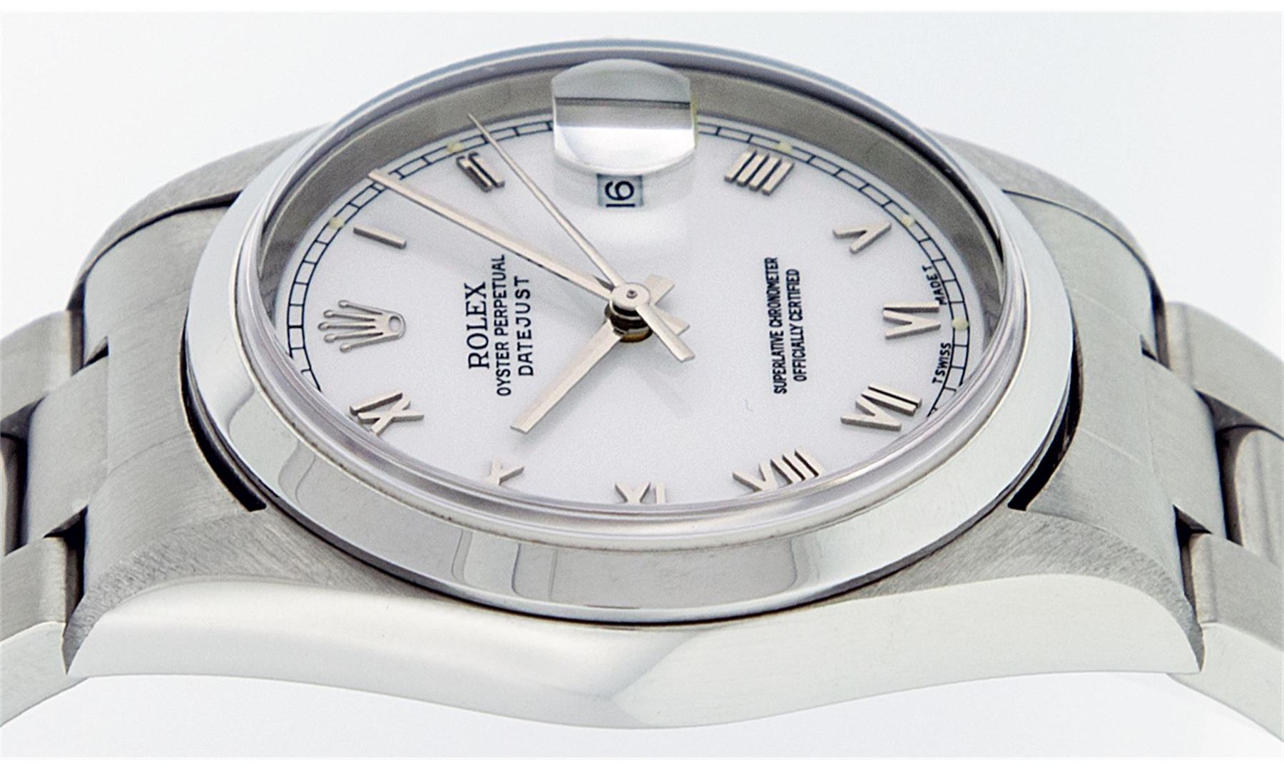 One Gents Rolex Stainless Steel Datejust Polished Bright with Satin Finish, Serviced & Electronically Tested, Stainless Steel Case: 36mm, Stainless Steel Crown, Bezel: Stainless Steel Smooth Bezel. Crystal: Synthetic Sapphire Cyclops Lens. Movement: Automatic Winding Movement Caliber 3135. Custom Dial: White Roman Dial With Square Roman Track & Lumi Dots. Date Window: 3 O'Clock Position Date Display, Quickset, Model: Quickset Datejust. Condition: G-6 Extra Fine. Bracelet: Stainless Steel Oyster Band. Bright Polish & Satin Finish. 7.0 Inch Length, Adjustable. Standard Clasp, With Rolex Logo. Comes with 6 month warranty.