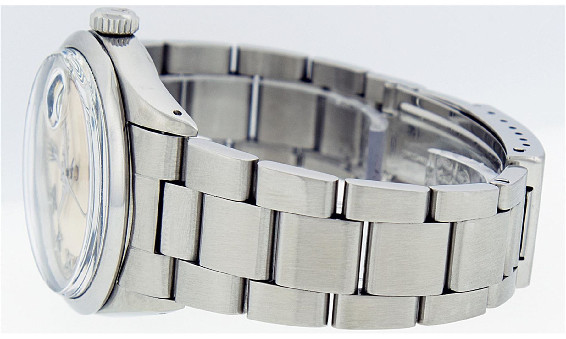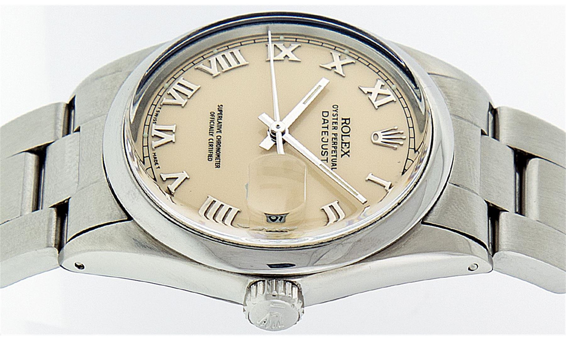One Gents Rolex Stainless Steel Datejust Polished Bright with Satin Finish, Serviced & Electronically Tested, Stainless Steel Case: 36mm, Stainless Steel Crown, Bezel: Stainless Steel Smooth Bezel. Crystal: Synthetic Sapphire Cyclops Lens. Movement: Automatic Winding Movement Caliber 3135. Dial: Cream Roman Dial. Date Window: 3 O'Clock Position Date Display, Quickset, Model: Datejust. Condition: G-6 Extra Fine. Bracelet: Stainless Steel Oyster Band. Bright Polish & Satin Finish. 7.0 Inch Length, Adjustable. Standard Clasp, With Rolex Logo. Comes with 6 month warranty.