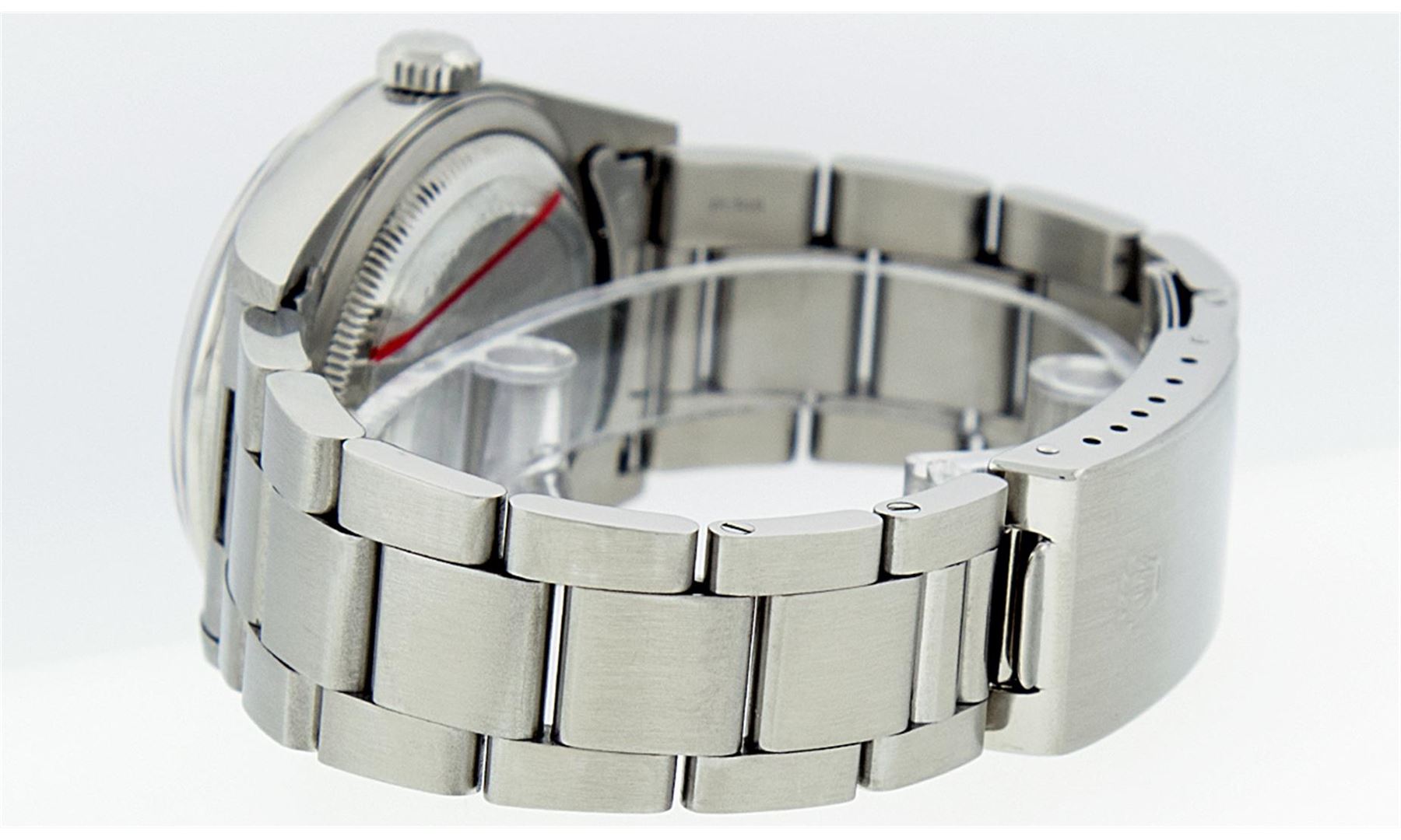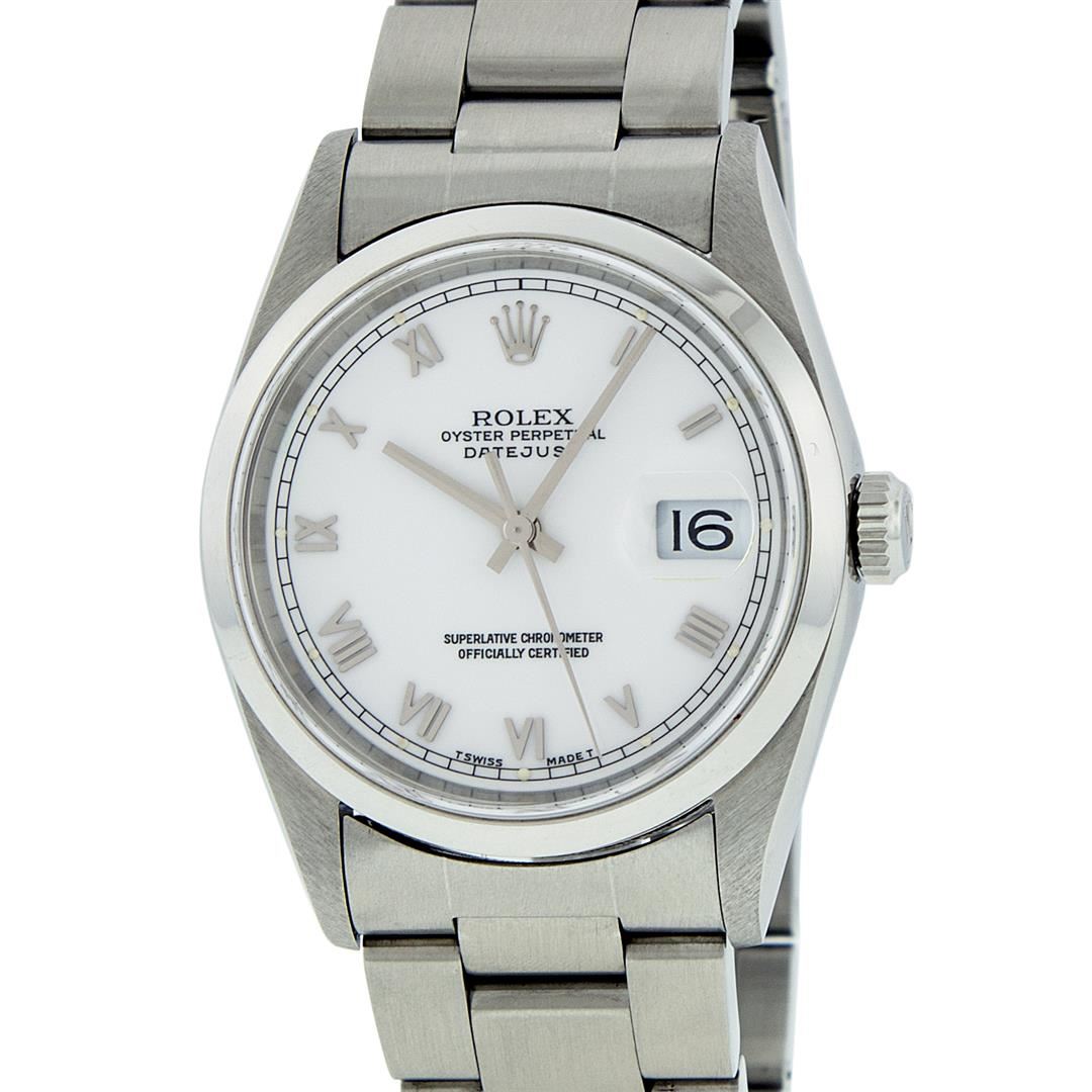 One Gents Rolex Stainless Steel Datejust Polished Bright with Satin Finish, Serviced & Electronically Tested, Stainless Steel Case: 36mm, Stainless Steel Crown, Bezel: Stainless Steel Smooth Bezel. Crystal: Synthetic Sapphire Cyclops Lens. Movement: Automatic Winding Movement Caliber 3135. Custom Dial: White Roman Dial With Square Roman Track & Lumi Dots. Date Window: 3 O'Clock Position Date Display, Quickset, Model: Quickset Datejust. Condition: G-6 Extra Fine. Bracelet: Stainless Steel Oyster Band. Bright Polish & Satin Finish. 7.0 Inch Length, Adjustable. Standard Clasp, With Rolex Logo. Comes with 6 month warranty.