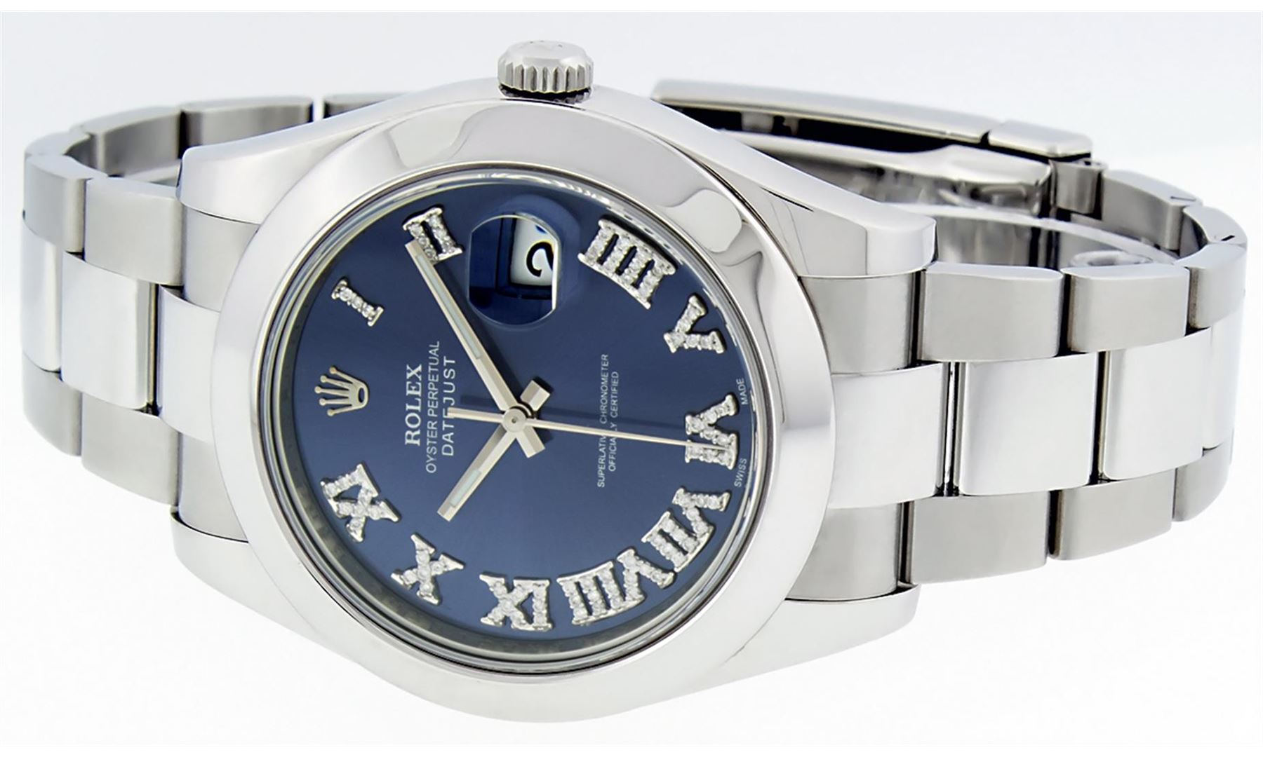One Mens Rolex Datejust 2 Polished With Shiny Finish, Serviced & Electronically Tested, Stainless Steel Case:41mm, Stainless Steel Crown, Bezel: Stainless Steel Smooth Bezel, . Crystal: Synthetic Sapphire Cyclops Lens. Movement: Automatic Winding Movement Caliber 3136. Custom Dial: Blue Roman Diamond Dial, Diamond Color: G To H, Clarity: SI-VS. Date Window: 3 O'Clock Position Date Display, Quickset, Model: 116300 Datejust 2. Condition: G-6 Extra Fine The Watch Is In Very Good Condition Free Of All Scratches And Dents. Bracelet: Stainless Steel Oyster Band. Bright Polish & Satin Finish. 7.5 Inch Length, Adjustable. Standard Clasp, With Rolex Logo. Comes with 6 month warranty.