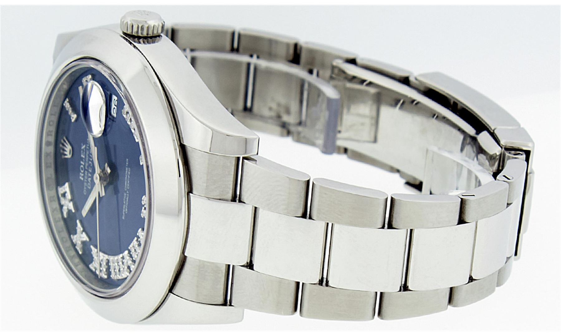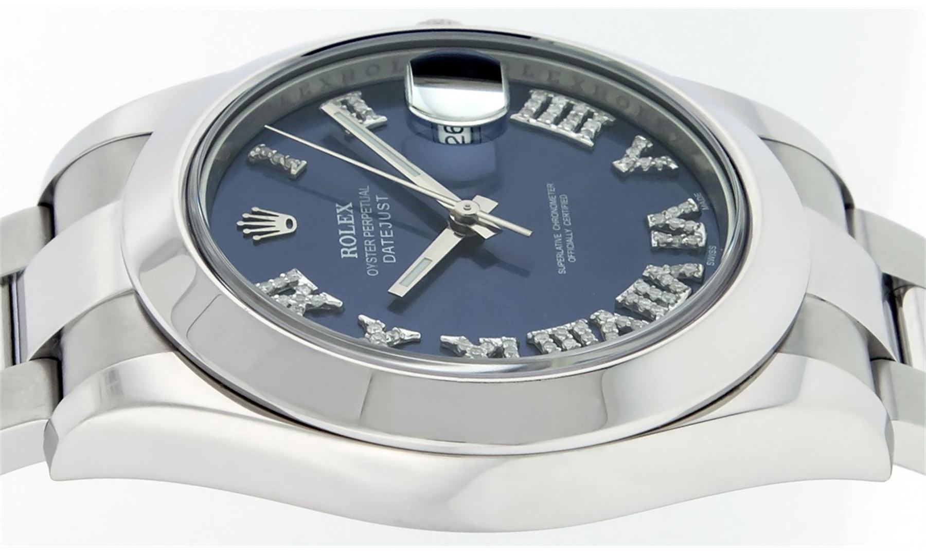 One Mens Rolex Datejust 2 Polished With Shiny Finish, Serviced & Electronically Tested, Stainless Steel Case:41mm, Stainless Steel Crown, Bezel: Stainless Steel Smooth Bezel, . Crystal: Synthetic Sapphire Cyclops Lens. Movement: Automatic Winding Movement Caliber 3136. Custom Dial: Blue Roman Diamond Dial, Diamond Color: G To H, Clarity: SI-VS. Date Window: 3 O'Clock Position Date Display, Quickset, Model: 116300 Datejust 2. Condition: G-6 Extra Fine The Watch Is In Very Good Condition Free Of All Scratches And Dents. Bracelet: Stainless Steel Oyster Band. Bright Polish & Satin Finish. 7.5 Inch Length, Adjustable. Standard Clasp, With Rolex Logo. Comes with 6 month warranty.