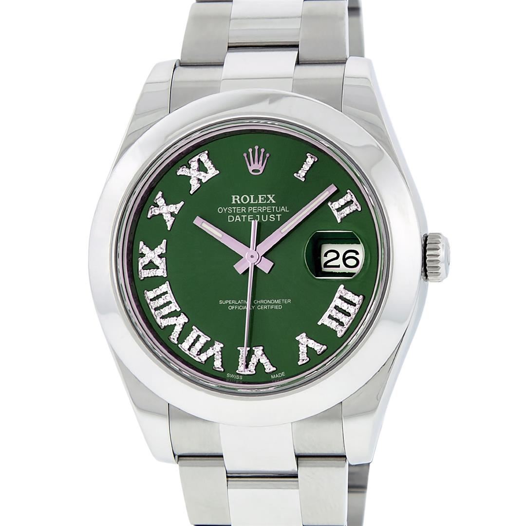One Mens Rolex Datejust 2 Polished Bright with Shiny Finish, Serviced & Electronically Tested, Stainless Steel Case:41mm, Stainless Steel Crown, Bezel: Stainless Steel Smooth Bezel, . Crystal: Synthetic Sapphire Cyclops Lens. Movement: Automatic Winding Movement Caliber 3136. Custom Dial: Green Roman Diamond Dial, Diamond Color: G To H, Clarity: SI-VS. Date Window: 3 O'Clock Position Date Display, Quickset, Model: 116300 Datejust 2. Condition: G-6 Extra Fine The Watch Is In Very Good Condition Free Of All Scratches And Dents. Bracelet: Stainless Steel Oyster Band. Bright Polish & Satin Finish. 7.5 Inch Length, Adjustable. Standard Clasp, With Rolex Logo. Comes with 6 month warranty.