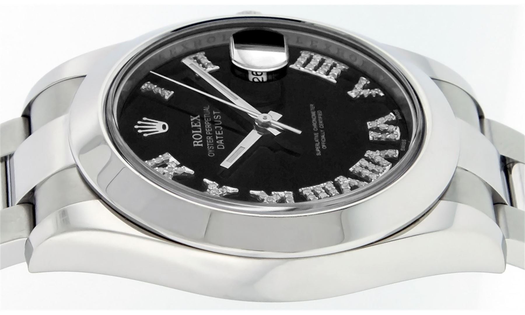One Mens Rolex Datejust 2 Polished With Shiny Finish, Serviced & Electronically Tested, Stainless Steel Case:41mm, Stainless Steel Crown, Bezel: Stainless Steel Smooth Bezel, . Crystal: Synthetic Sapphire Cyclops Lens. Movement: Automatic Winding Movement Caliber 3136. Custom Dial: Black Roman Diamond Dial, Diamond Color: G To H, Clarity: SI-VS. Date Window: 3 O'Clock Position Date Display, Quickset, Model: 116300 Datejust 2. Condition: G-6 Extra Fine The Watch Is In Very Good Condition Free Of All Scratches And Dents. Bracelet: Stainless Steel Oyster Band. Bright Polish & Satin Finish. 7.5 Inch Length, Adjustable. Standard Clasp, With Rolex Logo. Comes with 6 month warranty.