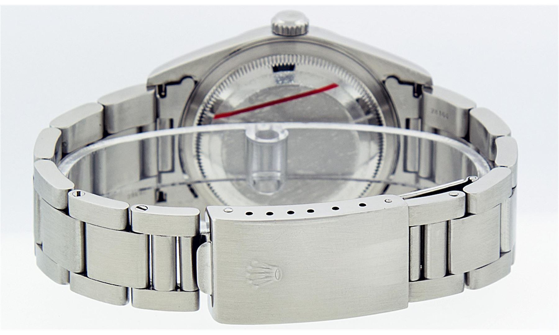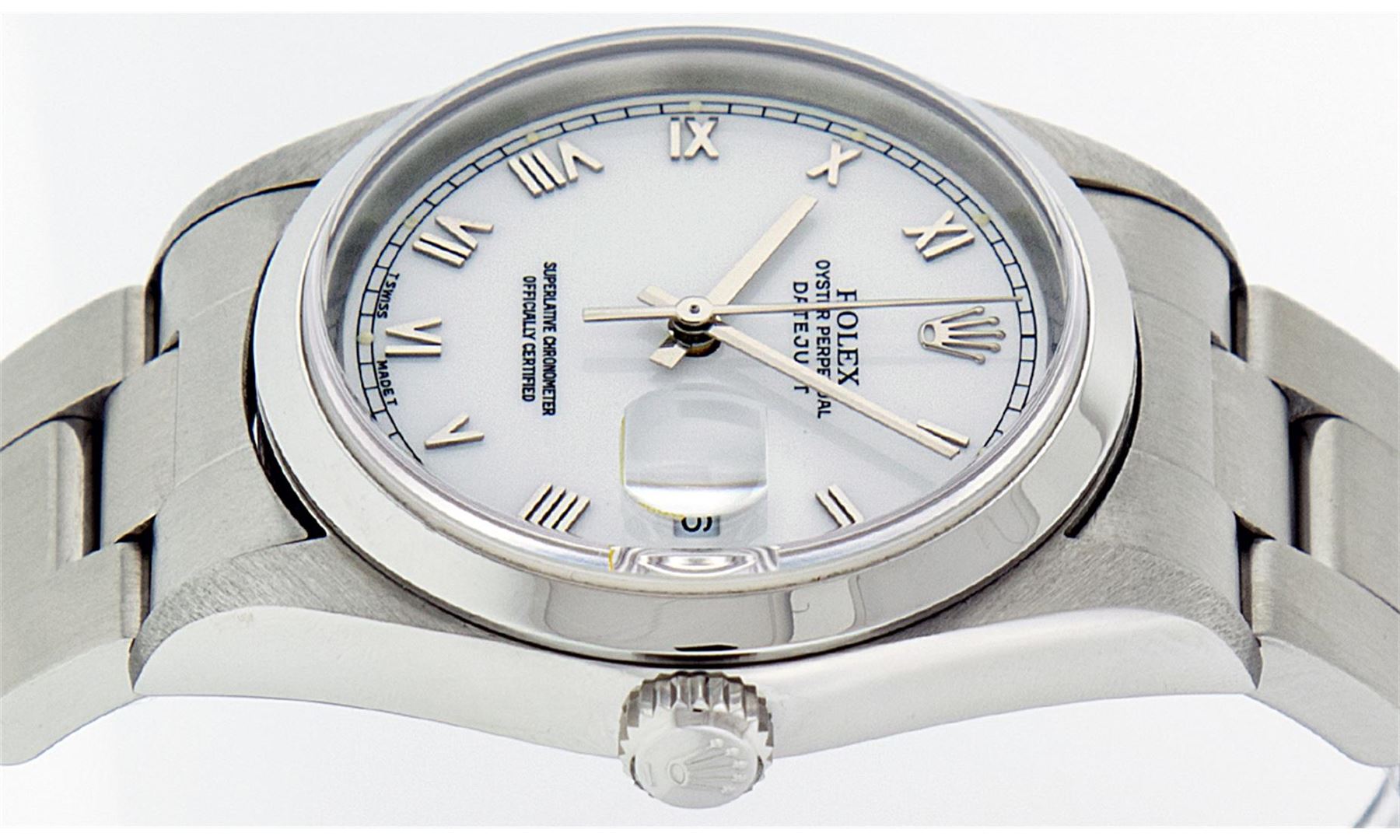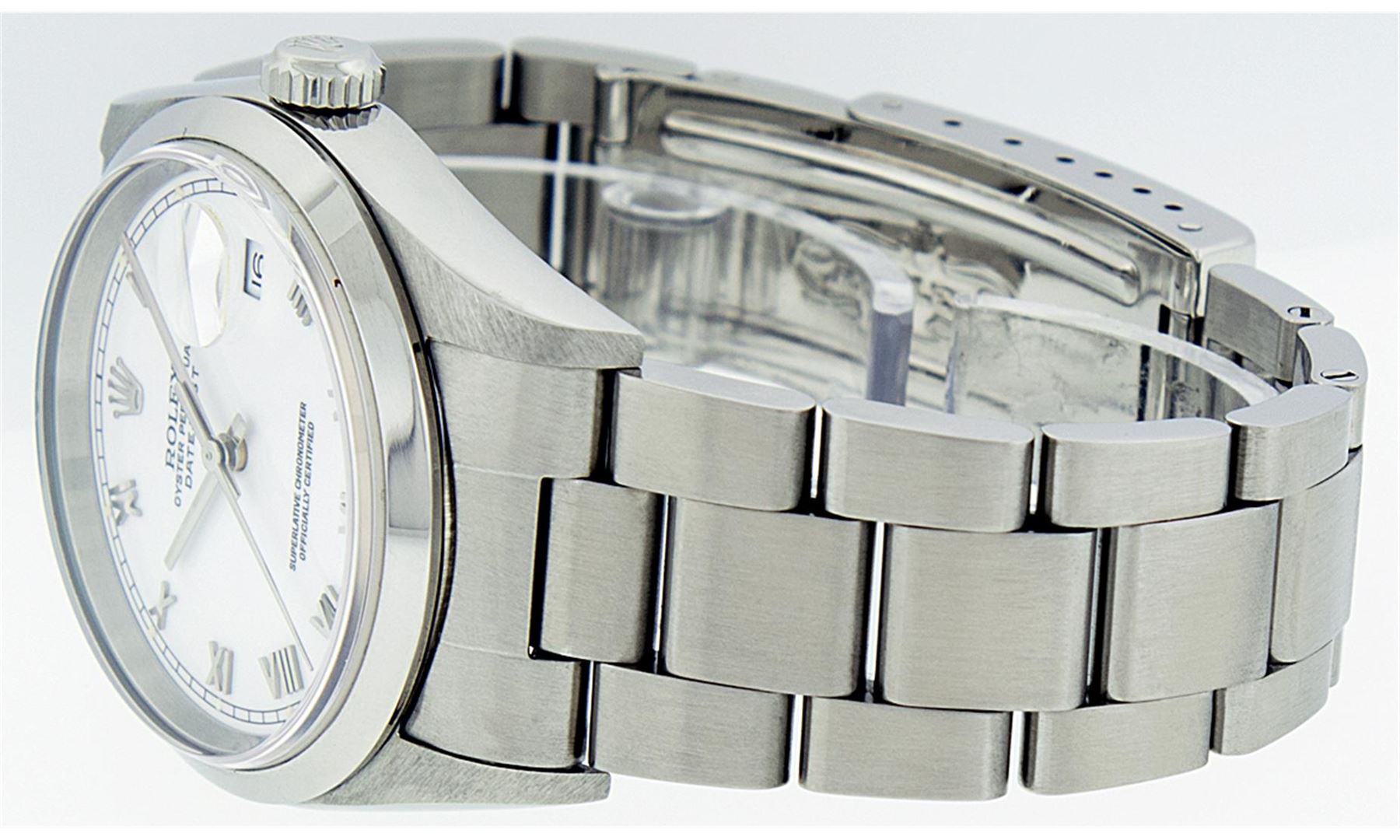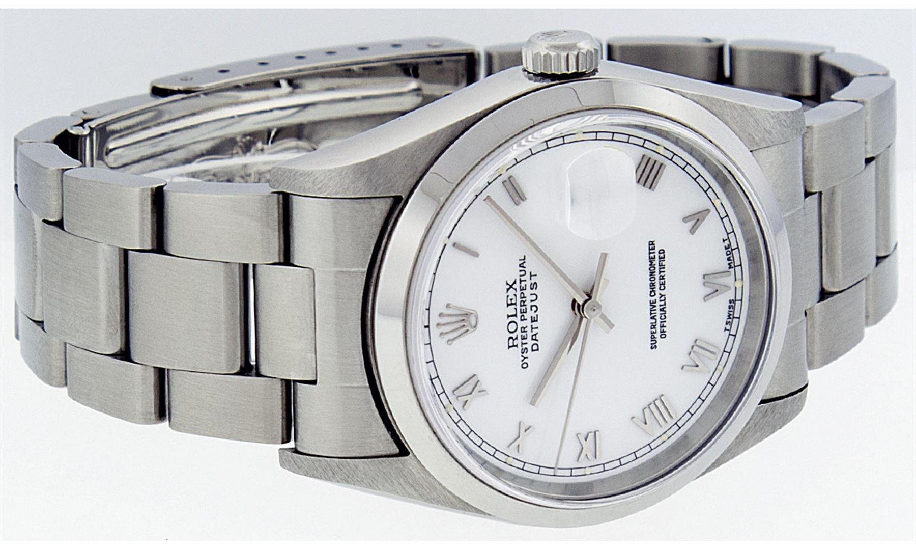 One Gents Rolex Stainless Steel Datejust Polished Bright with Satin Finish, Serviced & Electronically Tested, Stainless Steel Case: 36mm, Stainless Steel Crown, Bezel: Stainless Steel Smooth Bezel. Crystal: Synthetic Sapphire Cyclops Lens. Movement: Automatic Winding Movement Caliber 3135. Custom Dial: White Roman Dial With Square Roman Track & Lumi Dots. Date Window: 3 O'Clock Position Date Display, Quickset, Model: Quickset Datejust. Condition: G-6 Extra Fine. Bracelet: Stainless Steel Oyster Band. Bright Polish & Satin Finish. 7.0 Inch Length, Adjustable. Standard Clasp, With Rolex Logo. Comes with 6 month warranty.
