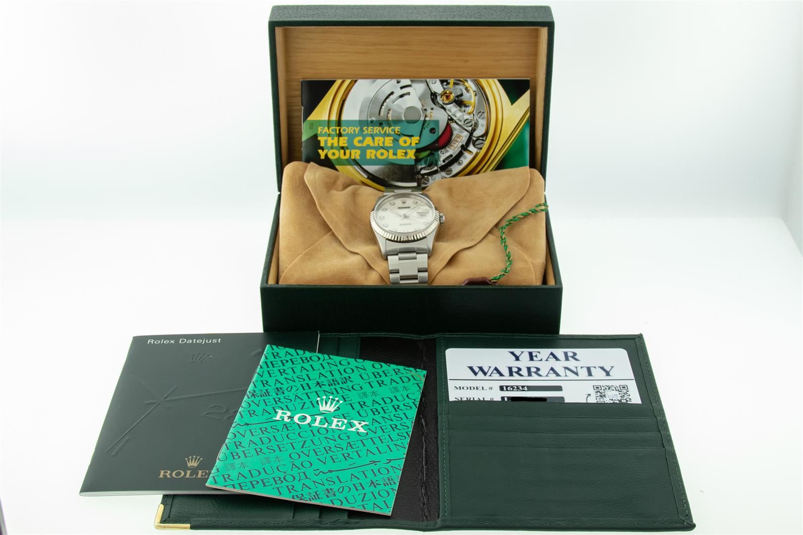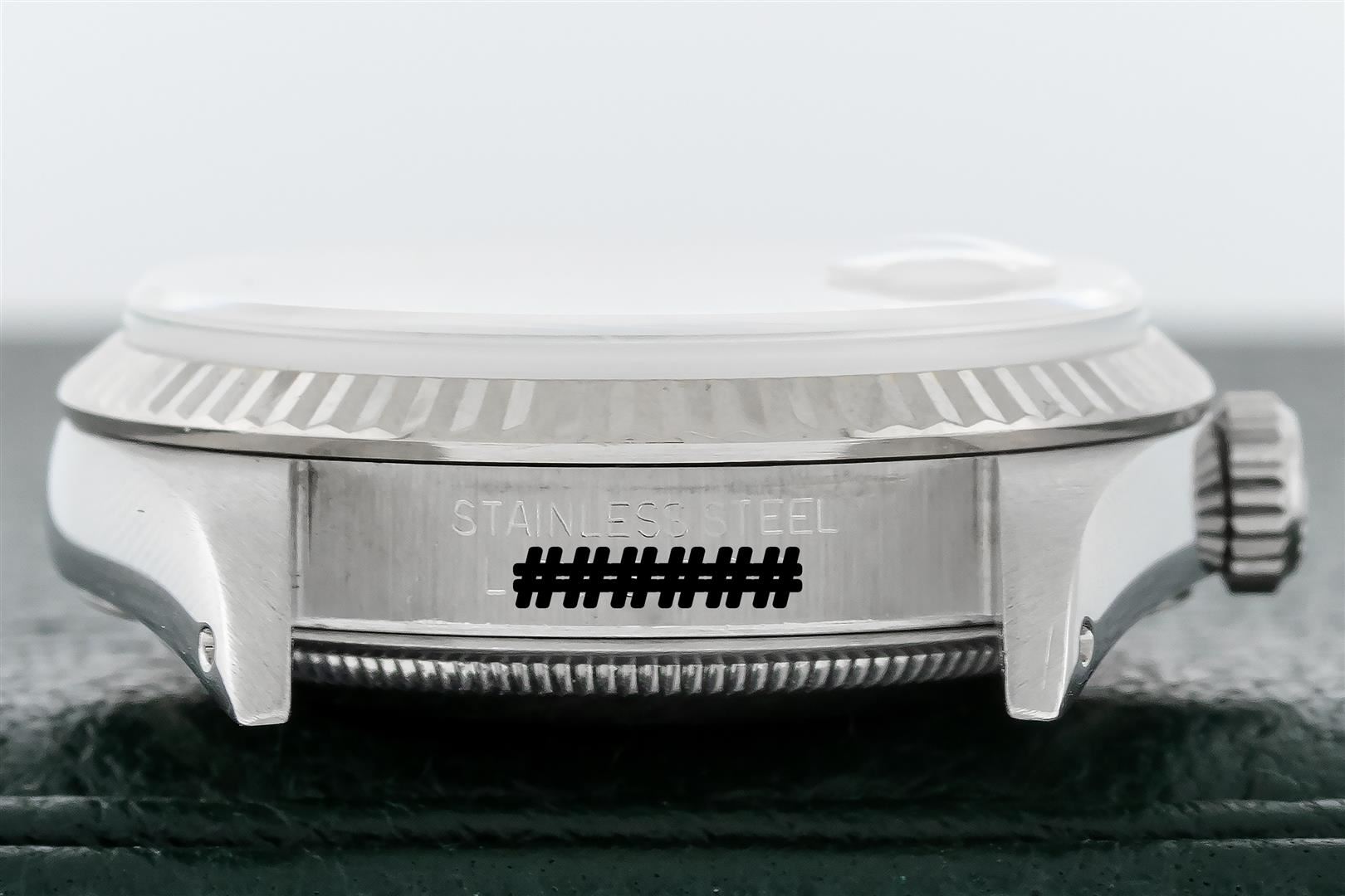 Mens Stainless Steel Rolex Oyster Perpetual Datejust Polished, Serviced & Electronically Tested, Stainless Steel Case: 36mm, Original Stainless Steel Crown, Bezel: Original Rolex 18K White Gold Fluted Bezel. Custom Crystal: New Scratch Resistant Sappphire Crystal With Cyclops Magnifying Lens. Hands: Genuine Rolex Luminecent Hands. Movement: Automatic Winding Movement 3135. Dial: Original Rolex Factory Silver Jubilee Dial with Diamond Hour Markers, Diamond Count: 10 Diamonds in Dial, Clarity:VVS Date Window: 3 O'Clock Position Date Display, Quickset, Model: Sapphire Datejust 16234 Caliber 3135, Condition: G-6 Extra Fine. Bracelet: Tight Stainless Steel Oyster Band Showing Little To No Stretch. Bright Polish. 6.0 Inch Length, Adjustable. Standard Clasp, With Rolex Logo. This Watch Has Been Serviced And Polished It Is Free Of All Scratches And Dents. This Watch Comes With The Following Accessories: Rolex Box, Rolex Booklets, Rolex Tag, Rolex Wallet and Rolex Carry Pouch.
