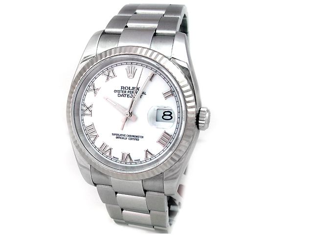 Rolex Stainless Steel Datejust Watch. **|**|** 36mm Rolex Stainless Steel Datejust Watch. White Roman Numeral Dial. 18k White Gold Fluted Bezel. Stainless Steel Oyster Band. Style 116234. ; MSRP: $10900