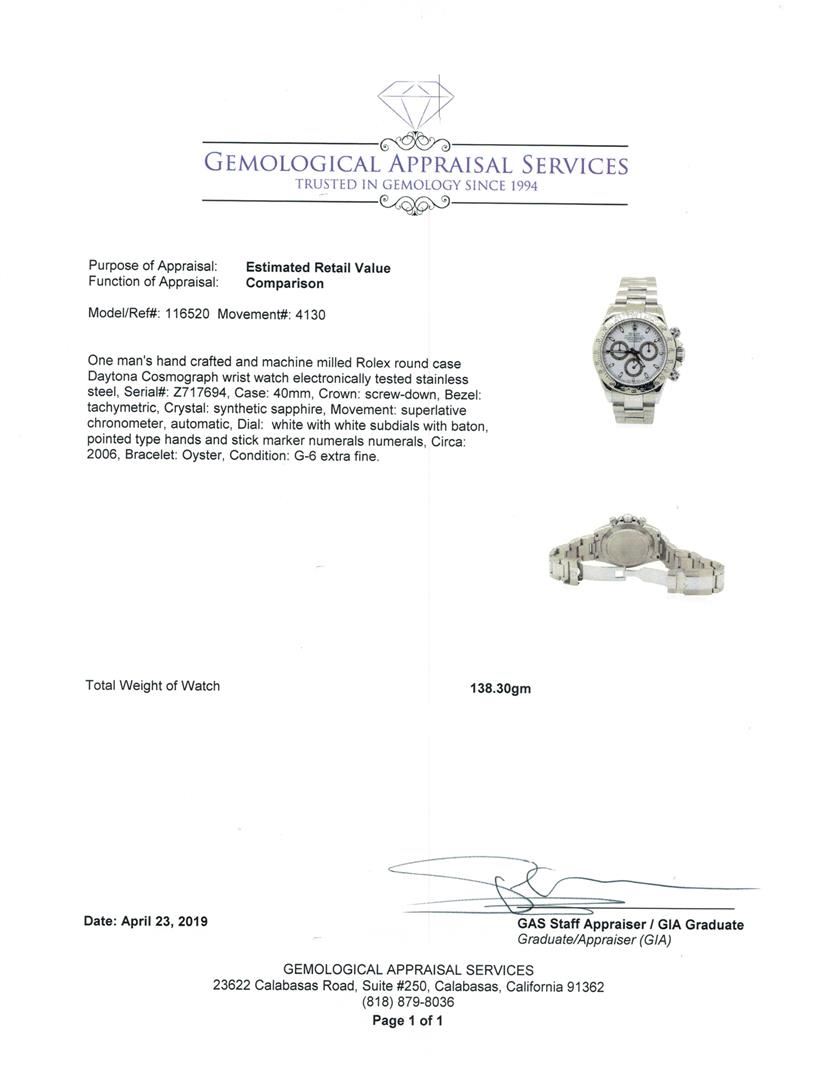 One man's, hand crafted and machine milled Rolex round case Daytona Cosmograph wrist watch electronically tested stainless steel, Serial#: Z717694, Case: 40mm, Crown: screw-down, Bezel: tachymetric, Crystal: synthetic sapphire, Movement: superlative chronometer, automatic, Dial: white with white subdials with baton, pointed type hands and stick marker numerals numerals, Circa: 2006, Bracelet: Oyster, Condition: G-6 extra fine.. Total Weight of Watch 138.30gm GAS Appraised at $12400.00. GAS Appraised at $12,400.00.