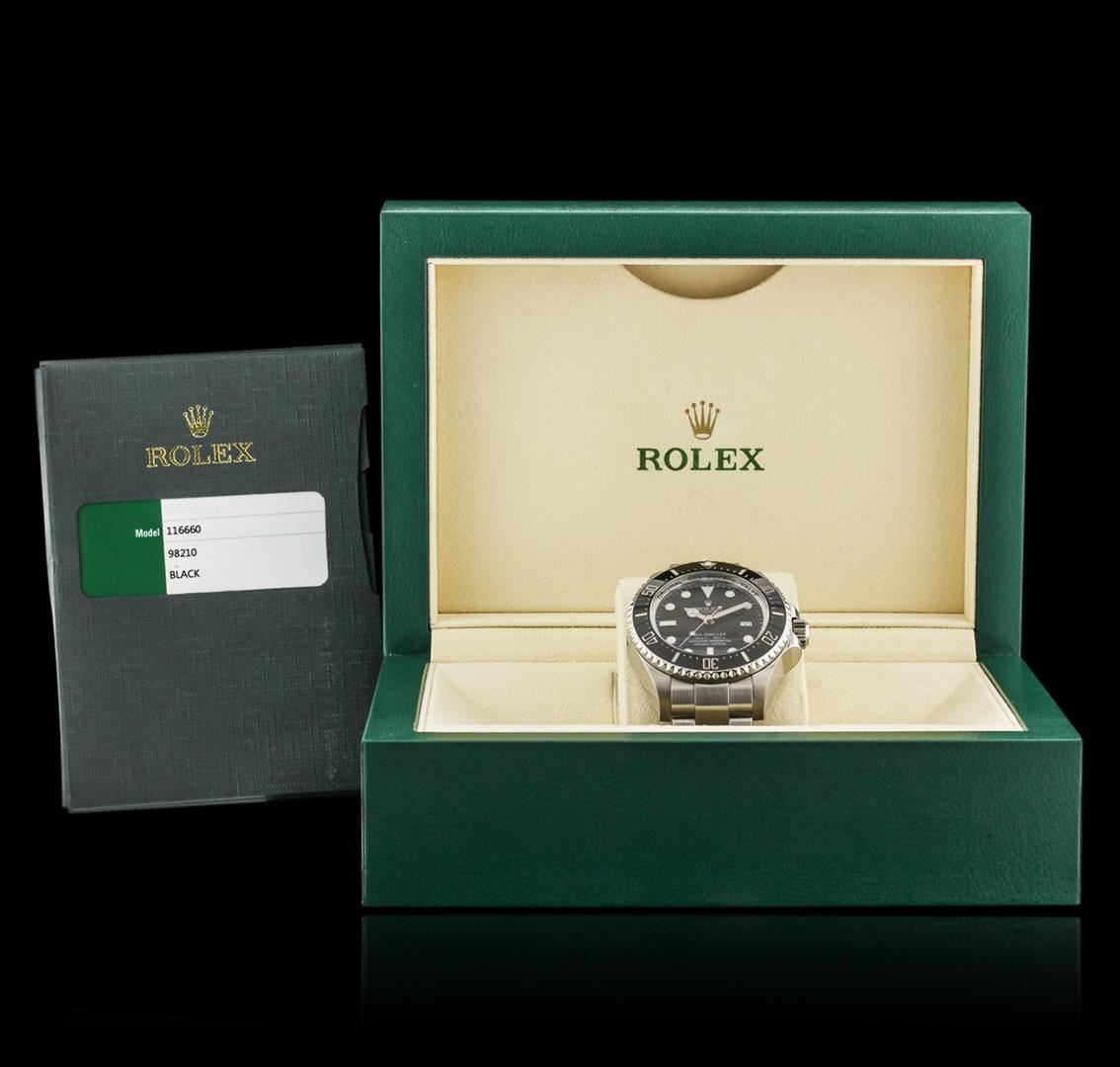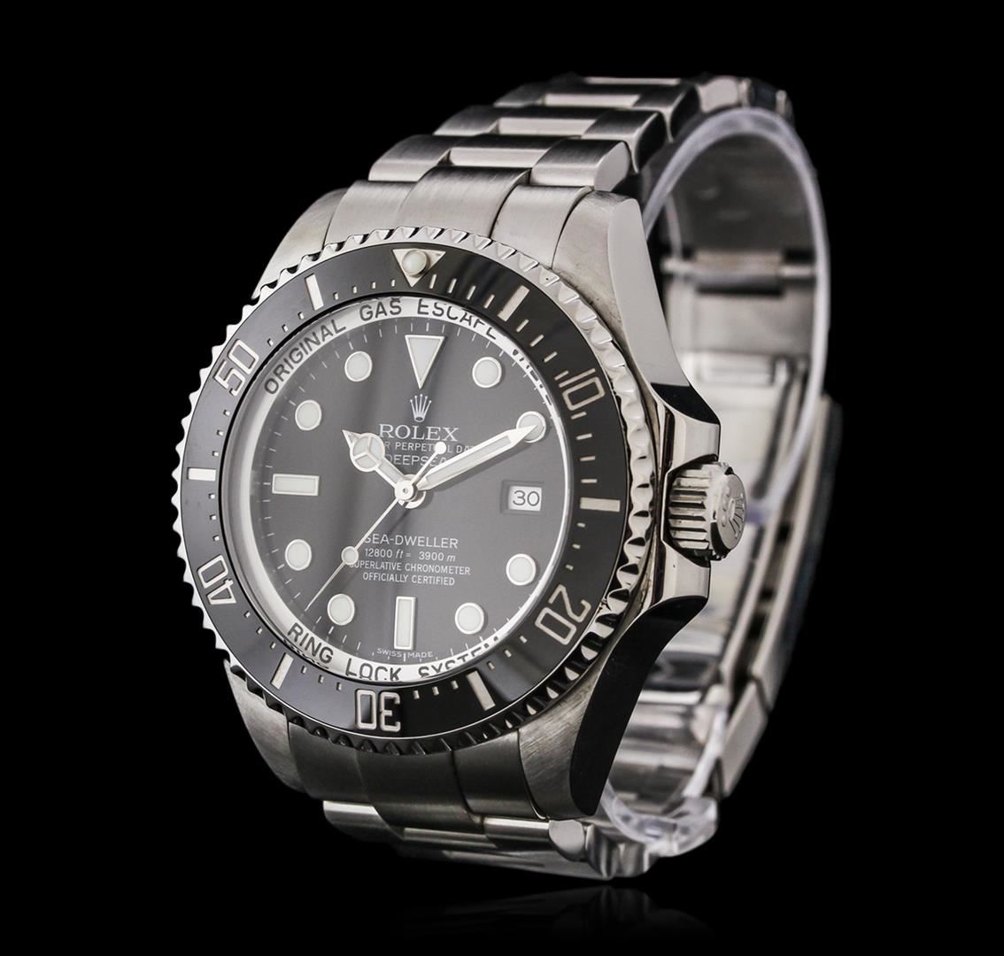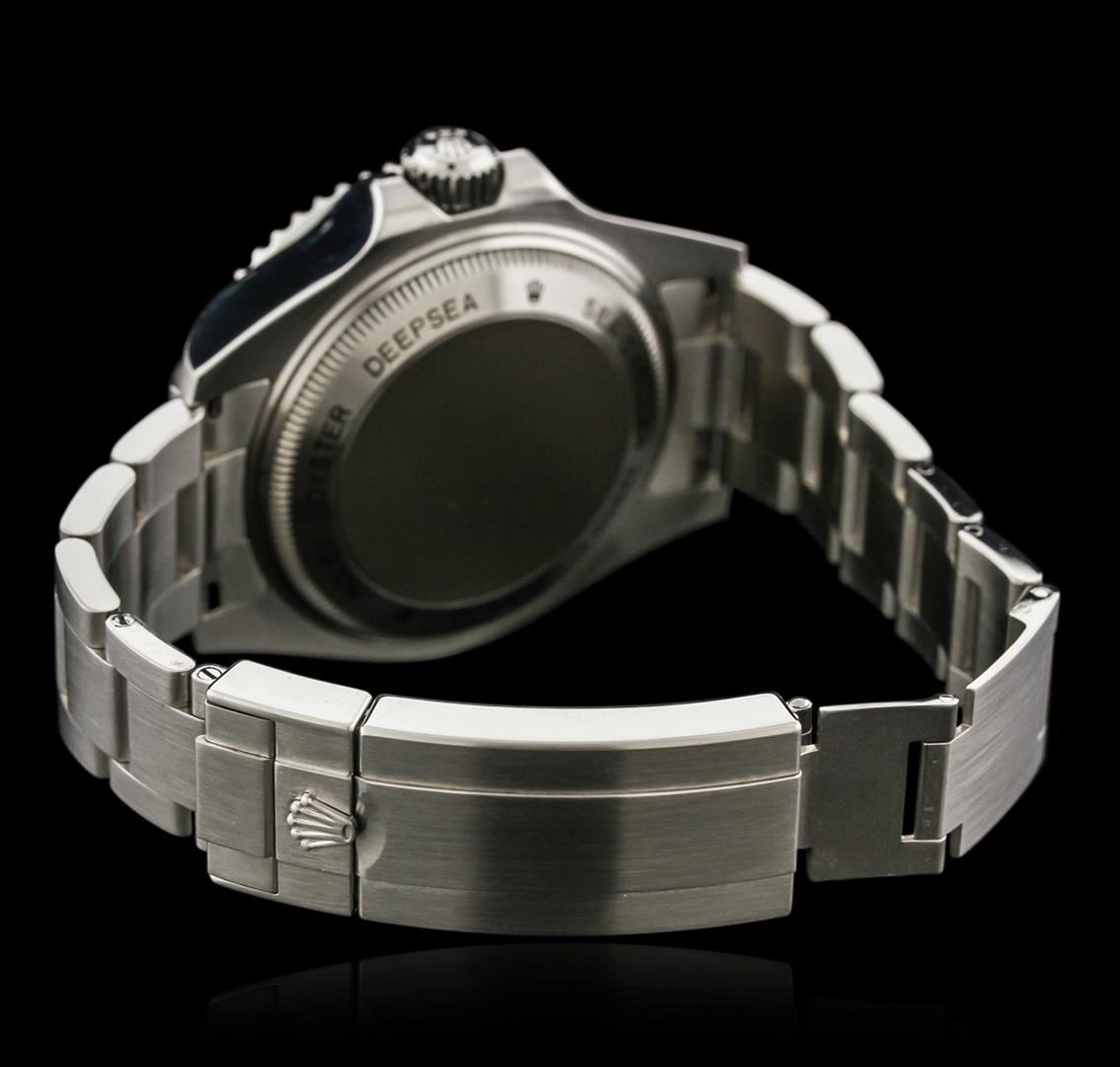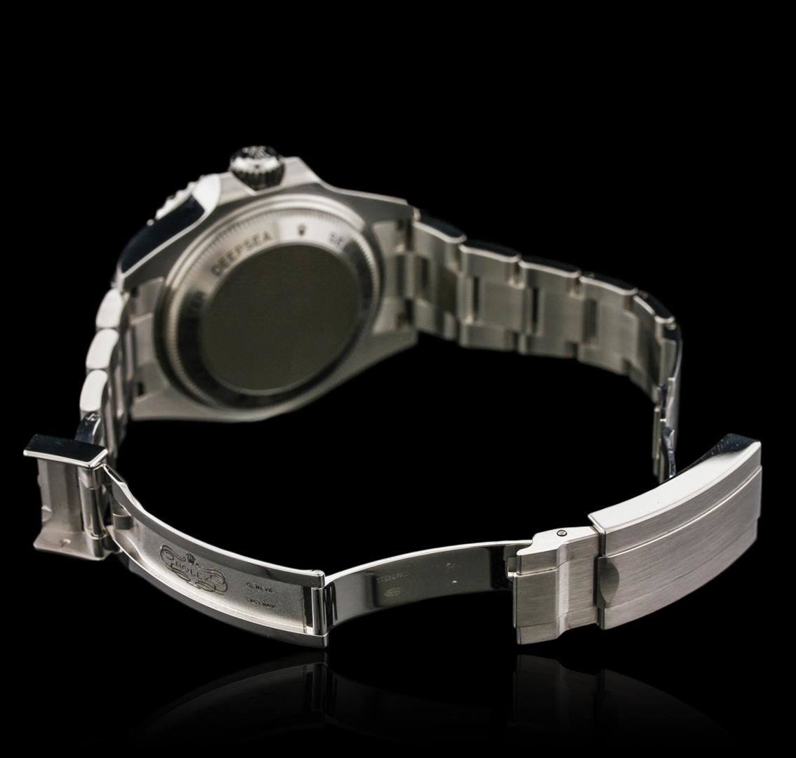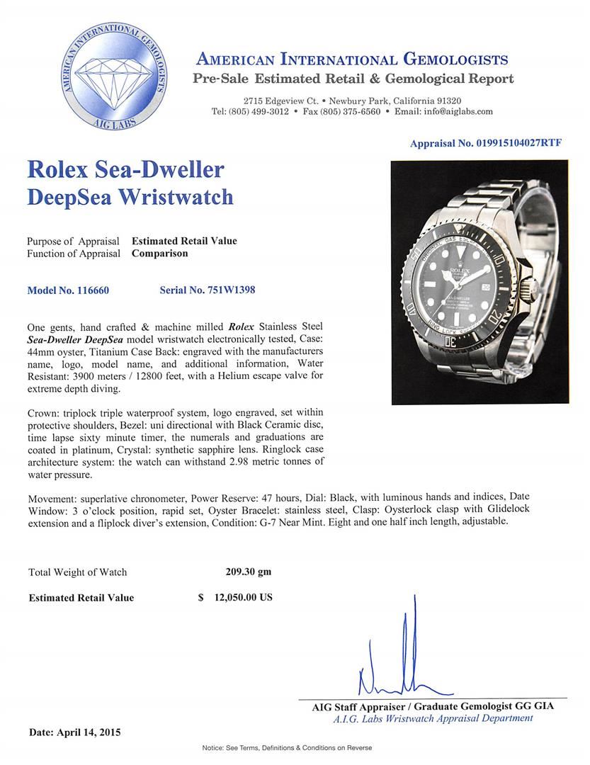 One gents, hand crafted & machine milled Rolex Stainless Steel Deep Sea-Dweller DeepSea model wristwatch electronically tested, Case: 44mm oyster, Case Back: engraved with the manufacturers name, logo, model name, and additional information, Water Resistant: 3900 meters / 12800 feet, with a Helium release valve for extreme depth diving, Crown: twin lock with logo, set within protective shoulders, Bezel: uni directional with Black disc, time lapse sixty minute timer, Crystal: synthetic sapphire lens. Case Ring Lock system: the watch can withstand 2.98 metric tonnes of water pressure. Movement: superlative chronometer, Power Reserve: 47 hours, Dial: Black, with luminous hands and indices, Date Window: 3 o'clock position, quick set, Bracelet: stainless steel, Oyster, Glidelock clasp with diver's extension, Condition: G-7 Near Mint. Eight and one half inch length, adjustable. Total Weight of Watch 209.30 grams. Includes box and papers. AIG Appraised at $12,050.00.