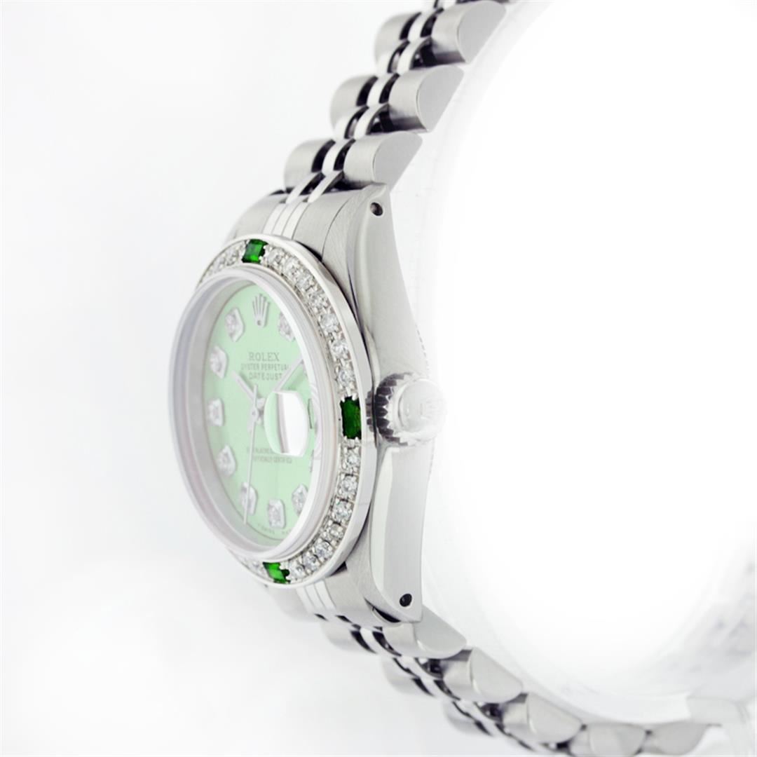 One Ladies Rolex Datejust Polished Bright with Satin Finish, Serviced & Electronically Tested, Stainless Steel Case:26mm, Stainless Steel Crown, Custom Bezel: 18K White Gold Emerald Beadset Diamond Bezel, Diamond + Gem Count: 28 Diamonds + 4 Emeralds Total Weight .70 Carat, Clarity: SI-VS, Color: G to H. Custom Crystal: Synthetic Sapphire Cyclops Lens. Movement: Automatic Winding Movement Caliber 2030. Custom Dial: Green Diamond Dial, Diamond Count: 10 Diamonds, Clarity: SI-VS, Color: G to H. Date Window: 3 O'Clock Position Date Display, Non Quickset, Model: Datejust, Condition: G-6 Extra Fine. Bracelet: Stainless Steel Jubilee. Bright Polish & Satin Finish. 5.5 Inch Length, Adjustable. Standard Clasp, With Rolex Logo.