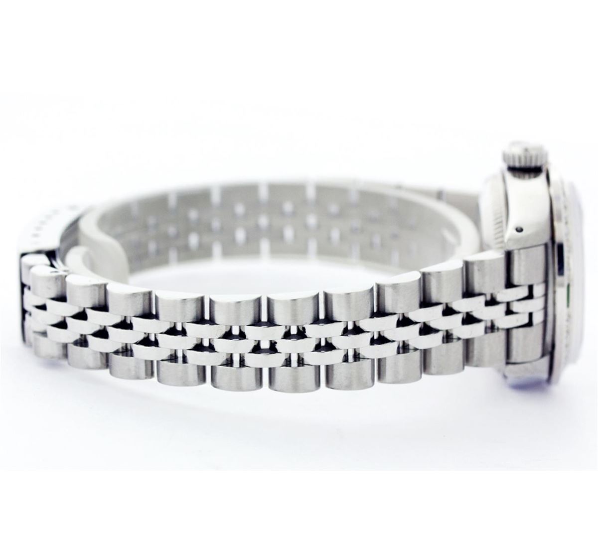 One Ladies Rolex Datejust Polished Bright with Satin Finish, Serviced & Electronically Tested, Stainless Steel Case:26mm, Stainless Steel Crown, Custom Bezel: 18K White Gold Emerald Beadset Diamond Bezel, Diamond + Gem Count: 28 Diamonds + 4 Emeralds Total Weight .70 Carat, Clarity: SI-VS, Color: G to H. Custom Crystal: Synthetic Sapphire Cyclops Lens. Movement: Automatic Winding Movement Caliber 2030. Custom Dial: Green Diamond Dial, Diamond Count: 10 Diamonds, Clarity: SI-VS, Color: G to H. Date Window: 3 O'Clock Position Date Display, Non Quickset, Model: Datejust, Condition: G-6 Extra Fine. Bracelet: Stainless Steel Jubilee. Bright Polish & Satin Finish. 5.5 Inch Length, Adjustable. Standard Clasp, With Rolex Logo.