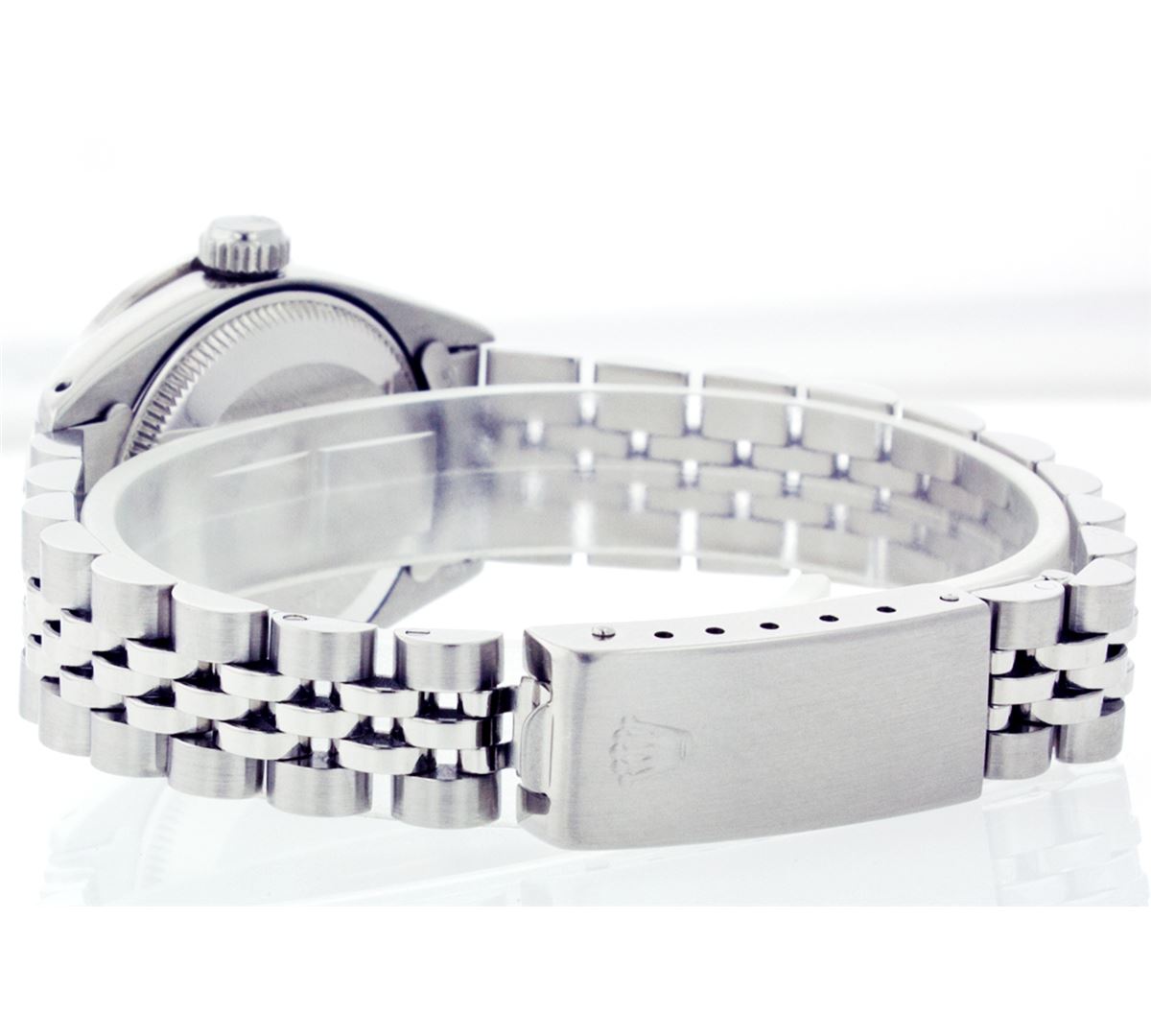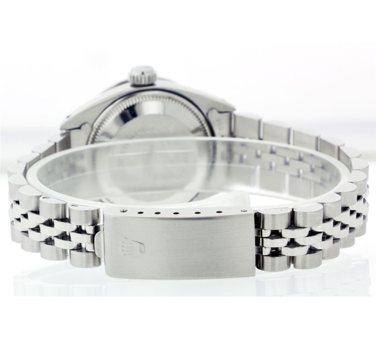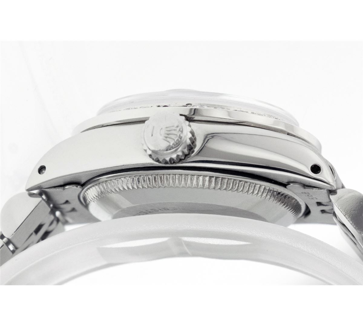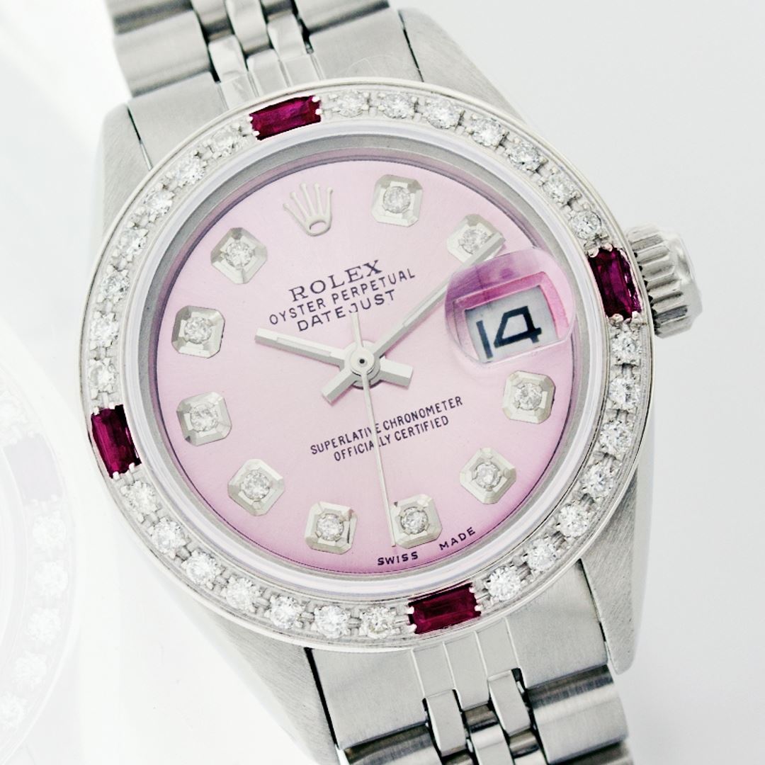 One Ladies Rolex Datejust Polished Bright with Satin Finish, Serviced & Electronically Tested, Stainless Steel Case:26mm, Stainless Steel Crown, Custom Bezel: 18K White Gold Ruby Beadset Diamond Bezel, Diamond + Gem Count: 28 Diamonds + 4 Rubies Total Weight .70 Carat, Clarity: SI-VS, Color: G to H. Custom Crystal: Synthetic Sapphire Cyclops Lens. Movement: Automatic Winding Movement Caliber 2030. Custom Dial: Refinished Pink Mother Of Pearl With Diamond Hour Markers, 10 Diamond in Dial G To H In Color, Clarity: SI-VS. Date Window: 3 O'Clock Position Date Display, Non Quickset, Model: 6917 Condition: G-6 Extra Fine. Bracelet: Stainless Steel Jubilee. Bright Polish & Satin Finish. 5.5 Inch Length, Adjustable. Standard Clasp, With Rolex Logo.