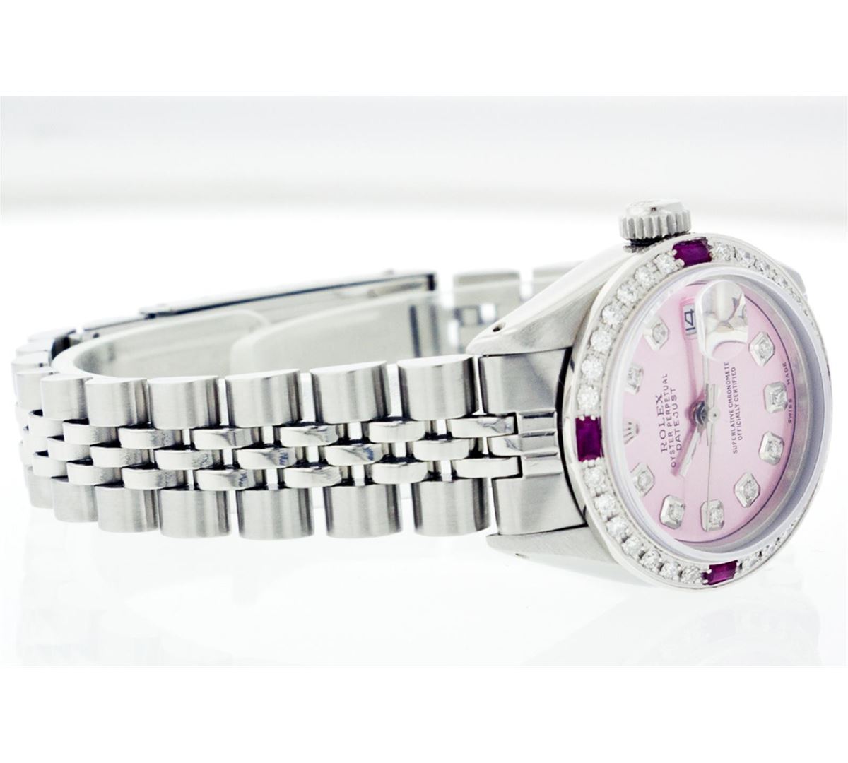 One Ladies Rolex Datejust Polished Bright with Satin Finish, Serviced & Electronically Tested, Stainless Steel Case:26mm, Stainless Steel Crown, Custom Bezel: 18K White Gold Ruby Beadset Diamond Bezel, Diamond + Gem Count: 28 Diamonds + 4 Rubies Total Weight .70 Carat, Clarity: SI-VS, Color: G to H. Custom Crystal: Synthetic Sapphire Cyclops Lens. Movement: Automatic Winding Movement Caliber 2030. Custom Dial: Refinished Ice Pink With Diamond Hour Markers, 10 Diamond in Dial G To H In Color, Clarity: SI-VS. Date Window: 3 O'Clock Position Date Display, Non Quickset, Model: 6917 Condition: G-6 Extra Fine. Bracelet: Stainless Steel Jubilee. Bright Polish & Satin Finish. 5.5 Inch Length, Adjustable. Standard Clasp, With Rolex Logo.