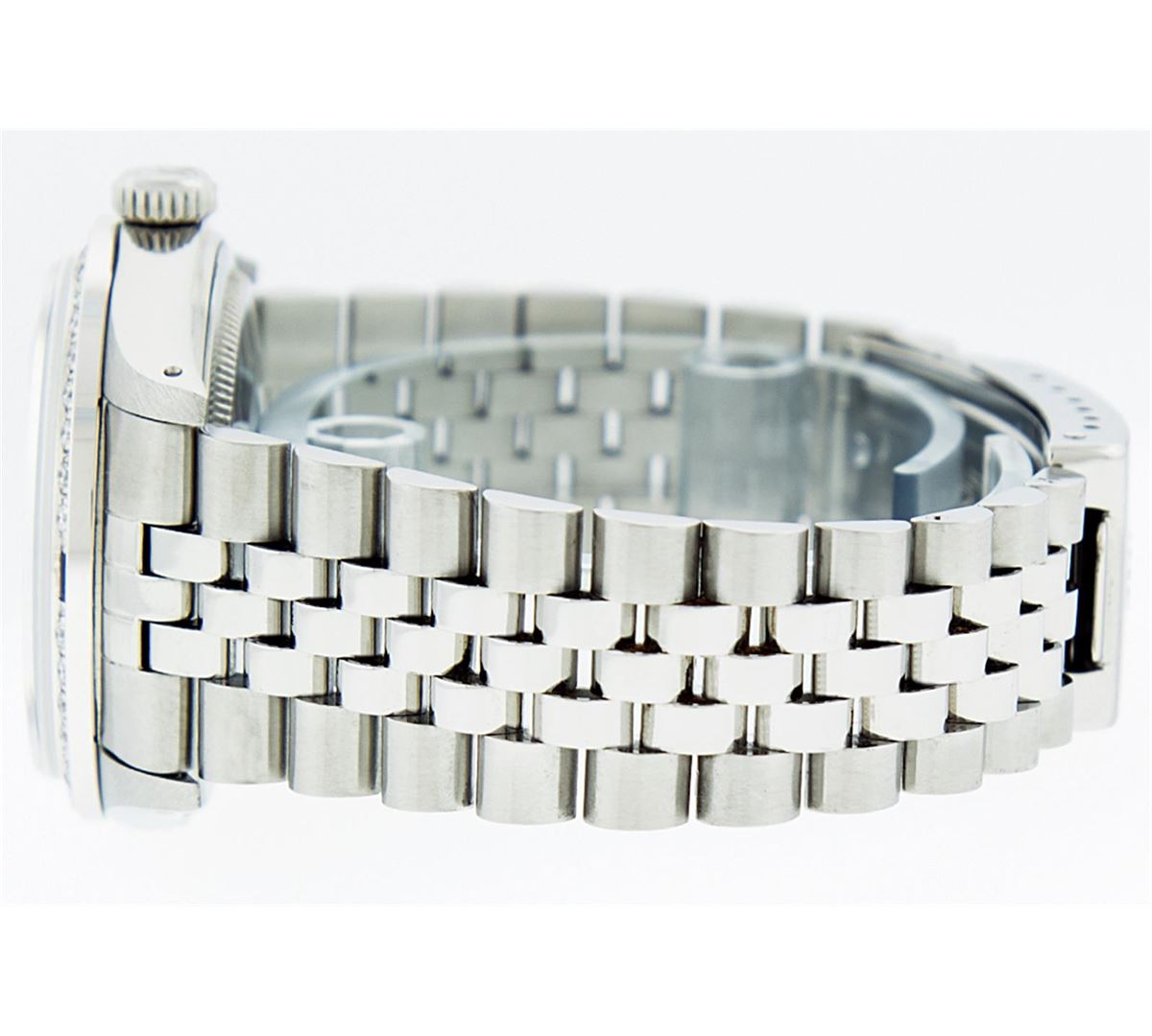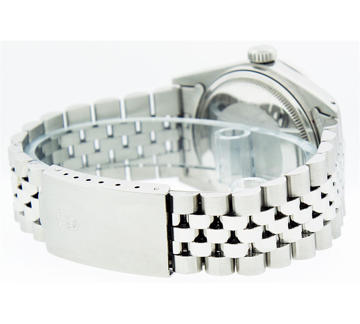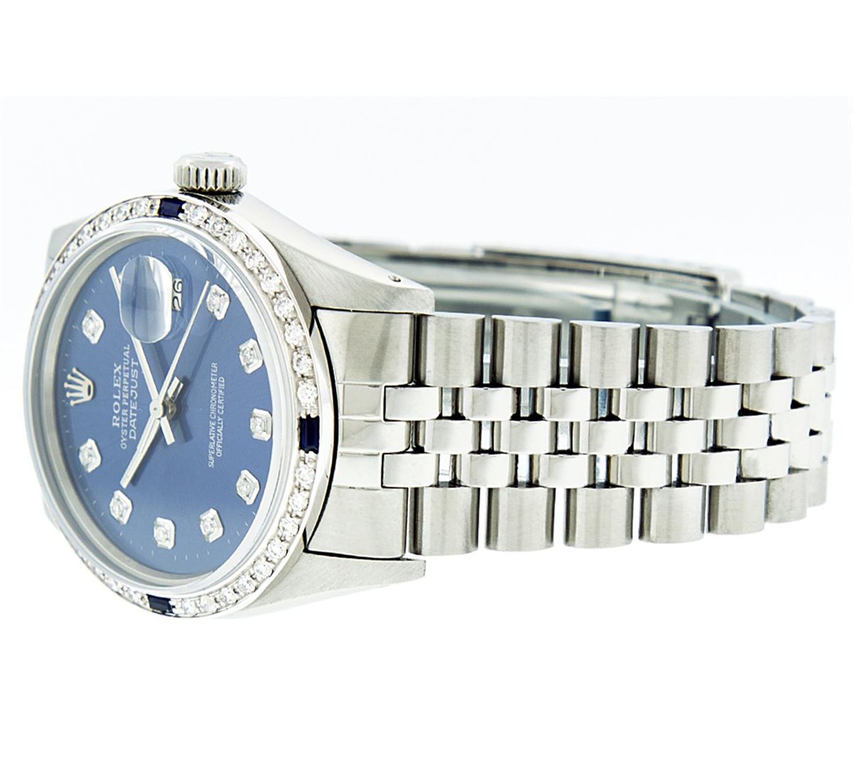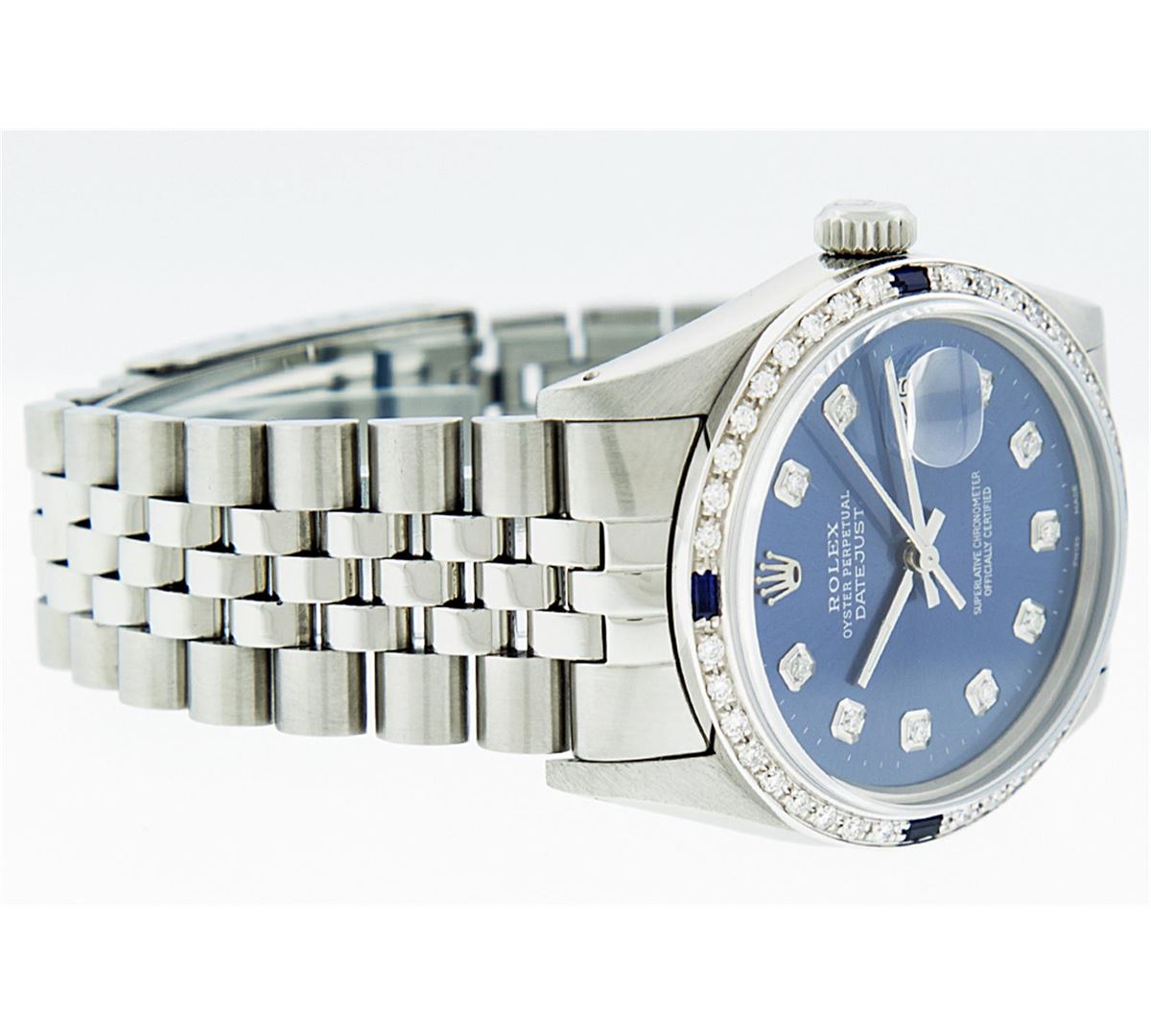 One Gents Rolex Datejust Polished, Serviced & Electronically Tested, Stainless Steel Case:36mm, Stainless Steel Crown, Custom Bezel: 18K White Gold Sapphire Beadset Diamond Bezel, Diamond + Gem Count: 36 Diamonds + 4 Sapphires Total Weight 1.00 Carat, Clarity: SI-VS, Color: G to H. Custom Crystal: Synthetic Sapphire Cyclops Lens. Movement: Automatic Winding Movement Caliber 3035. Custom Dial: Blue Diamond Dial With Small Track, Diamond Count: 10 Diamond Dial G To H In Color, Clarity: SI-VS. Date Window: 3 O'Clock Position Date Display, Quickset, Model: 16014 Condition: G-6 Extra Fine. Bracelet: Stainless Steel Jubilee. Bright Polish & Satin Finish. 6.5 Inch Length, Adjustable. Standard Clasp, With Rolex Logo.