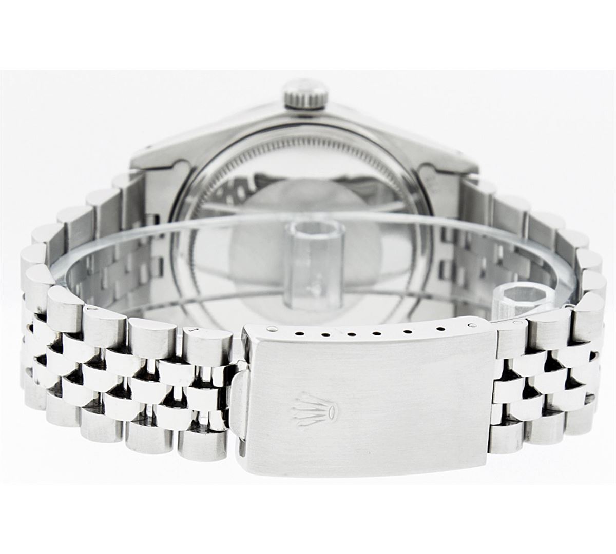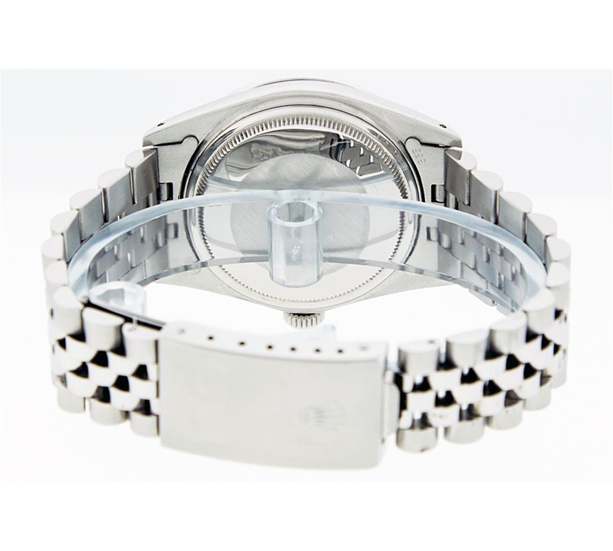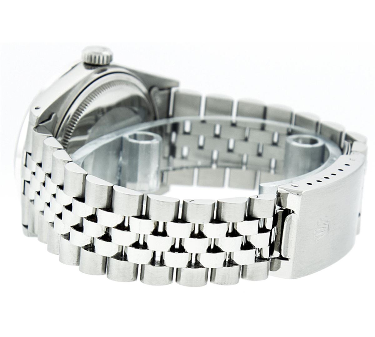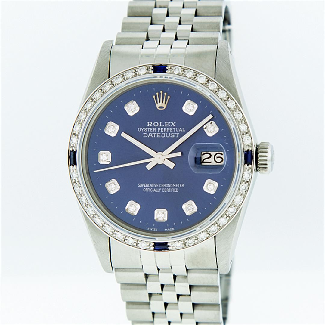 One Gents Rolex Datejust Polished, Serviced & Electronically Tested, Stainless Steel Case:36mm, Stainless Steel Crown, Custom Bezel: 18K White Gold Sapphire Beadset Diamond Bezel, Diamond + Gem Count: 36 Diamonds + 4 Sapphires Total Weight 1.00 Carat, Clarity: SI-VS, Color: G to H. Custom Crystal: Synthetic Sapphire Cyclops Lens. Movement: Automatic Winding Movement Caliber 3035. Custom Dial: Blue Diamond Dial With Small Track, Diamond Count: 10 Diamond Dial G To H In Color, Clarity: SI-VS. Date Window: 3 O'Clock Position Date Display, Quickset, Model: 16014 Condition: G-6 Extra Fine. Bracelet: Stainless Steel Jubilee. Bright Polish & Satin Finish. 6.5 Inch Length, Adjustable. Standard Clasp, With Rolex Logo.
