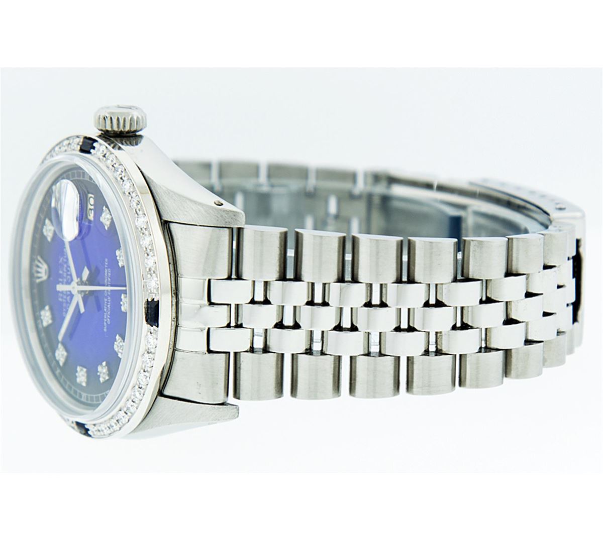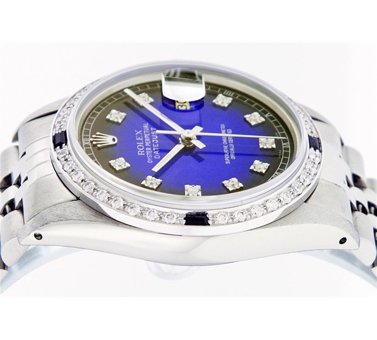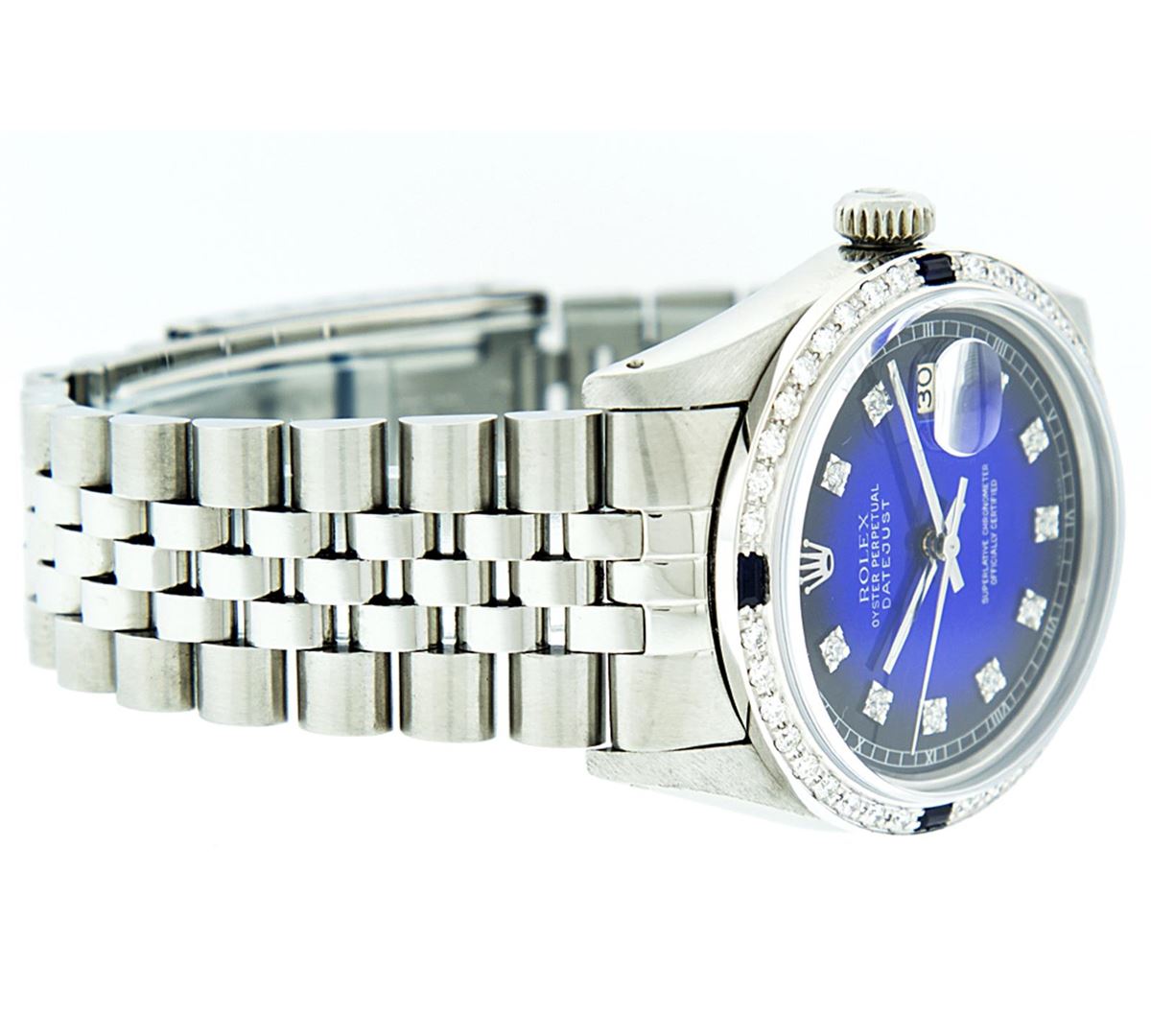 One Gents Rolex Datejust Polished, Serviced & Electronically Tested, Stainless Steel Case:36mm, Stainless Steel Crown, Custom Bezel: 18K White Gold Sapphire Beadset Diamond Bezel, Diamond + Gem Count: 36 Diamonds + 4 Sapphires Total Weight 1.00 Carat, Clarity: SI-VS, Color: G to H. Custom Crystal: Synthetic Sapphire Cyclops Lens. Movement: Automatic Winding Movement Caliber 3035. Custom Dial: Blue Vignette With VVS Diamond Hour Markers and Roman Square Track, 10 Diamond Dial G To H In Color, Clarity: VVS. Date Window: 3 O'Clock Position Date Display, Quickset, Model: 16014 Condition: G-6 Extra Fine. Bracelet: Stainless Steel Jubilee. Bright Polish & Satin Finish. 6.5 Inch Length, Adjustable. Standard Clasp, With Rolex Logo.