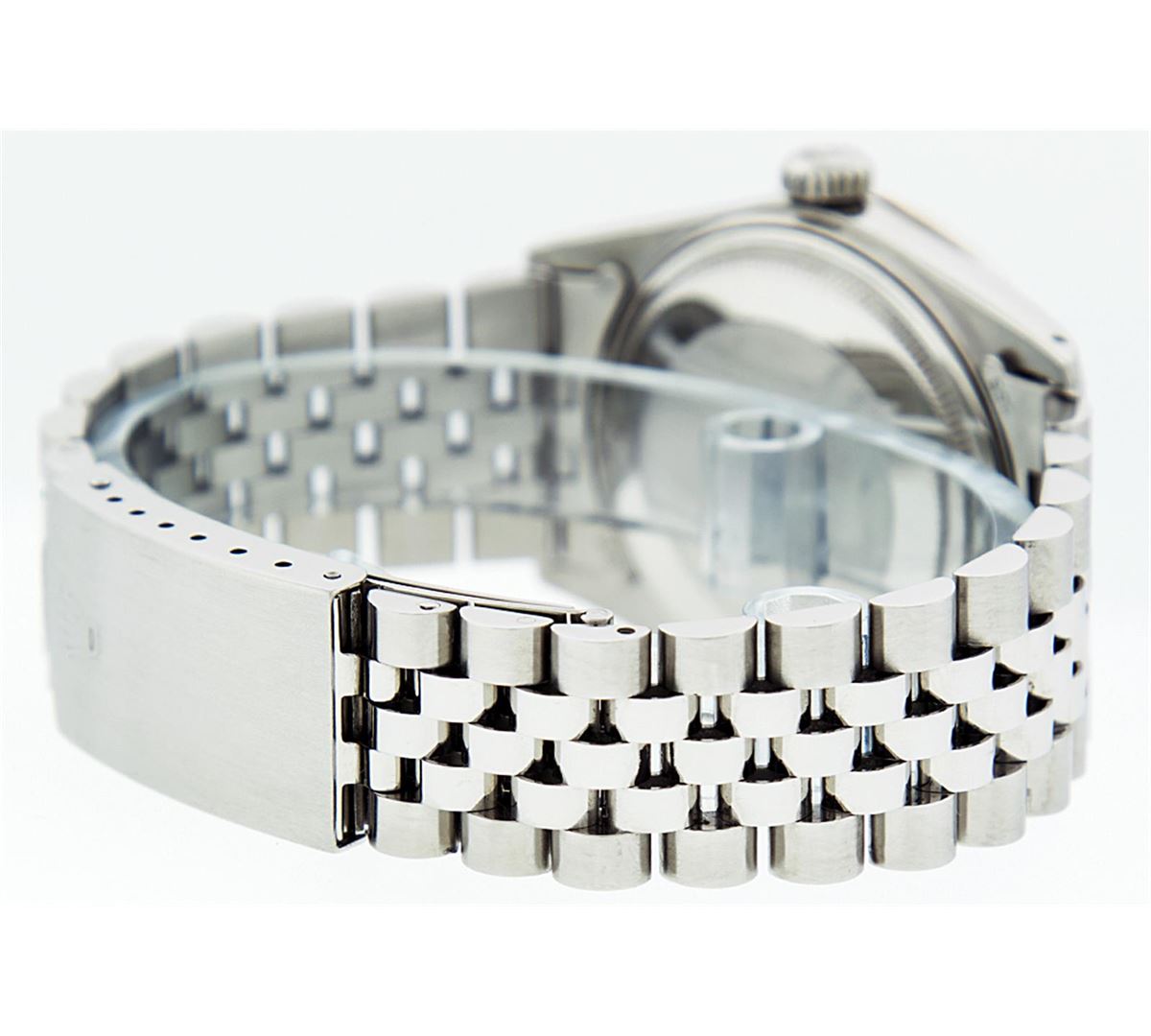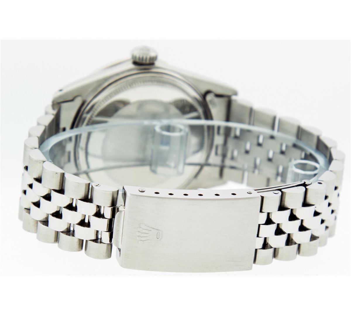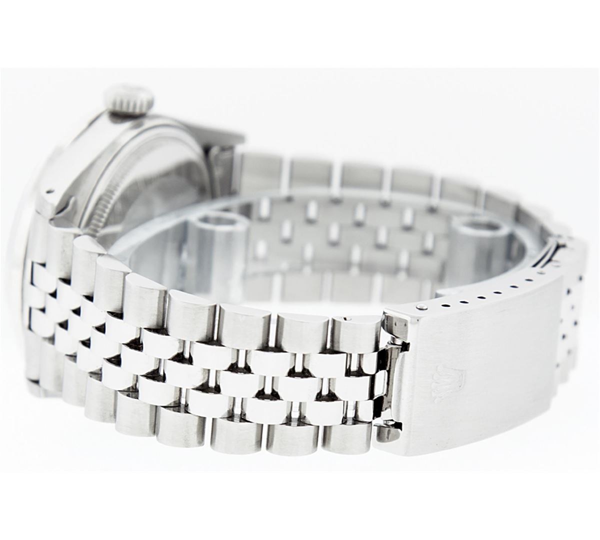 One Gents Rolex Datejust Polished, Serviced & Electronically Tested, Stainless Steel Case:36mm, Stainless Steel Crown, Custom Bezel: 18K White Gold Sapphire Beadset Diamond Bezel, Diamond + Gem Count: 36 Diamonds + 4 Sapphires Total Weight 1.00 Carat, Clarity: SI-VS, Color: G to H. Custom Crystal: Synthetic Sapphire Cyclops Lens. Movement: Automatic Winding Movement Caliber 3035. Custom Dial: Blue Vignette With VVS Diamond Hour Markers and Roman Square Track, 10 Diamond Dial G To H In Color, Clarity: VVS. Date Window: 3 O'Clock Position Date Display, Quickset, Model: 16014 Condition: G-6 Extra Fine. Bracelet: Stainless Steel Jubilee. Bright Polish & Satin Finish. 6.5 Inch Length, Adjustable. Standard Clasp, With Rolex Logo.