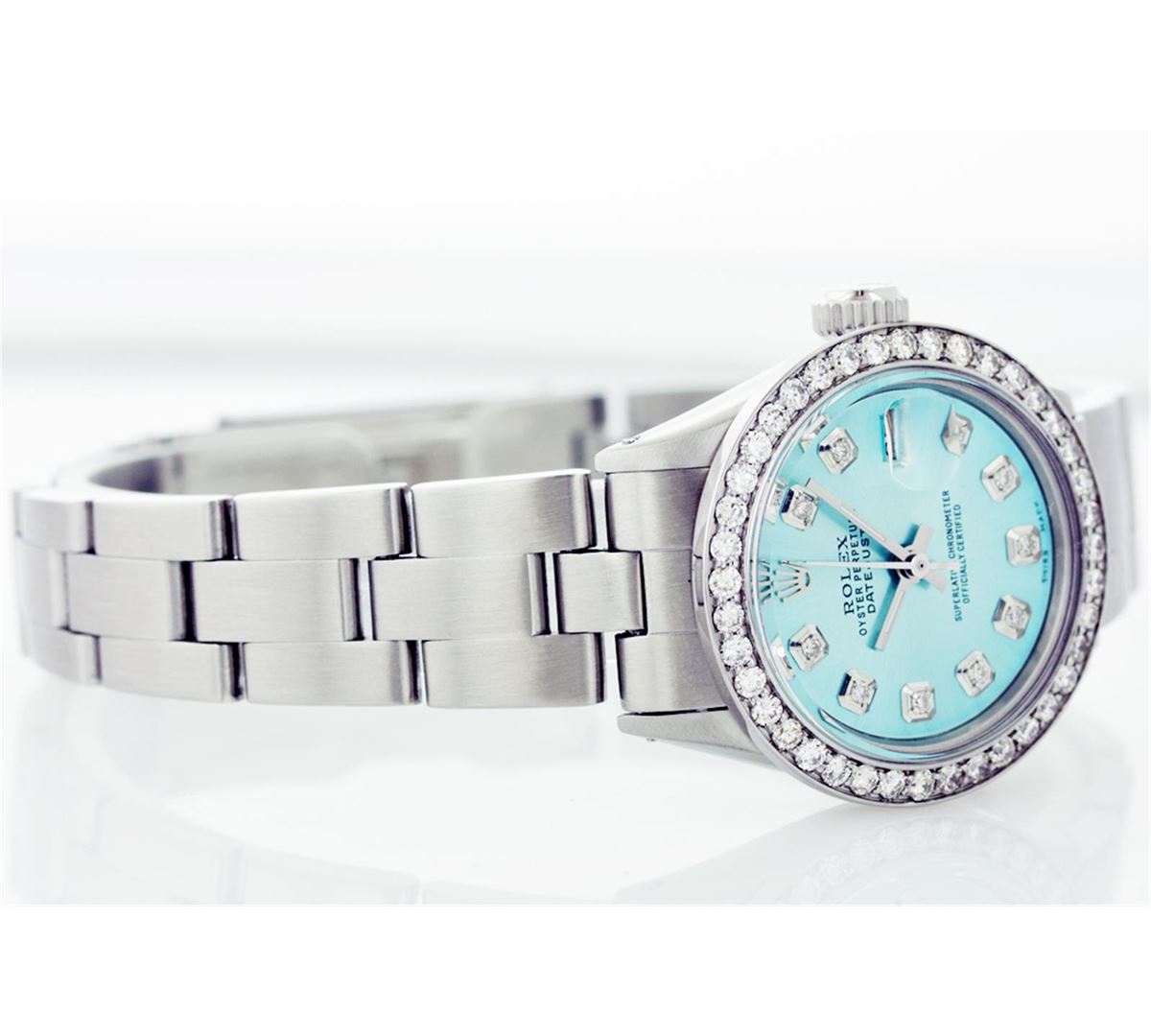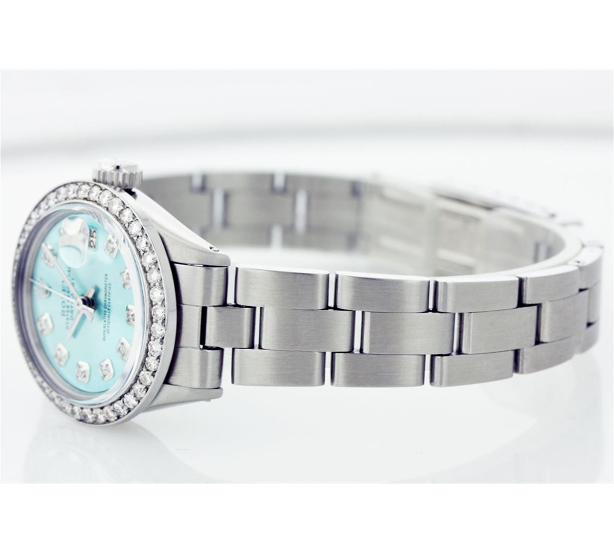 One Ladies Rolex Datejust Polished Bright with Satin Finish, Serviced & Electronically Tested, Stainless Steel Case: 26mm, Stainless Steel Crown, Custom Bezel: 18K White Gold Beadset Diamond Bezel, Diamond Count: 32 Diamonds Total Weight .70 Carat, Clarity: SI-VS, Color: G to H. Custom Crystal: Synthetic Sapphire Cyclops Lens. Movement: Automatic Winding Movement Caliber 2030. Original Custom Dial: Refinished Ice Blue With Diamond Hour Markers, 10 Diamond in Dial G To H In Color, Clarity: SI-VS. Date Window: 3 O'Clock Position Date Display, Quickset, Model: 6917 Condition: G-6 Extra Fine. Bracelet: Stainless Steel Oyster. Bright Polish & Satin Finish. 5.5 Inch Length, Adjustable. Standard Clasp, With Rolex Logo.