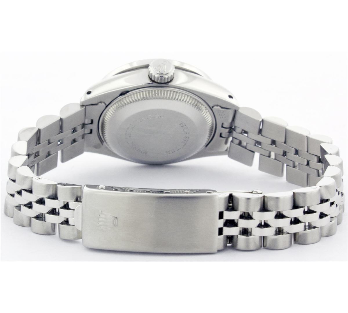 One Ladies Rolex Datejust Polished Bright with Satin Finish, Serviced & Electronically Tested, Stainless Steel Case:26mm, Stainless Steel Crown, Custom Bezel: 18K White Gold Beadset Diamond Bezel, Diamond Count: 32 Diamonds Total Weight .70 Carat, Clarity: SI-VS, Color: G to H. Custom Crystal: Synthetic Sapphire Cyclops Lens. Movement: Automatic Winding Movement Caliber 2030. Custom Dial: Silver Diamond Dial, Diamond Count: 10 Diamonds In Dial, Clarity: SI-VS, Color: G to H. Date Window: 3 O'Clock Position Date Display, Quickset, Model: 6917 Condition: G-6 Extra Fine. Bracelet: Stainless Steel Jubilee Band. Bright Polish & Satin Finish. 5.5 Inch Length, Adjustable. Standard Clasp, With Rolex Logo.
