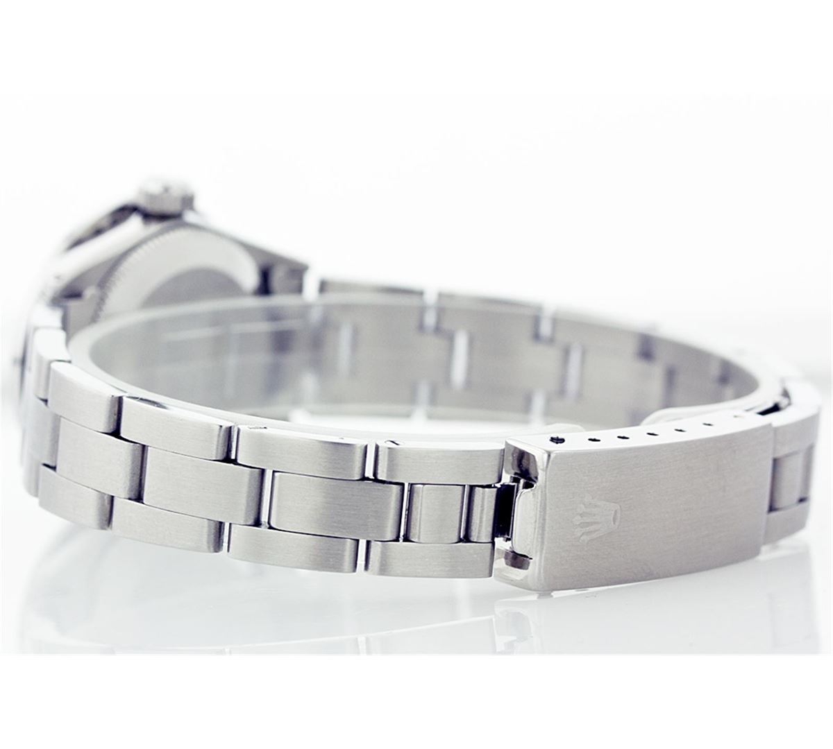 One Ladies Rolex Datejust Polished Bright with Satin Finish, Serviced & Electronically Tested, Stainless Steel Case: 26mm, Stainless Steel Crown, Custom Bezel: 18K White Gold Beadset Diamond Bezel, Diamond Count: 32 Diamonds Total Weight .70 Carat, Clarity: SI-VS, Color: G to H. Custom Crystal: Synthetic Sapphire Cyclops Lens. Movement: Automatic Winding Movement Caliber 2030. Original Custom Dial: Refinished Ice Blue With Diamond Hour Markers, 10 Diamond in Dial G To H In Color, Clarity: SI-VS. Date Window: 3 O'Clock Position Date Display, Quickset, Model: 6917 Condition: G-6 Extra Fine. Bracelet: Stainless Steel Oyster. Bright Polish & Satin Finish. 5.5 Inch Length, Adjustable. Standard Clasp, With Rolex Logo.