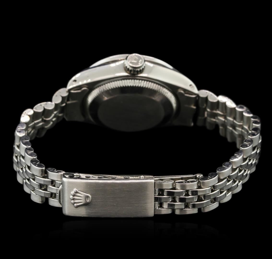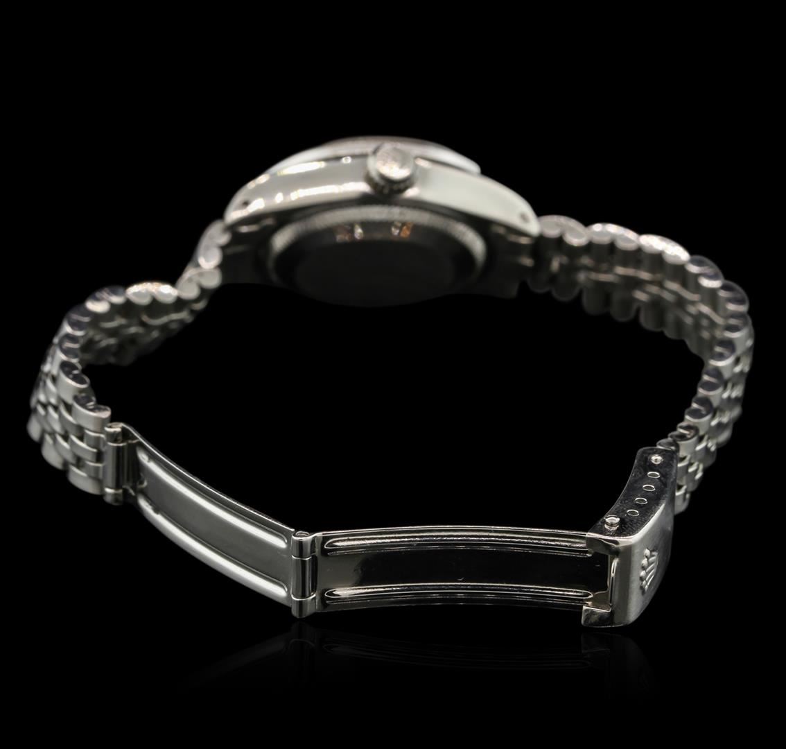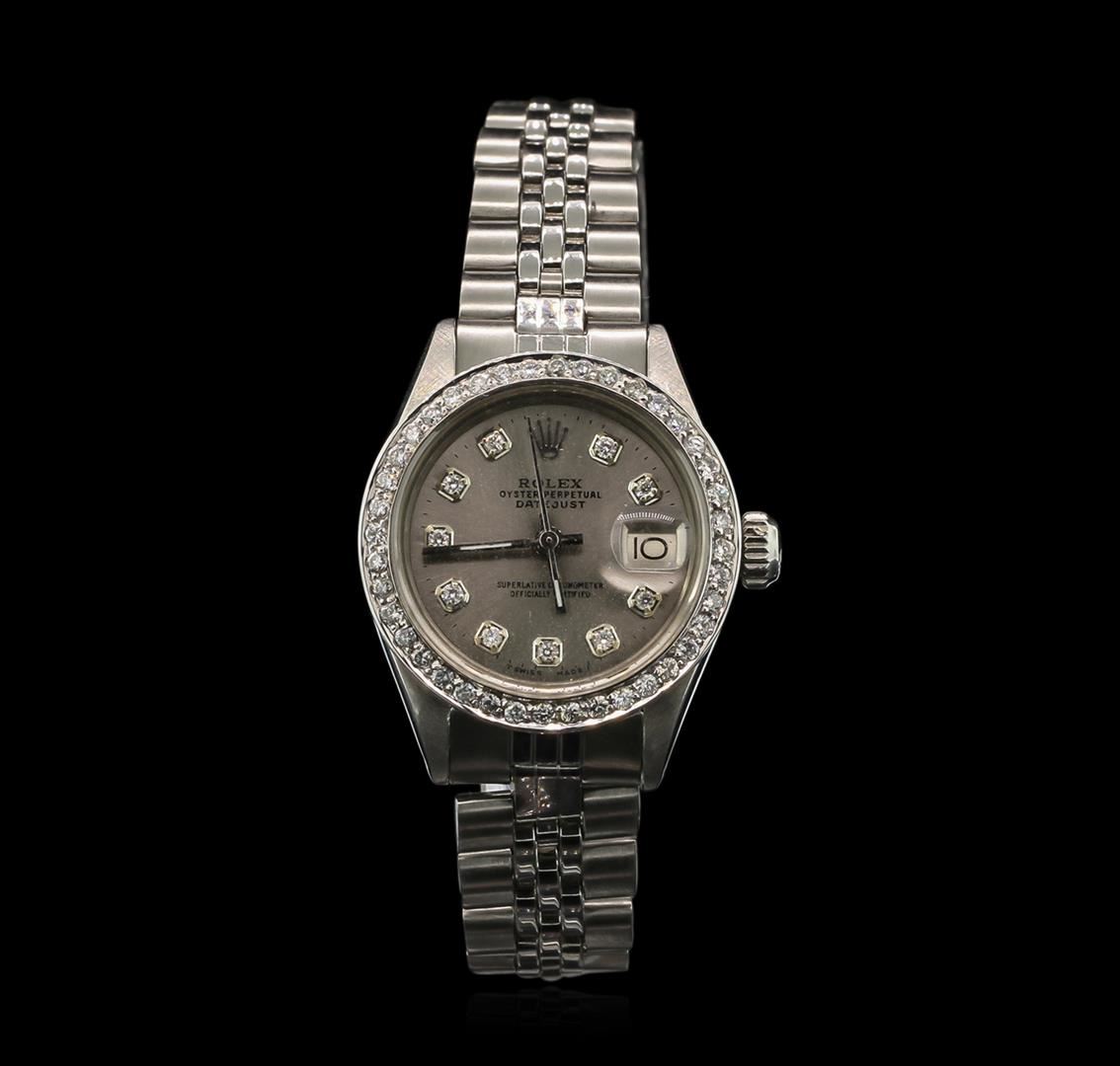 One ladies, hand crafted & machine milled Rolex DateJust Model stainless steel wristwatch electronically tested, Case: 26mm oyster, Crown: twinlock with logo, Custom Bezel: diamond set, Custom Crystal: acrylic cyclops lens, Circa: 1971. Movement: superlative chronometer, Custom Dial: Silvered, with baton hands & diamond markers, Date Window: 3 o'clock position, non-quick set, Condition: G-5 Fine. Bracelet: Stainless steel jubilee. Six and one half inch length, adjustable. Bright polish & satin finish. Standard clasp, with logo. Containing: Forty round brilliant cut diamonds, measuring an average of 1.60mm in diameter, approximate total weight of 40 Stones = 0.55ct. Set & graded in the bezel. Clarity: VS-2 to SI-2. Color: G-H. Total Weight of Diamonds 0.55ct. Total Weight of Watch 43.39 grams. AIG Appraised at $7,050.00.