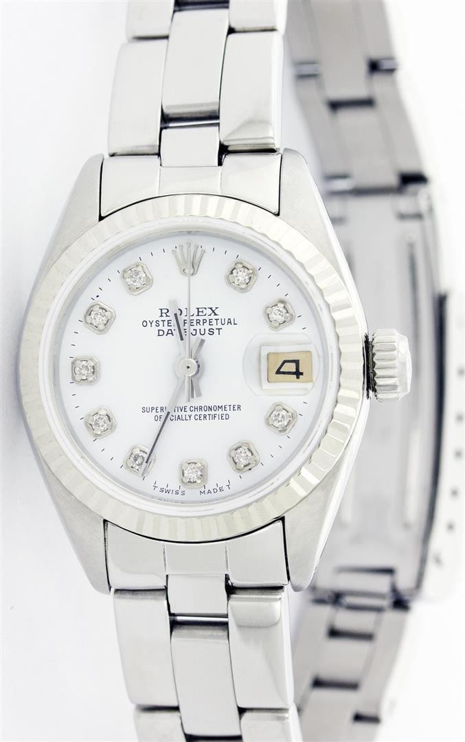 One Ladies Rolex Datejust Polished Bright with Satin Finish, Serviced & Electronically Tested, Stainless Steel Case:26mm, Stainless Steel Crown, Custom Bezel: 14K White Gold Fluted. Custom Crystal: Acrylic Cyclops Lens. Movement: Automatic Winding Movement Caliber 2030. Custom Dial: White Mother Of Pearl With Diamond Hour Markers, Diamond Count: 10 Diamonds, Clarity: SI-VS, Color: G to H. Date Window: 3 O'Clock Position Date Display, Non Quickset, Model: 6917 Condition: G-6 Extra Fine. Bracelet: Stainless Steel Oyster Band. Bright Polish & Satin Finish. 5.5 Inch Length, Adjustable. Standard Clasp, With Rolex Logo.