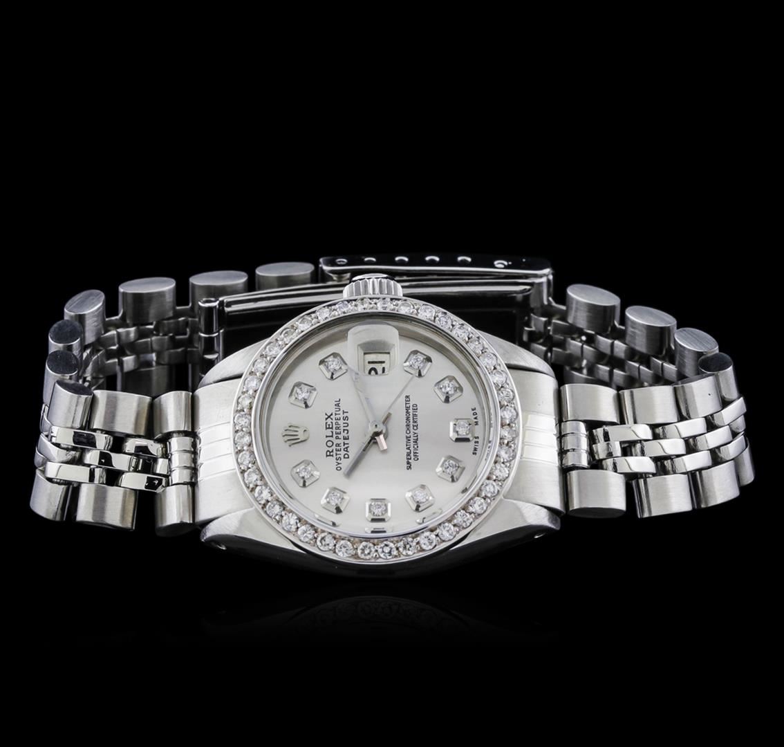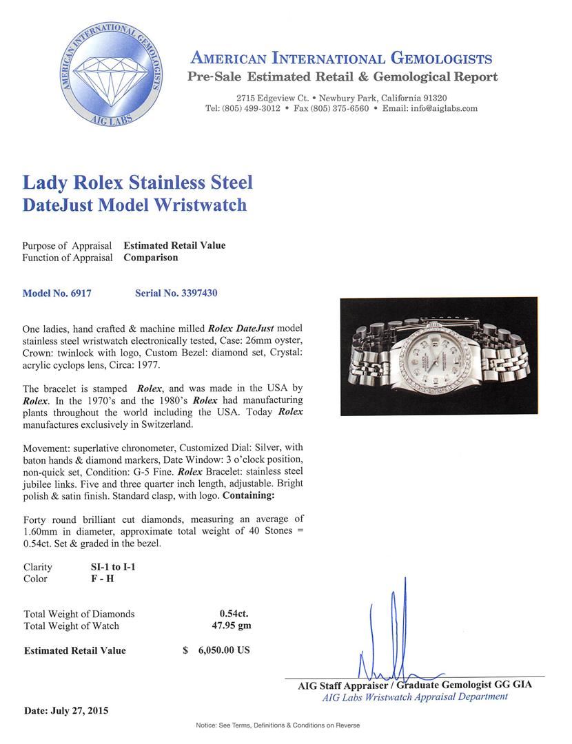 One ladies, hand crafted & machine milled Rolex DateJust model stainless steel wristwatch electronically tested, Case: 26mm oyster, Crown: twinlock with logo, Custom Bezel: diamond set, Crystal: acrylic cyclops lens, Circa: 1977. The bracelet is stamped Rolex, and was made in the USA by Rolex. In the 1970's and the 1980's Rolex had manufacturing plants throughout the world including the USA. Today Rolex manufactures exclusively in Switzerland. Movement: superlative chronometer, Customized Dial: Silver, with baton hands & diamond markers, Date Window: 3 o'clock position, non-quick set, Condition: G-5 Fine. Rolex Bracelet: stainless steel jubilee links. Five and three quarter inch length, adjustable. Bright polish & satin finish. Standard clasp, with logo. Containing: Forty round brilliant cut diamonds, measuring an average of 1.60mm in diameter, approximate total weight of 40 Stones = 0.54ct. Set & graded in the bezel. Clarity: SI-1 to I-1. Color: F - H. Total Weight of Diamonds 0.54ct. Total Weight of Watch 47.95gm. AIG Appraised at $6,050.00.