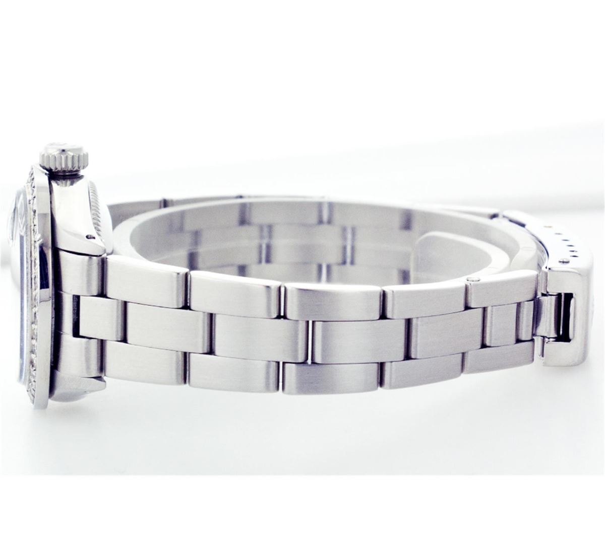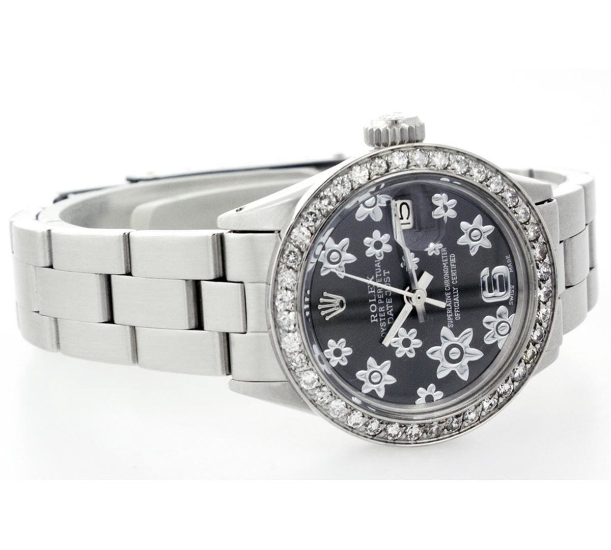 One Ladies Rolex Datejust Polished Bright with Satin Finish, Serviced & Electronically Tested, Stainless Steel Case:26mm, Stainless Steel Crown, Custom Bezel: 18K White Gold Beadset Diamond Bezel, Diamond Count: 32 Diamonds Total Weight .70 Carat, Clarity: SI-VS, Color: G to H. Custom Crystal: Synthetic Sapphire Cyclops Lens. Movement: Automatic Winding Movement Caliber 2030. Custom Dial: Grey Floral With Arabic Hour Markers. Date Window: 3 O'Clock Position Date Display, Non Quickset, Model: 6917 Condition: G-6 Extra Fine. Bracelet: Stainless Steel Oyster. Bright Polish & Satin Finish. 5.5 Inch Length, Adjustable. Standard Clasp, With Rolex Logo.