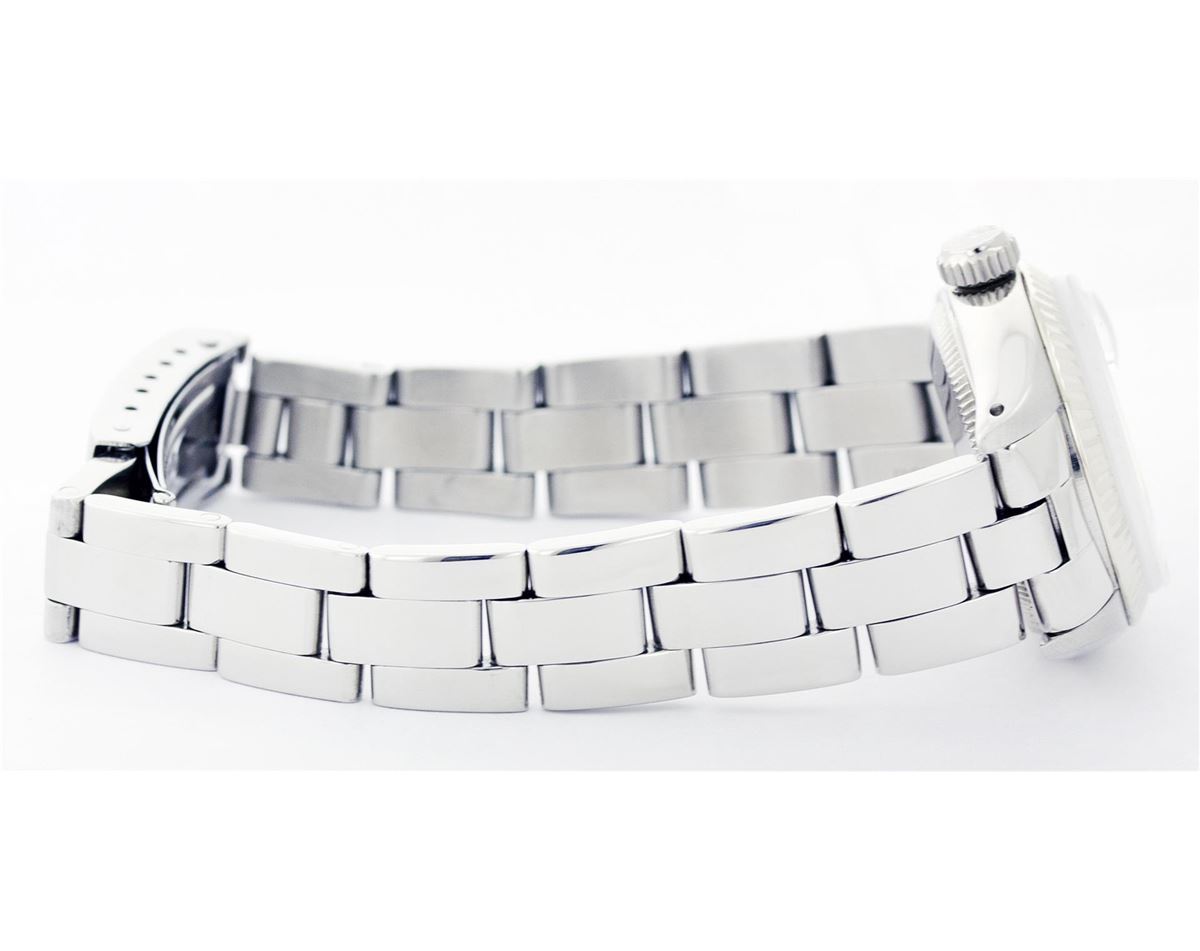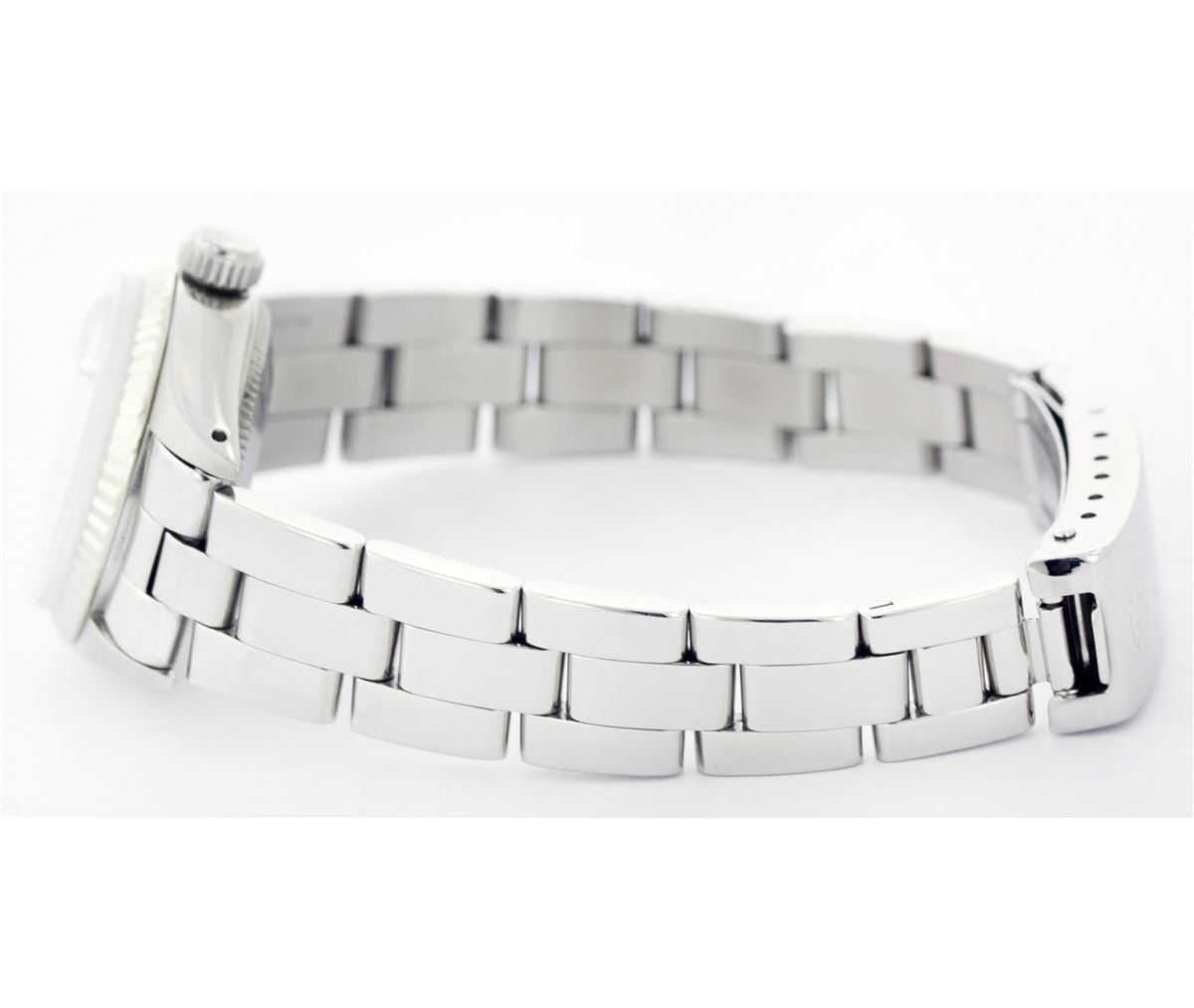 One Ladies Rolex Datejust Polished Bright with Satin Finish, Serviced & Electronically Tested, Stainless Steel Case:26mm, Stainless Steel Crown, Custom Bezel: 14K White Gold Fluted. Custom Crystal: Acrylic Cyclops Lens. Movement: Automatic Winding Movement Caliber 2030. Custom Dial: White Mother Of Pearl With Diamond Hour Markers, Diamond Count: 10 Diamonds, Clarity: SI-VS, Color: G to H. Date Window: 3 O'Clock Position Date Display, Non Quickset, Model: 6917 Condition: G-6 Extra Fine. Bracelet: Stainless Steel Oyster Band. Bright Polish & Satin Finish. 5.5 Inch Length, Adjustable. Standard Clasp, With Rolex Logo.