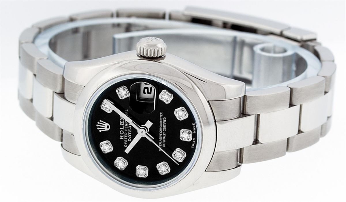 One Ladies Rolex Datejust Polished Bright with Satin Finish, Serviced & Electronically Tested, Stainless Steel Case:26mm, Stainless Steel Crown, Bezel: Stainless Steel Bezel. Custom Crystal: Synthetic Sapphire Cyclops Lens. Movement: Automatic Winding Movement Caliber 2235. Custom Dial: Refinished Black Diamond VVS, Diamond Count: 10 Diamonds in Dial G To H In Color, Clarity: VVS. Date Window: 3 O'Clock Position Date Display, Model: No Hole Quickset Datejust 179160. Condition: G-6 Extra Fine. Bracelet: Stainless Steel Oyster. Bright Polish & Satin Finish. 6.0 Inch Length, Adjustable. Standard Clasp, With Rolex Logo. Comes with 6 month warranty.