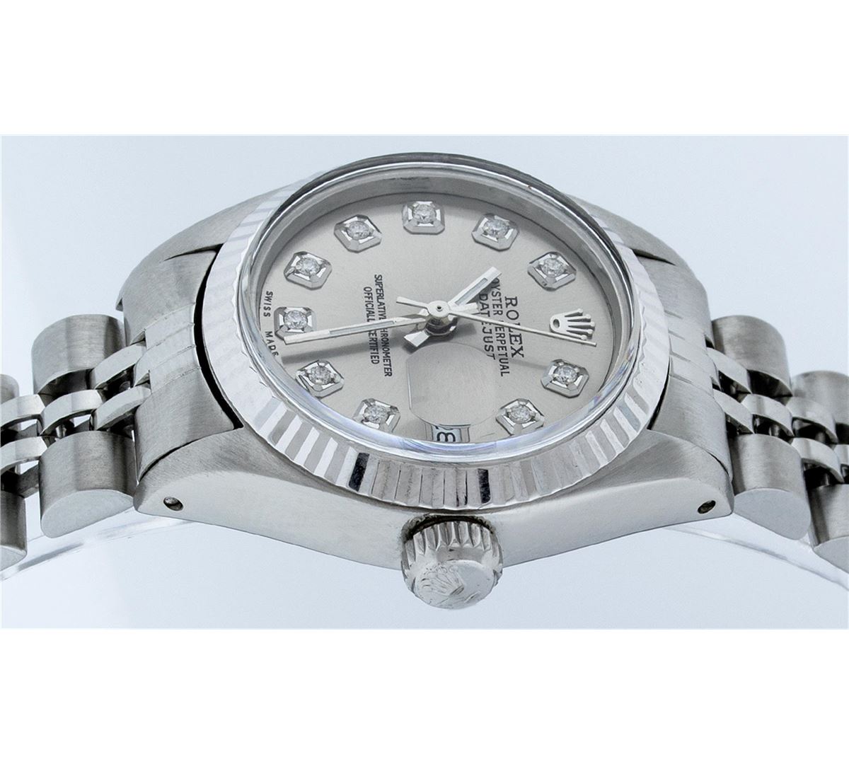 One Ladies Rolex Datejust Polished Bright with Satin Finish, Serviced & Electronically Tested, Stainless Steel Case:26mm, Stainless Steel Crown, Bezel: 14K White Gold Fluted. Custom Crystal: Acrylic Cyclops Lens. Movement: Automatic Winding Movement Caliber 2030. Custom Dial: Slate Grey With Diamond Hour Markers, Diamond Count: 10 Diamonds, Clarity: SI-VS, Color: G to H. Date Window: 3 O'Clock Position Date Display, Model: Datejust. Condition: G-6 Extra Fine. Bracelet: Stainless Steel Jubilee Band. Bright Polish & Satin Finish. 6.0 Inch Length, Adjustable. Standard Clasp, With Rolex Logo. Comes with 6 month warranty.