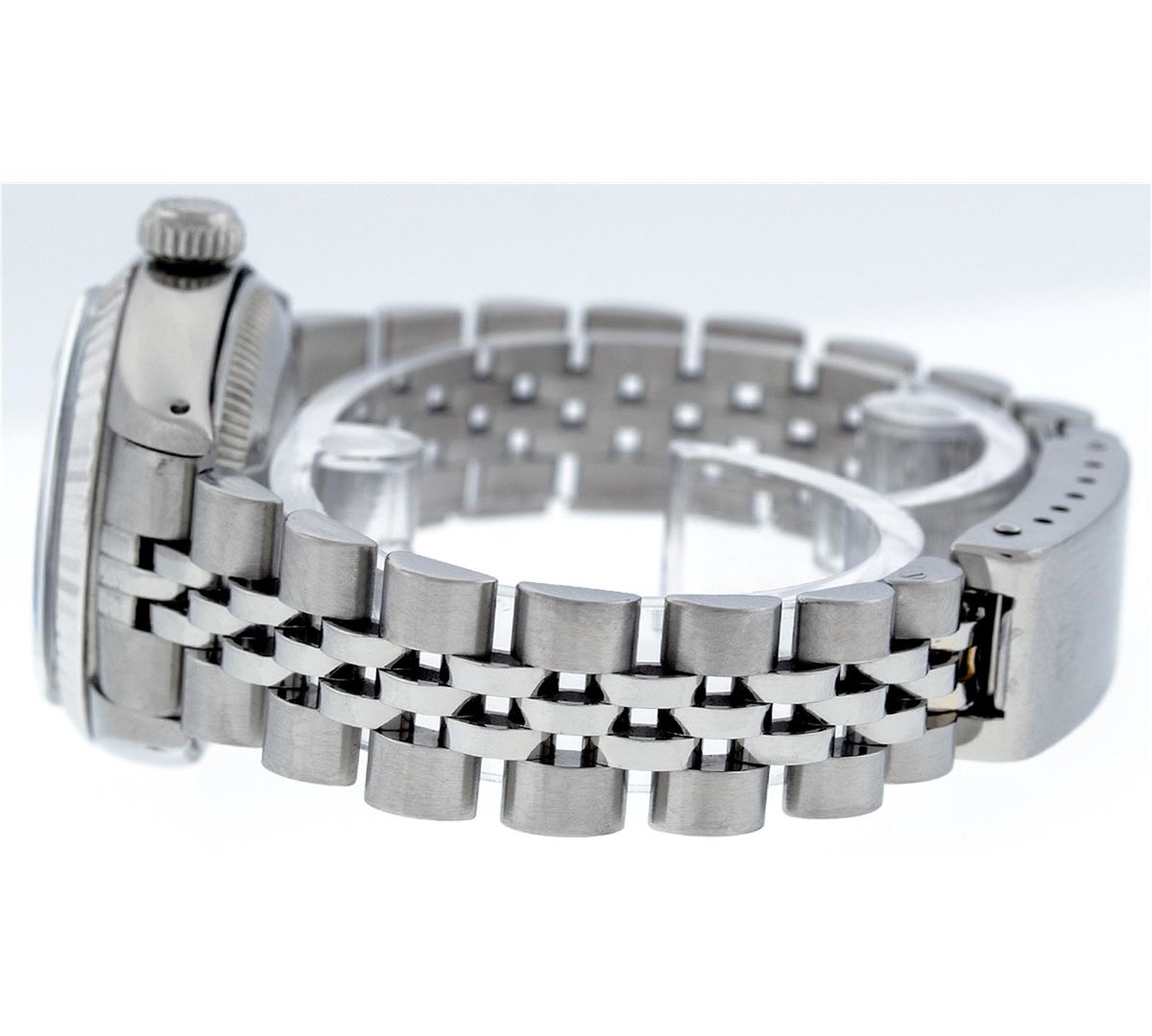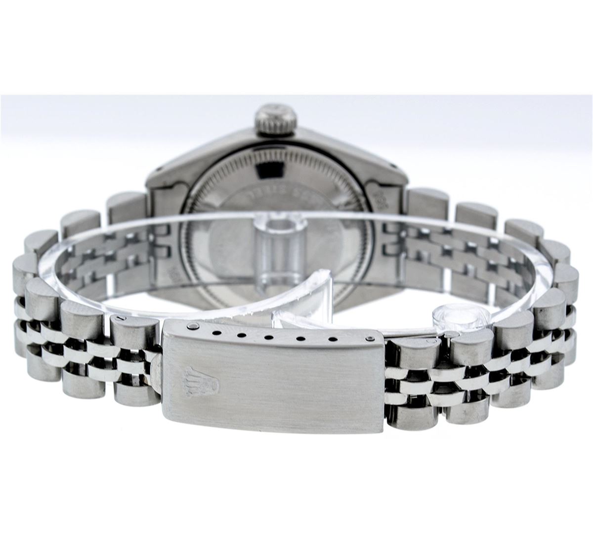 One Ladies Rolex Datejust Polished Bright with Satin Finish, Serviced & Electronically Tested, Stainless Steel Case:26mm, Stainless Steel Crown, Bezel: 14K White Gold Fluted. Custom Crystal: Acrylic Cyclops Lens. Movement: Automatic Winding Movement Caliber 2030. Custom Dial: Slate Grey With Diamond Hour Markers, Diamond Count: 10 Diamonds, Clarity: SI-VS, Color: G to H. Date Window: 3 O'Clock Position Date Display, Model: Datejust. Condition: G-6 Extra Fine. Bracelet: Stainless Steel Jubilee Band. Bright Polish & Satin Finish. 6.0 Inch Length, Adjustable. Standard Clasp, With Rolex Logo. Comes with 6 month warranty.