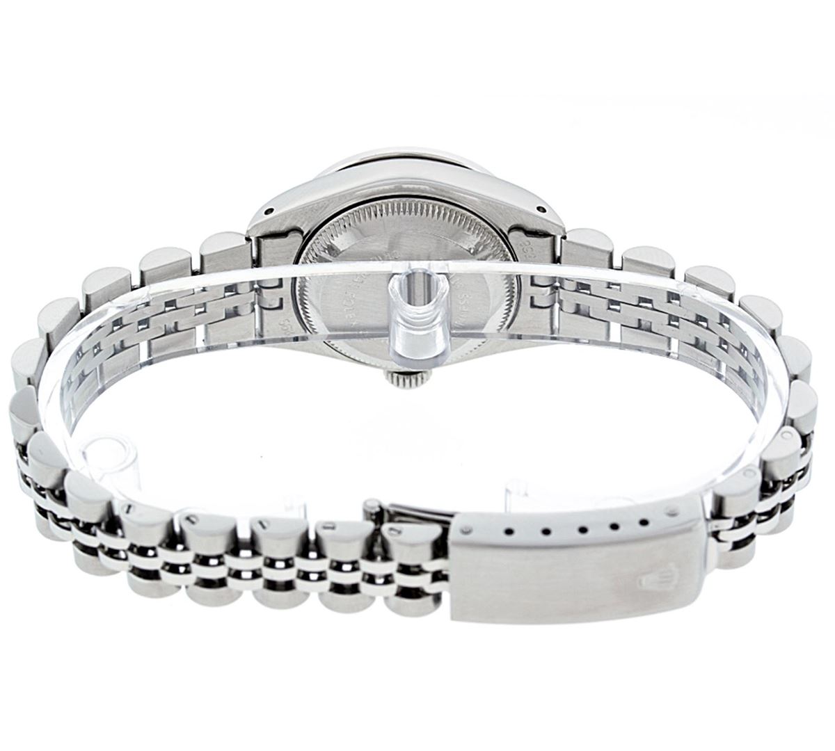 One Ladies Rolex Datejust Polished Bright with Satin Finish, Serviced & Electronically Tested, Stainless Steel Case:26mm, Stainless Steel Crown, Diamond Lugs: 16 Diamonds On Lugs, Clarity: SI-VS, Color: G to H. Custom Bezel: 18K White Gold Beadset Bezel, Diamond Count: 32 Diamonds, Total Weight 1.00 Carat, Clarity: SI-VS, Color: G to H. Custom Crystal: Synthetic Sapphire Cyclops Lens. Movement: Automatic Winding Movement Caliber 2030. Custom Dial: Refinished Slate Grey String With Diamond Dial, 43 Diamonds in Dial G To H In Color, Clarity: VVS. Date Window: 3 O'Clock Position Date Display, Model: Datejust Condition: G-6 Extra Fine. Bracelet: Stainless Steel Jubilee. Bright Polish & Satin Finish. 6.0 Inch Length, Adjustable. Standard Clasp, With Rolex Logo. Comes with 6 month warranty.