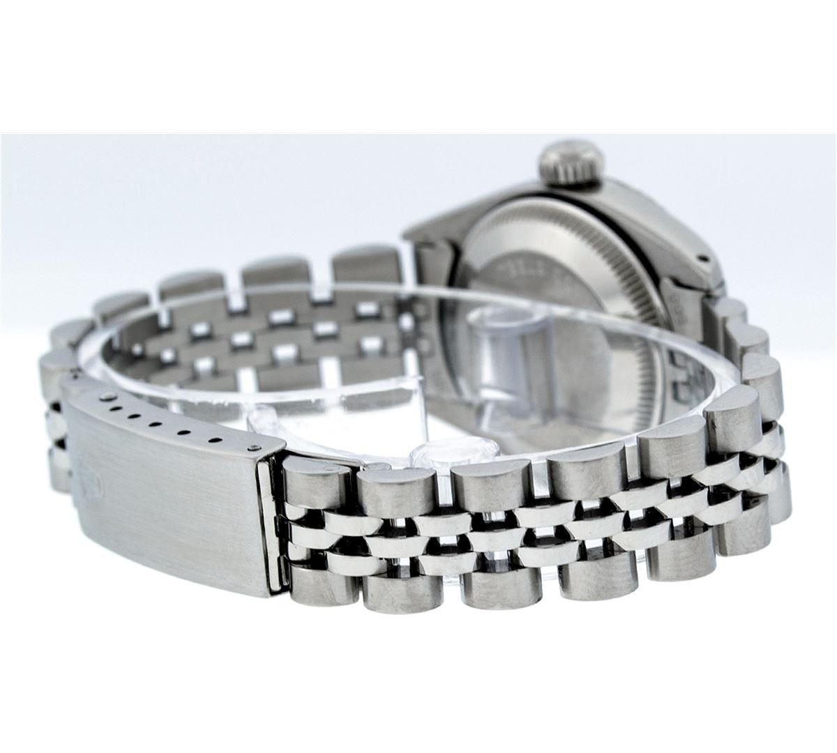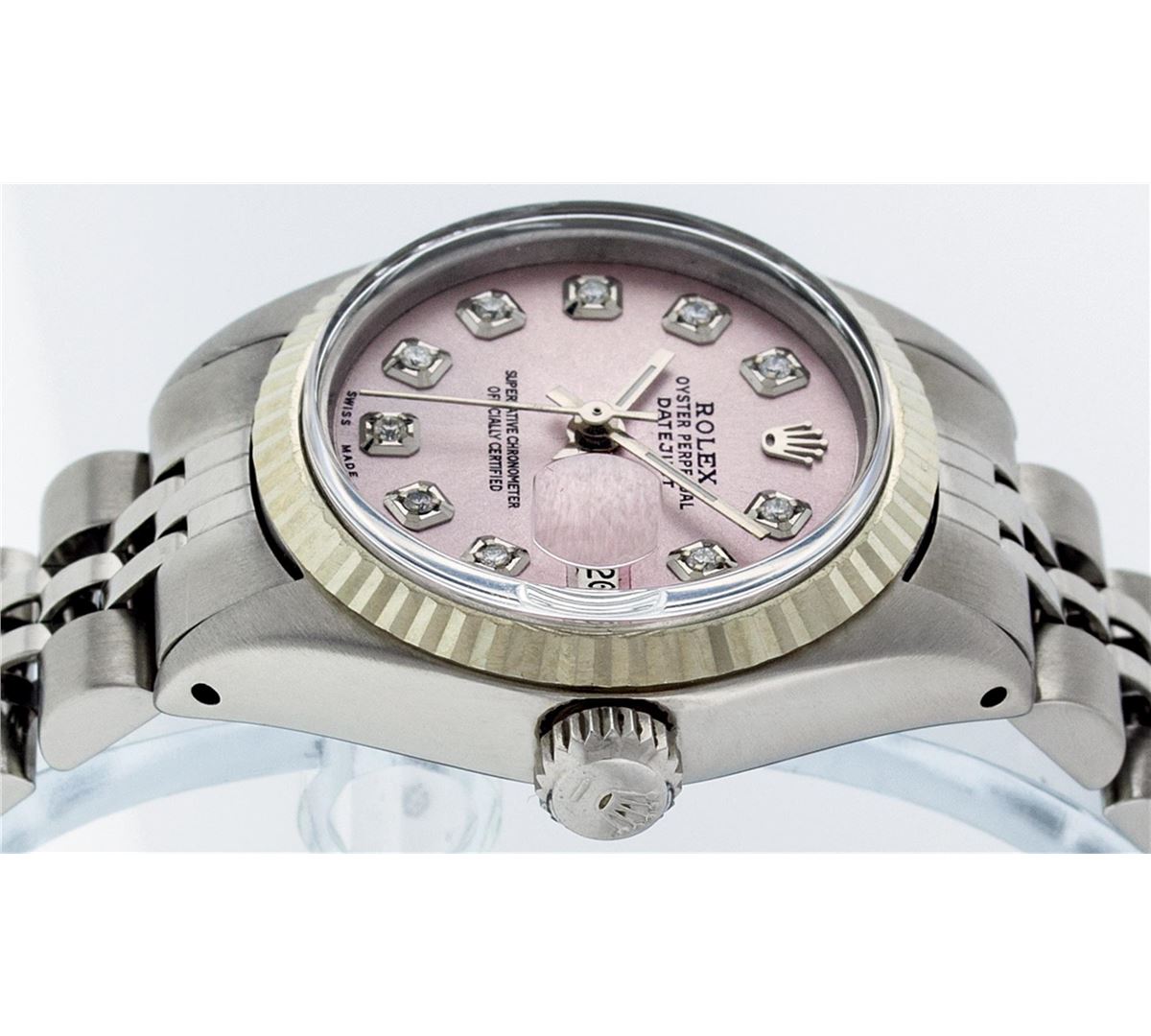 One Ladies Rolex Datejust Polished Bright with Satin Finish, Serviced & Electronically Tested, Stainless Steel Case:26mm, Stainless Steel Crown, Bezel: 14K Fluted Bezel. Custom Crystal: Acrylic Cyclops Lens. Movement: Automatic Winding Movement Caliber 2030. Dial: Ice Pink Diamond Dial. Diamond Count: 10 Diamonds In Dial, Color: G to H, Clarity: SI-VS. Date Window: 3 O'Clock Position Date Display, Model: Datejust. Condition: G-6 Extra Fine. Bracelet: Stainless Steel Jubilee Band. Bright Polish & Satin Finish. 6.0 Inch Length, Adjustable. Standard Clasp, With Rolex Logo. Comes with 6 month warranty.