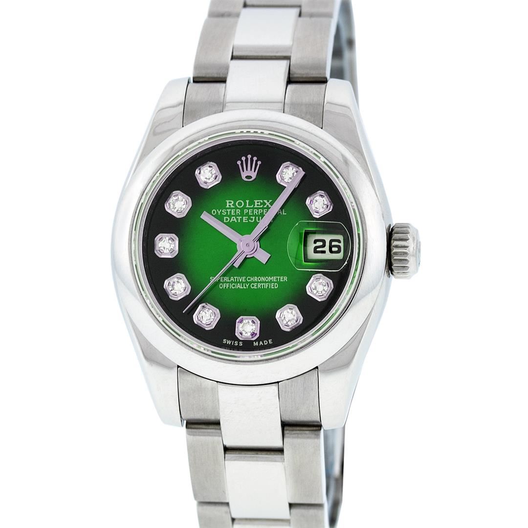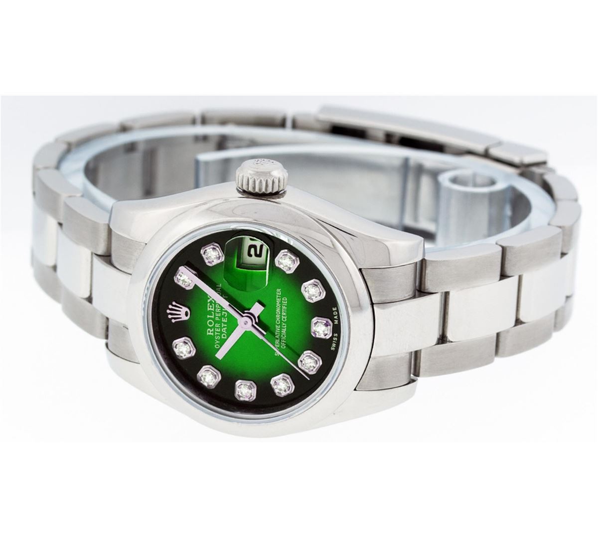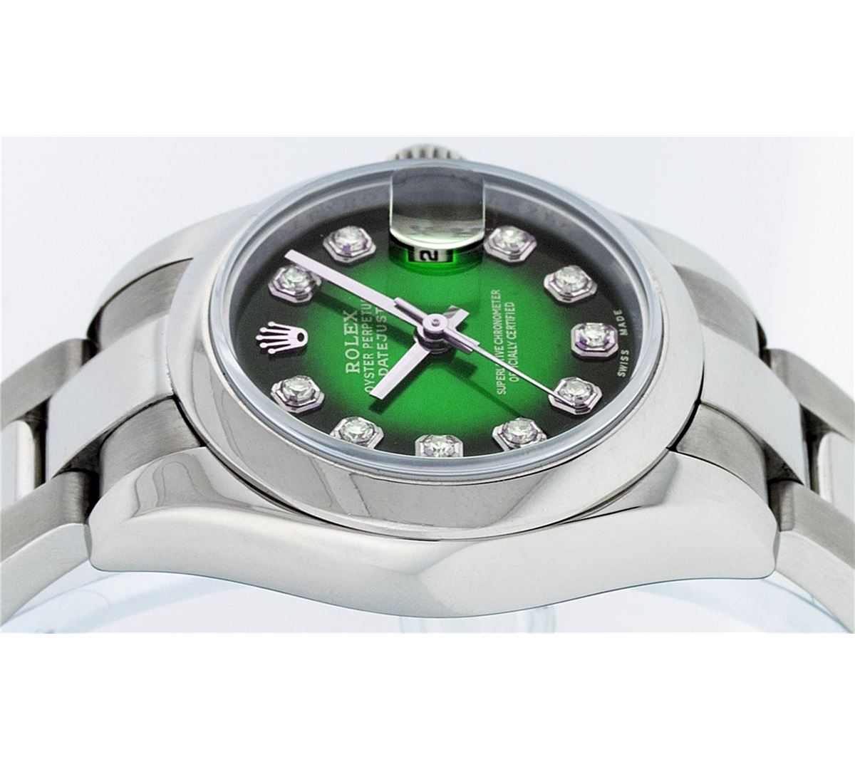 One Ladies Rolex Datejust Polished Bright with Satin Finish, Serviced & Electronically Tested, Stainless Steel Case:26mm, Stainless Steel Crown, Bezel: Stainless Steel Bezel. Custom Crystal: Synthetic Sapphire Cyclops Lens. Movement: Automatic Winding Movement Caliber 2235. Custom Dial: Refinished Green Vignette Diamond VVS, Diamond Count: 10 Diamonds in Dial G To H In Color, Clarity: VVS. Date Window: 3 O'Clock Position Date Display, Model: No Hole Datejust 179160. Condition: G-6 Extra Fine. Bracelet: Stainless Steel Oyster. Bright Polish & Satin Finish. 6.0 Inch Length, Adjustable. Standard Clasp, With Rolex Logo. Comes with 6 month warranty.