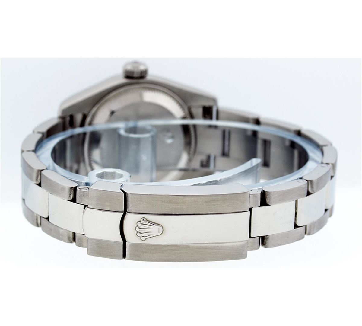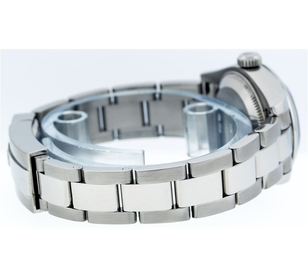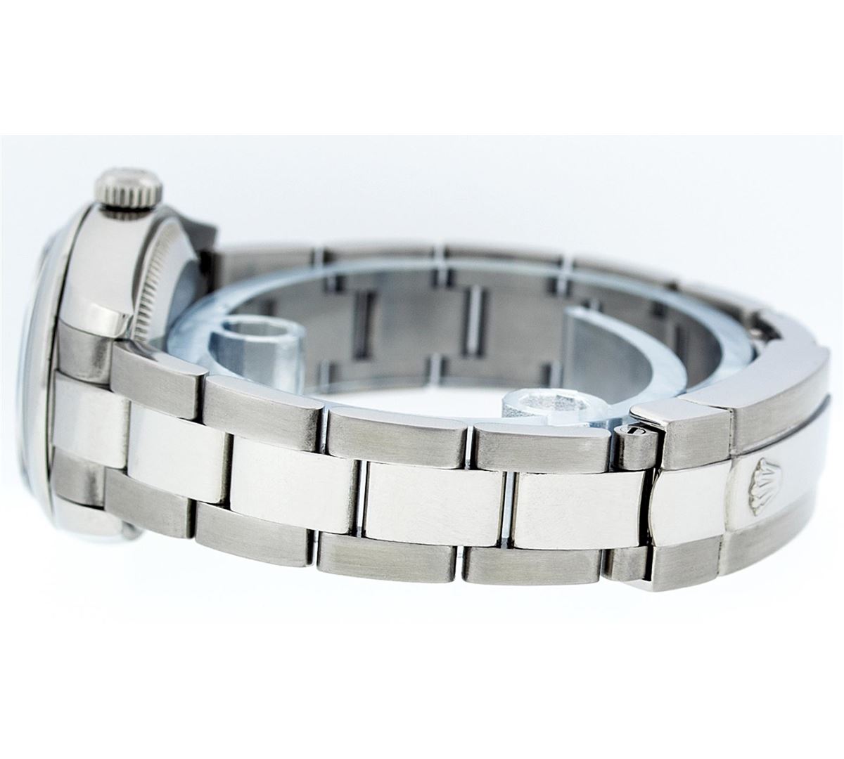 One Ladies Rolex Datejust Polished Bright with Satin Finish, Serviced & Electronically Tested, Stainless Steel Case:26mm, Stainless Steel Crown, Bezel: Stainless Steel Bezel. Custom Crystal: Synthetic Sapphire Cyclops Lens. Movement: Automatic Winding Movement Caliber 2235. Custom Dial: Refinished Green Vignette Diamond VVS, Diamond Count: 10 Diamonds in Dial G To H In Color, Clarity: VVS. Date Window: 3 O'Clock Position Date Display, Model: No Hole Datejust 179160. Condition: G-6 Extra Fine. Bracelet: Stainless Steel Oyster. Bright Polish & Satin Finish. 6.0 Inch Length, Adjustable. Standard Clasp, With Rolex Logo. Comes with 6 month warranty.