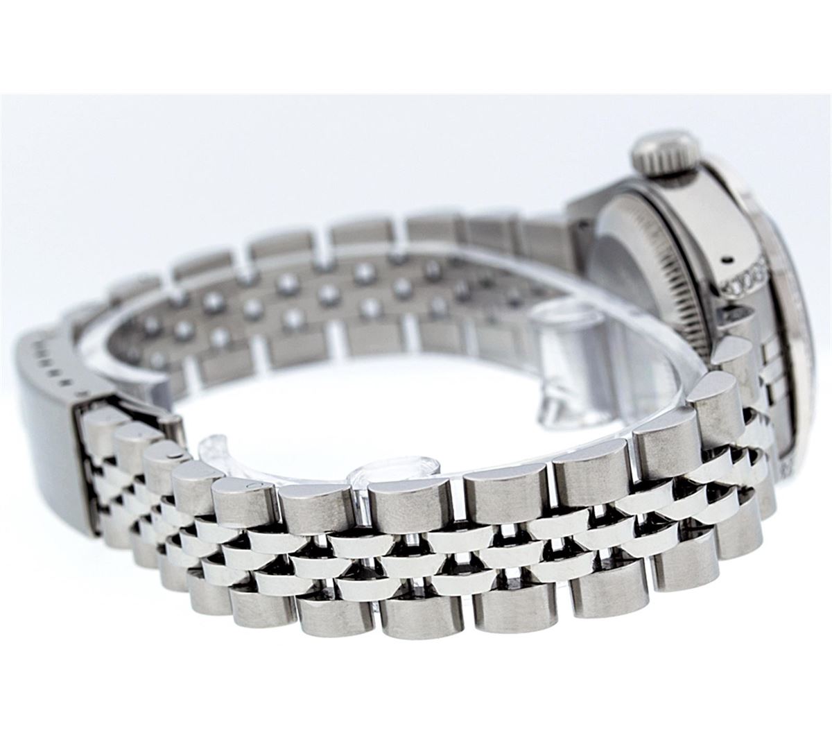 One Ladies Rolex Datejust Polished Bright with Satin Finish, Serviced & Electronically Tested, Stainless Steel Case:26mm, Stainless Steel Crown, Diamond Lugs: 16 Diamonds On Lugs, Clarity: SI-VS, Color: G to H. Custom Bezel: 18K White Gold Beadset Bezel, Diamond Count: 32 Diamonds, Total Weight 1.00 Carat, Clarity: SI-VS, Color: G to H. Custom Crystal: Synthetic Sapphire Cyclops Lens. Movement: Automatic Winding Movement Caliber 2030. Custom Dial: Refinished Purple String With Diamond Dial, 43 Diamonds in Dial G To H In Color, Clarity: VVS. Date Window: 3 O'Clock Position Date Display, Model: Datejust Condition: G-6 Extra Fine. Bracelet: Stainless Steel Jubilee. Bright Polish & Satin Finish. 6.0 Inch Length, Adjustable. Standard Clasp, With Rolex Logo. Comes with 6 month warranty.