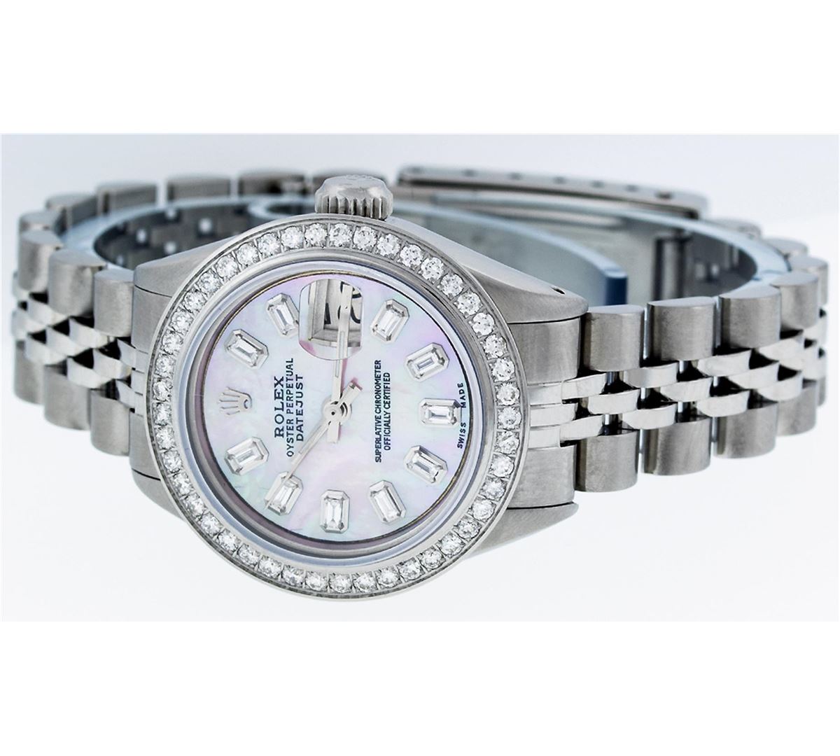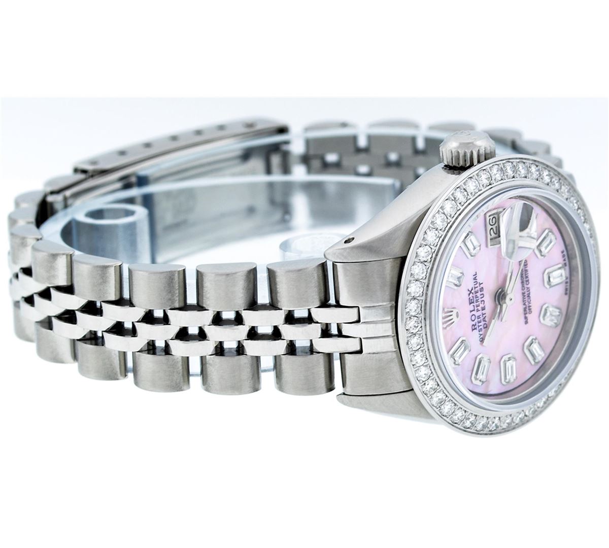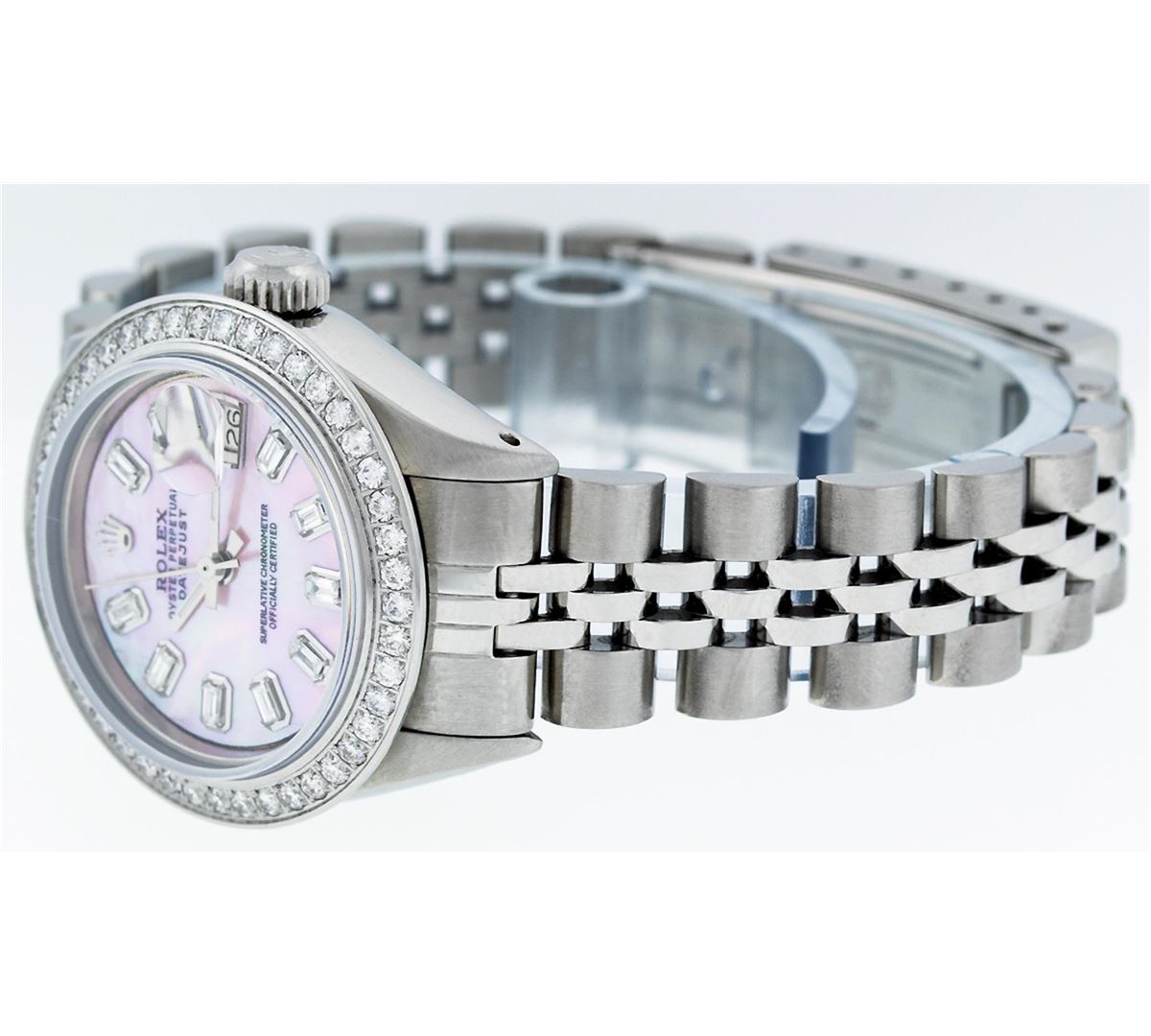 One Ladies Rolex Datejust Polished Bright with Satin Finish, Serviced & Electronically Tested, Stainless Steel Case:26mm, Stainless Steel Crown, Custom Bezel: Stainless Steel Beadset Diamond Bezel, Diamond Count: 44 Diamonds Total Weight 1.00 Carat, Clarity: SI-VS, Color: G to H. Custom Crystal: Synthetic Sapphire Cyclops Lens. Movement: Automatic Winding Movement Caliber 2030. Custom Dial: Refinished Pink Mother Of Pearl With Baguette Diamond Hour Markers, Diamond Count: 10 Baguette Diamonds in Dial G To H In Color, Clarity: SI-VS. Date Window: 3 O'Clock Position Date Display, Non Quickset, Model: Datejust. Condition: G-6 Extra Fine. Bracelet: Stainless Steel Jubilee Band. Bright Polish & Satin Finish. 6.0 Inch Length, Adjustable. Standard Clasp, With Rolex Logo.