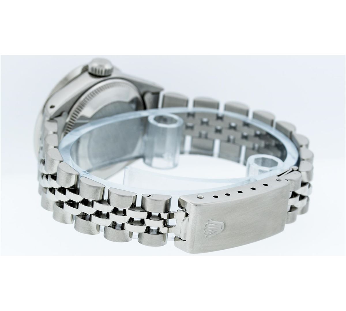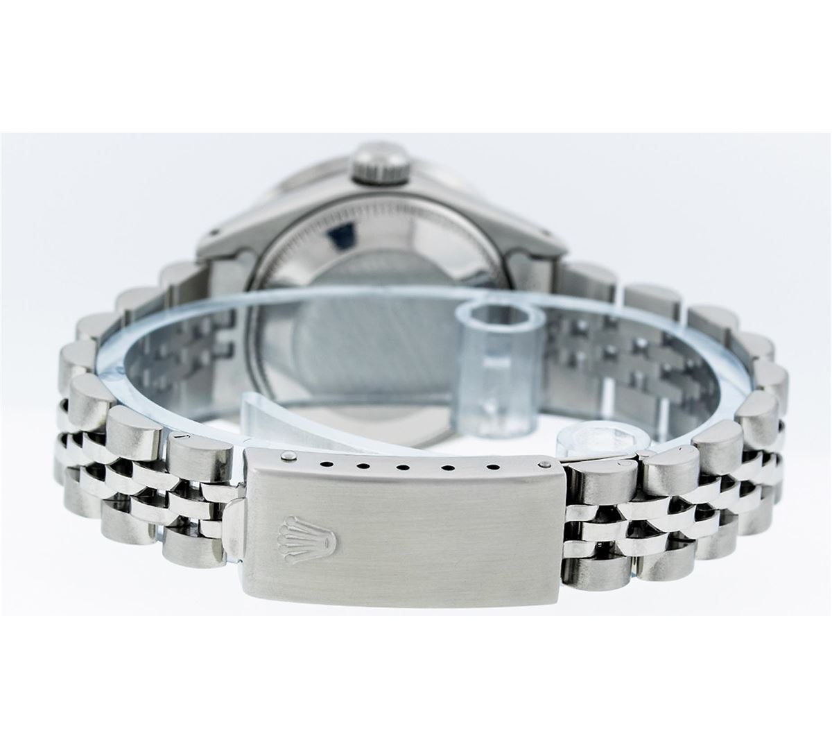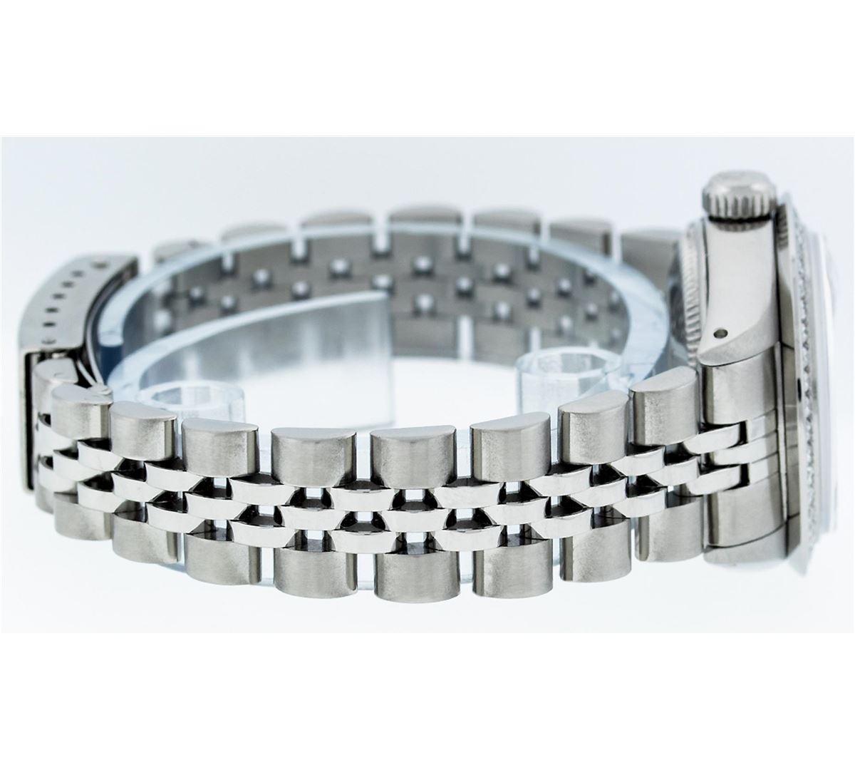One Ladies Rolex Datejust Polished Bright with Satin Finish, Serviced & Electronically Tested, Stainless Steel Case:26mm, Stainless Steel Crown, Custom Bezel: Stainless Steel Beadset Diamond Bezel, Diamond Count: 44 Diamonds Total Weight 1.00 Carat, Clarity: SI-VS, Color: G to H. Custom Crystal: Synthetic Sapphire Cyclops Lens. Movement: Automatic Winding Movement Caliber 2030. Custom Dial: Refinished Pink Mother Of Pearl With Baguette Diamond Hour Markers, Diamond Count: 10 Baguette Diamonds in Dial G To H In Color, Clarity: SI-VS. Date Window: 3 O'Clock Position Date Display, Non Quickset, Model: Datejust. Condition: G-6 Extra Fine. Bracelet: Stainless Steel Jubilee Band. Bright Polish & Satin Finish. 6.0 Inch Length, Adjustable. Standard Clasp, With Rolex Logo.