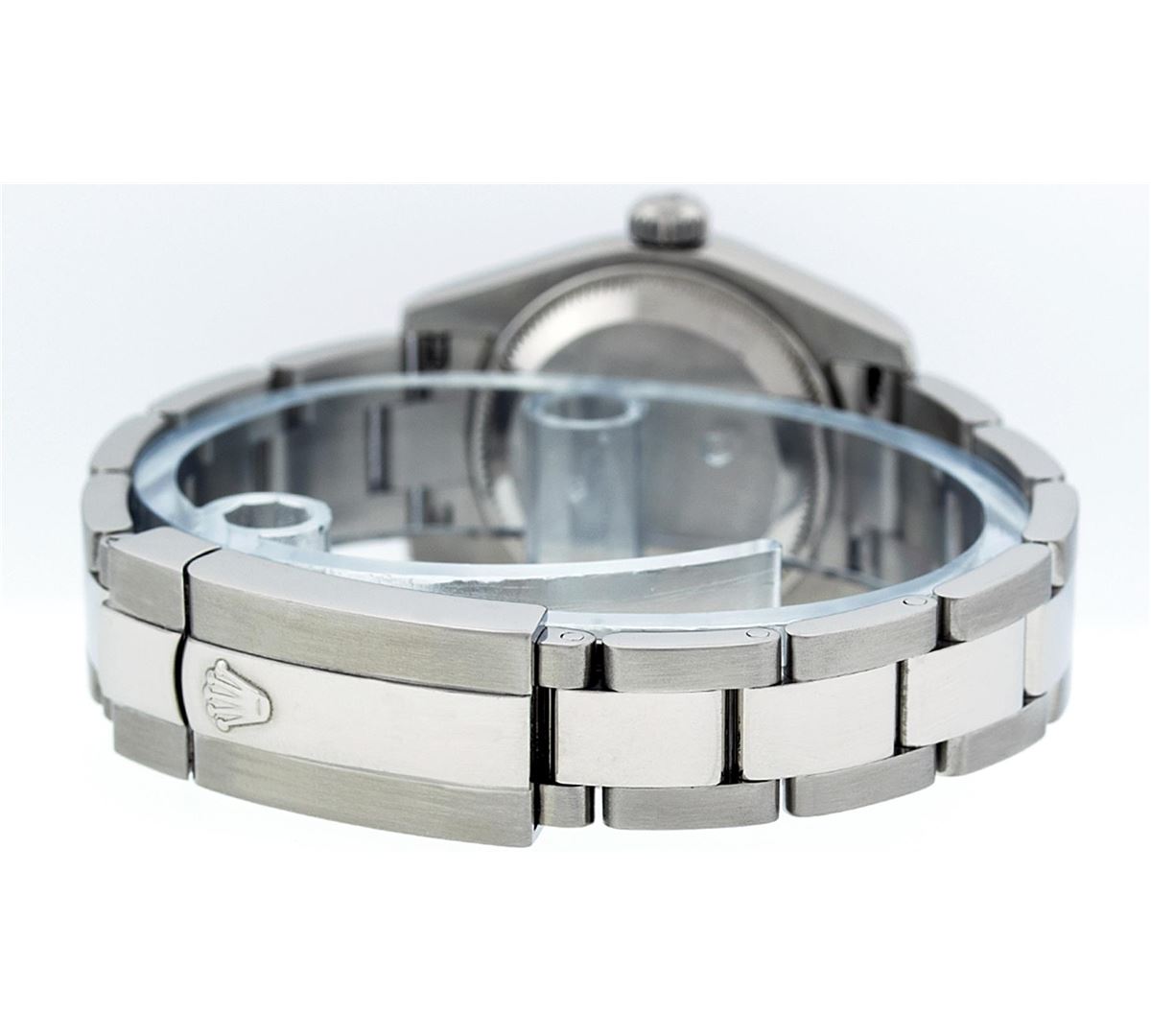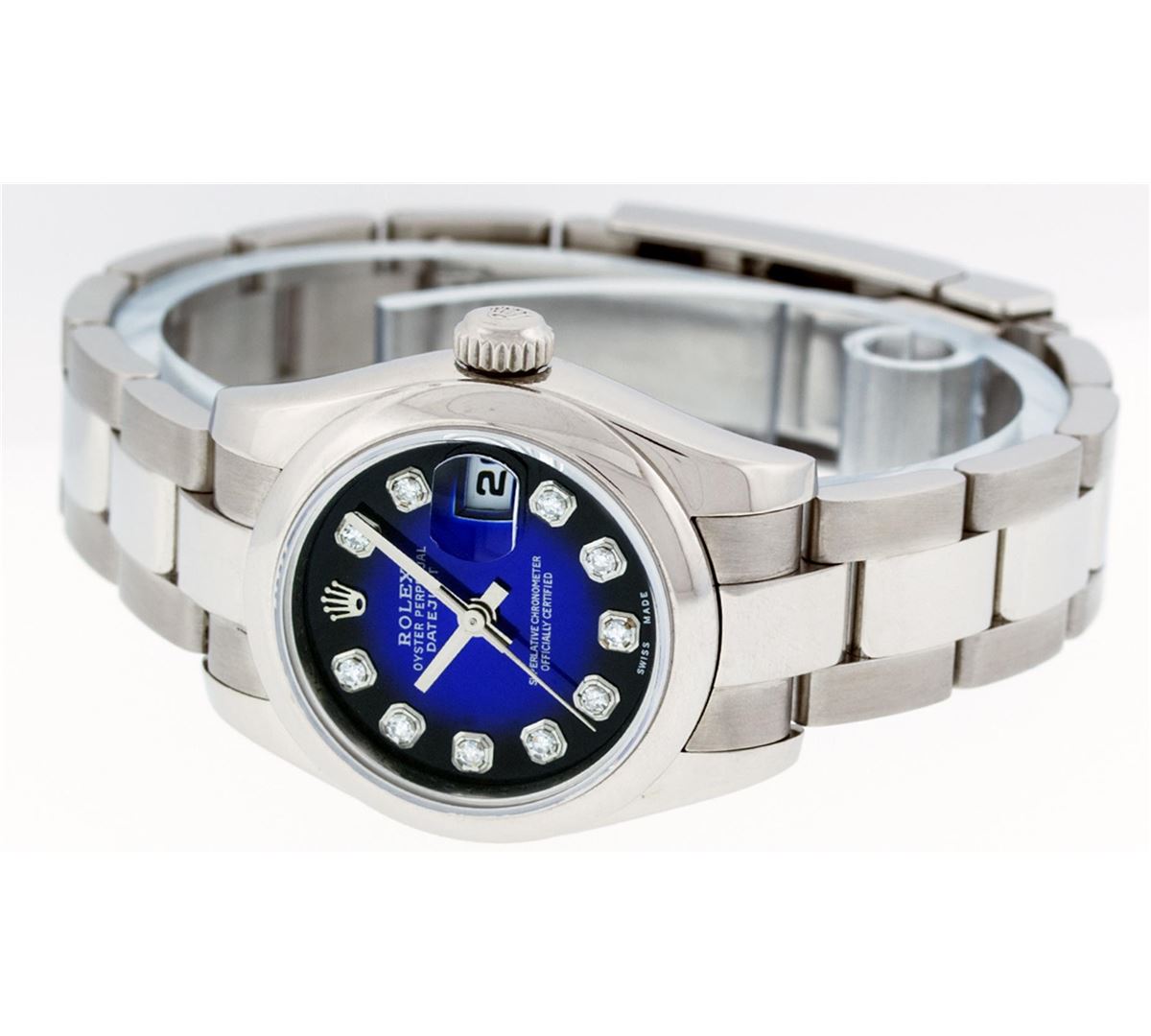 One Ladies Rolex Datejust Polished Bright with Satin Finish, Serviced & Electronically Tested, Stainless Steel Case:26mm, Stainless Steel Crown, Bezel: Stainless Steel Bezel. Custom Crystal: Synthetic Sapphire Cyclops Lens. Movement: Automatic Winding Movement Caliber 2235. Custom Dial: Refinished Blue Vignette Diamond VVS, Diamond Count: 10 Diamonds in Dial G To H In Color, Clarity: VVS. Date Window: 3 O'Clock Position Date Display, Model: No Hole Datejust 179160. Condition: G-6 Extra Fine. Bracelet: Stainless Steel Oyster. Bright Polish & Satin Finish. 6.0 Inch Length, Adjustable. Standard Clasp, With Rolex Logo. Comes with 6 month warranty.
