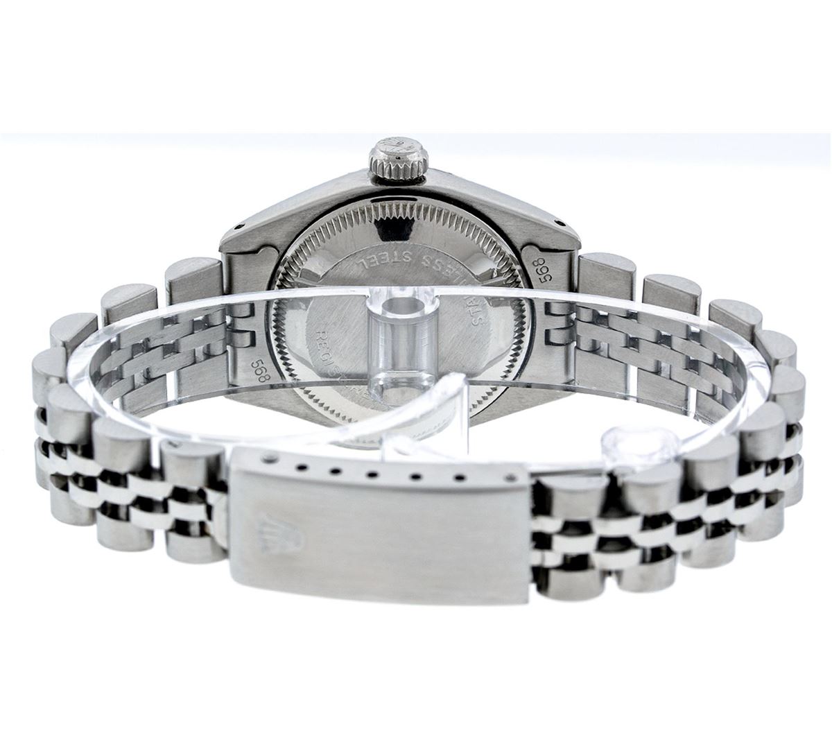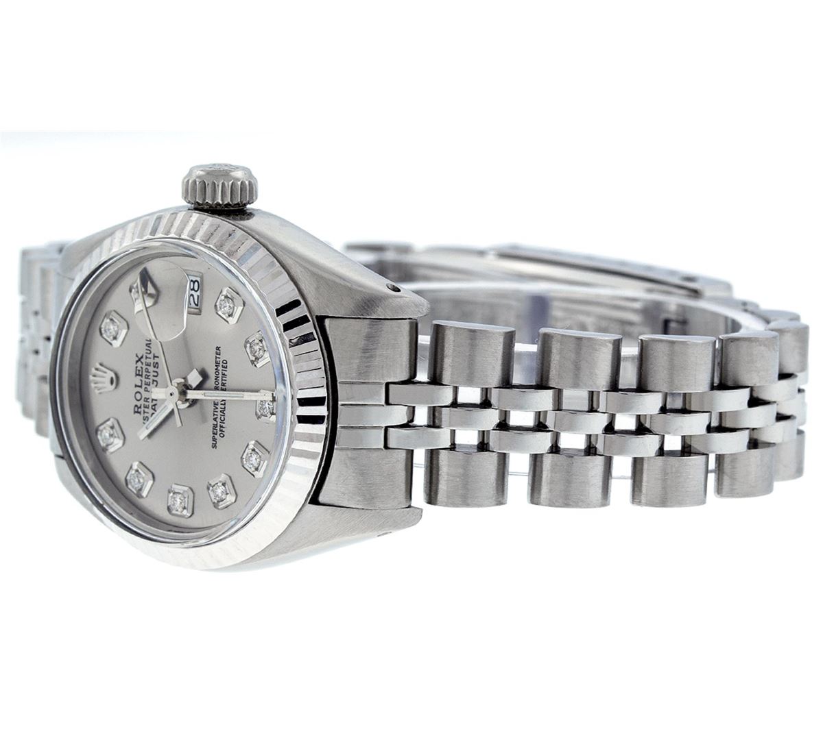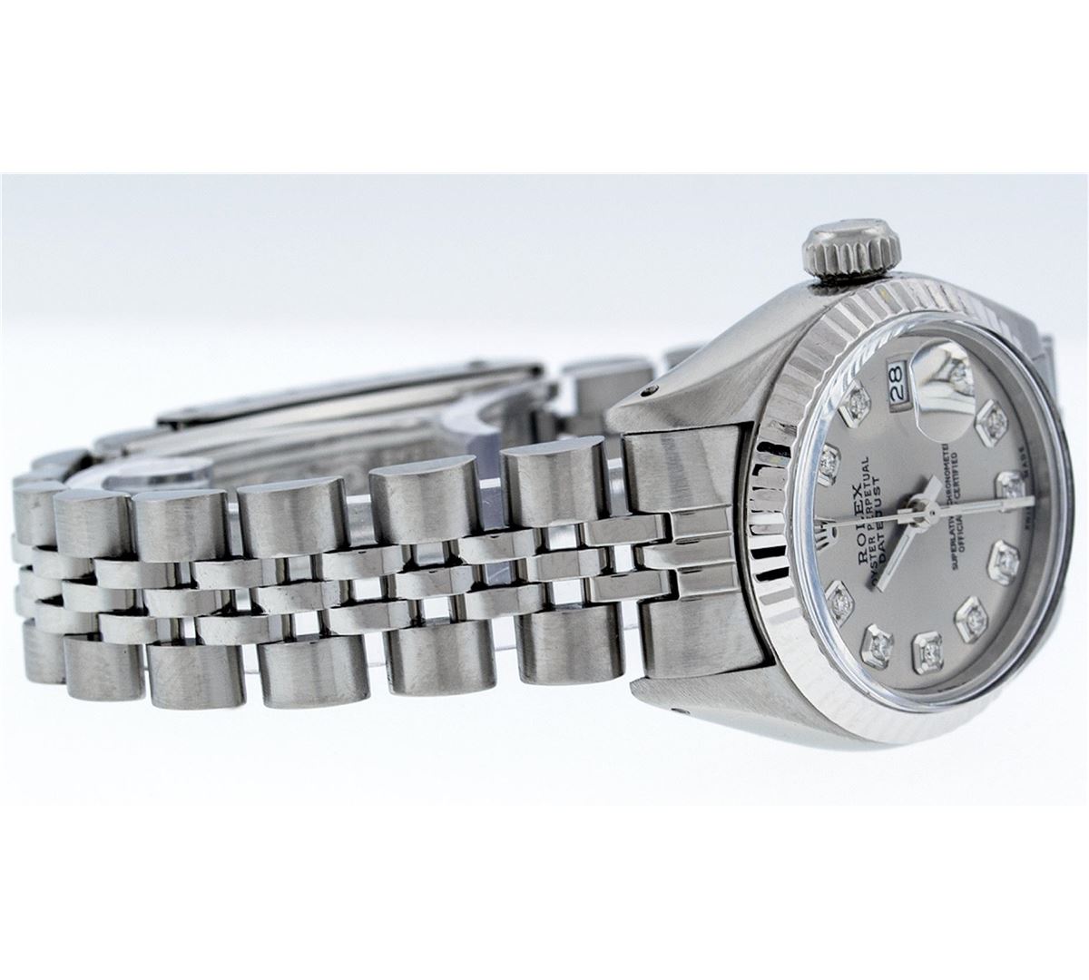 One Ladies Rolex Datejust Polished Bright with Satin Finish, Serviced & Electronically Tested, Stainless Steel Case:26mm, Stainless Steel Crown, Bezel: 14K White Gold Fluted. Custom Crystal: Acrylic Cyclops Lens. Movement: Automatic Winding Movement Caliber 2030. Custom Dial: Slate Grey With Diamond Hour Markers, Diamond Count: 10 Diamonds, Clarity: SI-VS, Color: G to H. Date Window: 3 O'Clock Position Date Display, Model: Datejust. Condition: G-6 Extra Fine. Bracelet: Stainless Steel Jubilee Band. Bright Polish & Satin Finish. 6.0 Inch Length, Adjustable. Standard Clasp, With Rolex Logo. Comes with 6 month warranty.