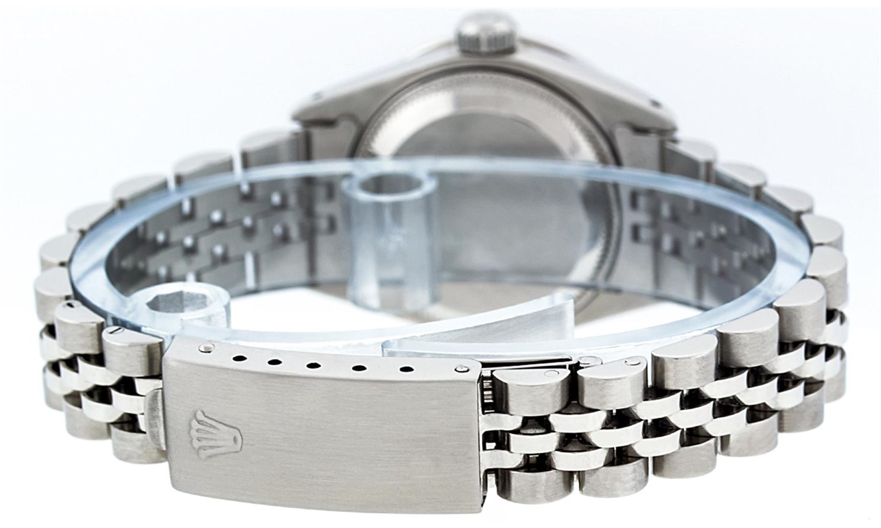 One Ladies Rolex Datejust Polished Bright with Satin Finish, Serviced & Electronically Tested, Stainless Steel Case:26mm, Stainless Steel Crown, Diamond Lugs: 16 Diamonds On Lugs, Clarity: SI-VS, Color: G to H. Custom Bezel: 18K White Gold Sapphire Bezel, Diamond Count: 28 Diamonds + 4 Sapphires, Total Weight 1.00 Carat, Clarity: SI-VS, Color: G to H. Custom Crystal: Synthetic Sapphire Cyclops Lens. Movement: Automatic Winding Movement Caliber 2030. Custom Dial: Refinished Blue MOP With String Diamond Dial, 43 Diamonds in Dial G To H In Color, Clarity: VVS. Date Window: 3 O'Clock Position Date Display, Non Quickset, Model: Datejust. Condition: G-6 Extra Fine. Bracelet: Stainless Steel Jubilee. Bright Polish & Satin Finish. 6.0 Inch Length, Adjustable. Standard Clasp, With Rolex Logo.
