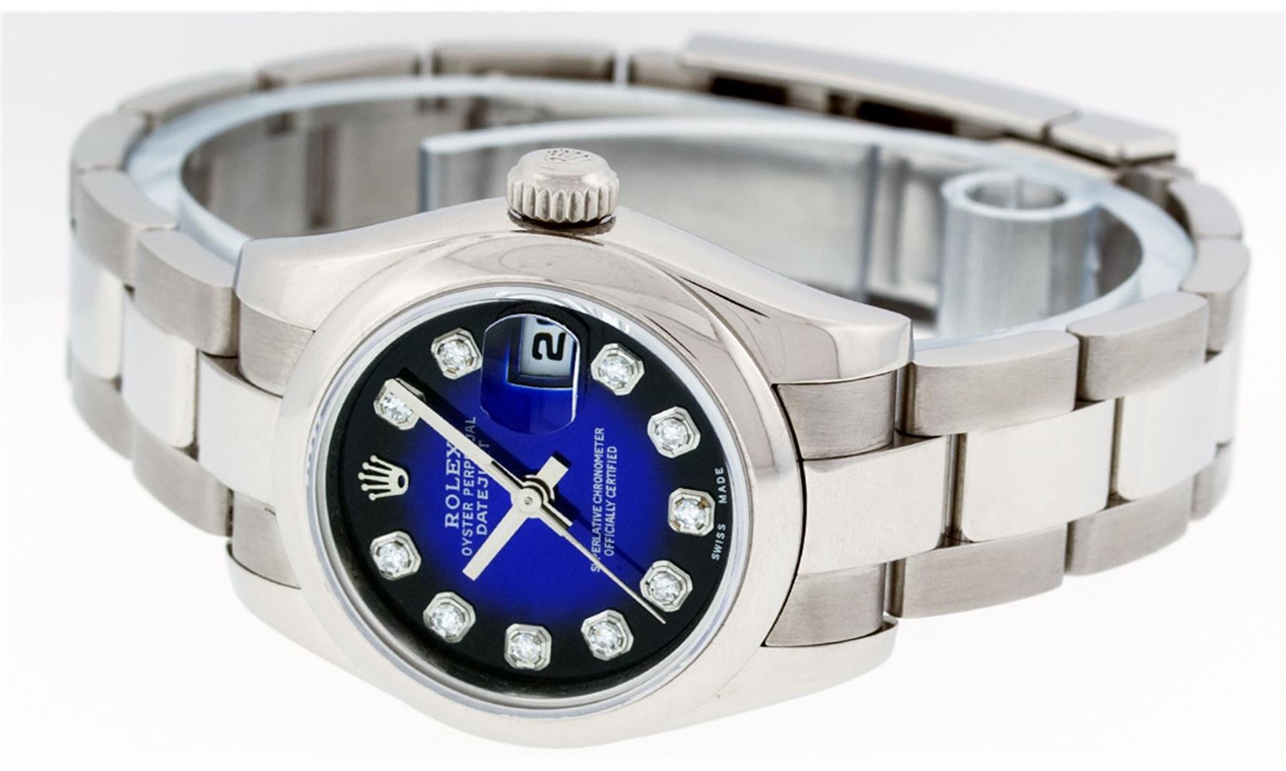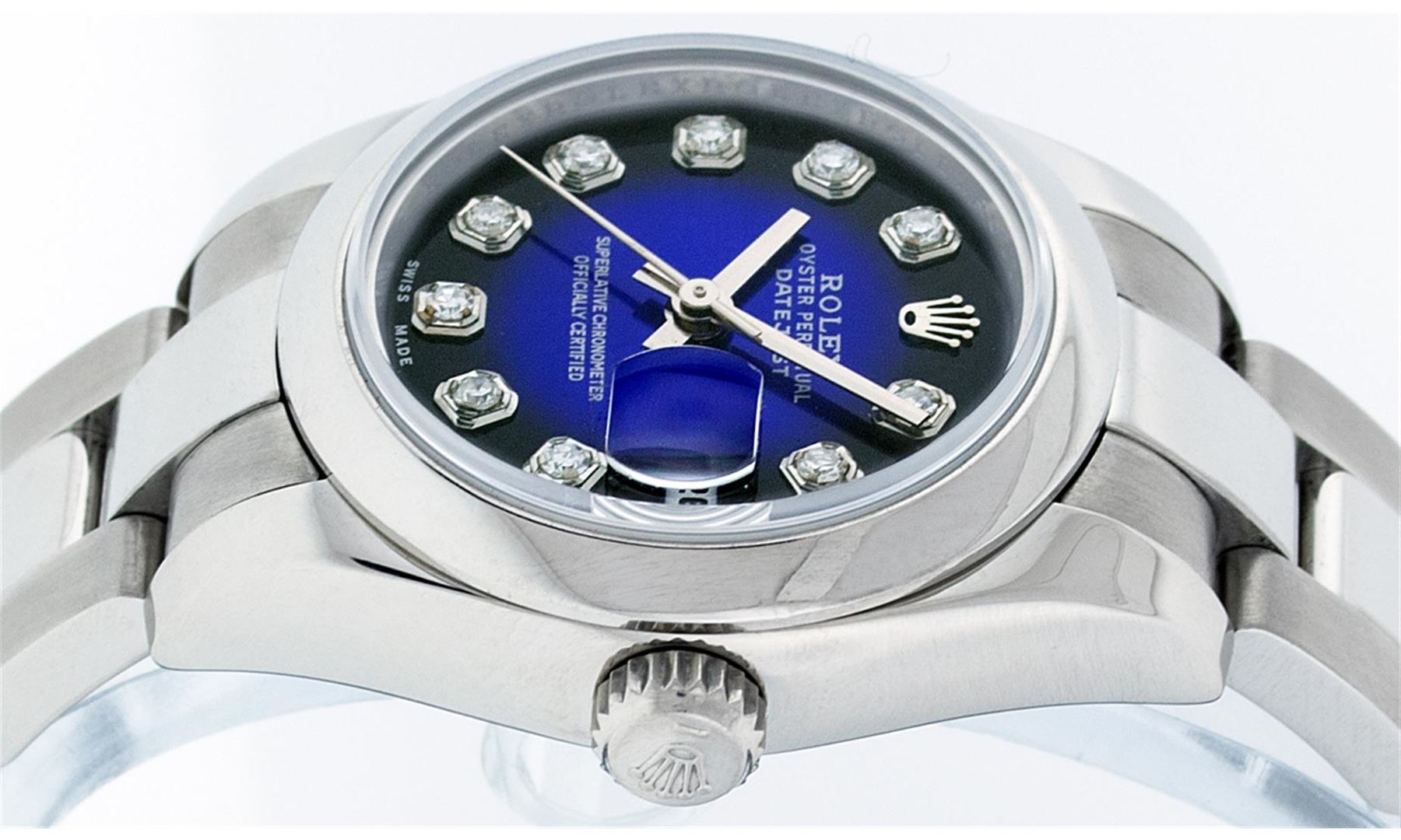 One Ladies Rolex Datejust Polished Bright with Satin Finish, Serviced & Electronically Tested, Stainless Steel Case:26mm, Stainless Steel Crown, Bezel: Stainless Steel Bezel. Custom Crystal: Synthetic Sapphire Cyclops Lens. Movement: Automatic Winding Movement Caliber 2235. Custom Dial: Refinished Blue Vignette Diamond VVS, Diamond Count: 10 Diamonds in Dial G To H In Color, Clarity: VVS. Date Window: 3 O'Clock Position Date Display, Model: No Hole Datejust 179160. Condition: G-6 Extra Fine. Bracelet: Stainless Steel Oyster. Bright Polish & Satin Finish. 6.0 Inch Length, Adjustable. Standard Clasp, With Rolex Logo. Comes with 6 month warranty.